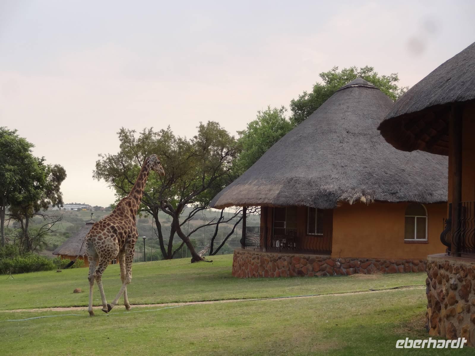 Nach einem zeitigen Frühstück an Bord des Flugzeuges erreichen wir gegen 7.30 Uhr das sonnige Johannesburg. Die Passkontrolle zur Einreise läuft „afrikanisch locker" und nach einer kurzen Wartezeit können wir alle unseren ersten Südafrikanischen Stempel im Reisepass vorweisen und unsere Koffer entgegennehmen, die Vorfreude ein neues Land zu erleben steigt! Am Ausgang werden wir freudig von unserem Reiseleiter Frans, einem 1966 nach Südafrika ausgewanderten Niederländer, begrüßt. Nach dem Geldtausch und dem Verräumen unserer Koffer in den Minibusanhänger verlassen wir den Flughafen und machen uns auf den Weg. Unser erster Stopp nach einer kurzen Autofahrt ist ein Shoppingcenter, das unseren europäischen Standards in nichts nachsteht und wir versorgen uns mit Getränken und Kleinigkeiten für die nächsten Tage. Generell ist die Gruppe positiv überrascht vom ersten Eindruck Südafrikas, außer ein paar Ausnahmen könnte dies hier auch Europa sein! Da wir noch ein wenig Zeit bis zum Check-In in unserer ersten Unterkunft haben, beschließen wir das Weltkulturerbe -Cradle of Mankind- außerhalb der Toren Johannesburgs zu besuchen. Diese Tropfsteinhöhle mitten in der kahlen Landschaft weist verschiedene Fossilfunde auf, die unter anderem belegen, dass das Leben auf der Erde hier in Afrika seinen Ursprung hat. Das wollten wir natürlich erkunden und nach der Besichtigung eines Austellungsraums mit den verschiedensten Fossilfunden, Ausstellungsgegenständen und Erklärungen über die Tropfsteinhöhle ging es, mit unseren schönen Bauhelmen als Kopfbedeckung, unter Tage mit dem schönen Nebeneffekt angenehme 18 Grad Celsius genießen zu können und den warmen Temperaturen an der Oberfläche von gefühlten 30 Grad und mehr zu entfliehen. Unser Guide führte uns in die Dunkelheit und erklärte uns die Entstehung dieser Höhle und die Bedeutung der Fossilfunde. Nach dem ersten abenteuerlichen Erlebnis ging es dann für die Gruppe zu unserer Unterkunft, der Heia Safari Ranch und so langsam merkten wir, dass es hier doch ein wenig anders ist als in Europa, spätestens als wir die freilaufenden Wildtiere im Gelände unserer Übernachtungsmöglichkeit entdeckten, dazu aber gleich mehr. Nachdem wir herzlich begrüßt wurden und unsere kleinen Hütten bezogen erkundeten wir dann individuell die Umgebung. Bei kleinen Spaziergängen wurden wir dann von verschiedensten Tieren überrascht, Gazellen und Springböcke grasten seelenruhig auf den Wiesen und boten die ersten Tier-Fotomotive. Teilweise jagten Antilopen übers Feld, die Zebras tranken aus dem Pool und Giraffen stolzierten von Baum zu Baum für einen kleinen Nachmittagssnack: Afrika, here we are! Nach unserem Abendessen im Restaurant, einem leckeren Buffet mit allerlei Köstlichkeiten ging es dann ziemlich geschafft vom ersten Tag ins Bett mit ungemein viel Vorfreude Südafrika weiter zu entdecken.