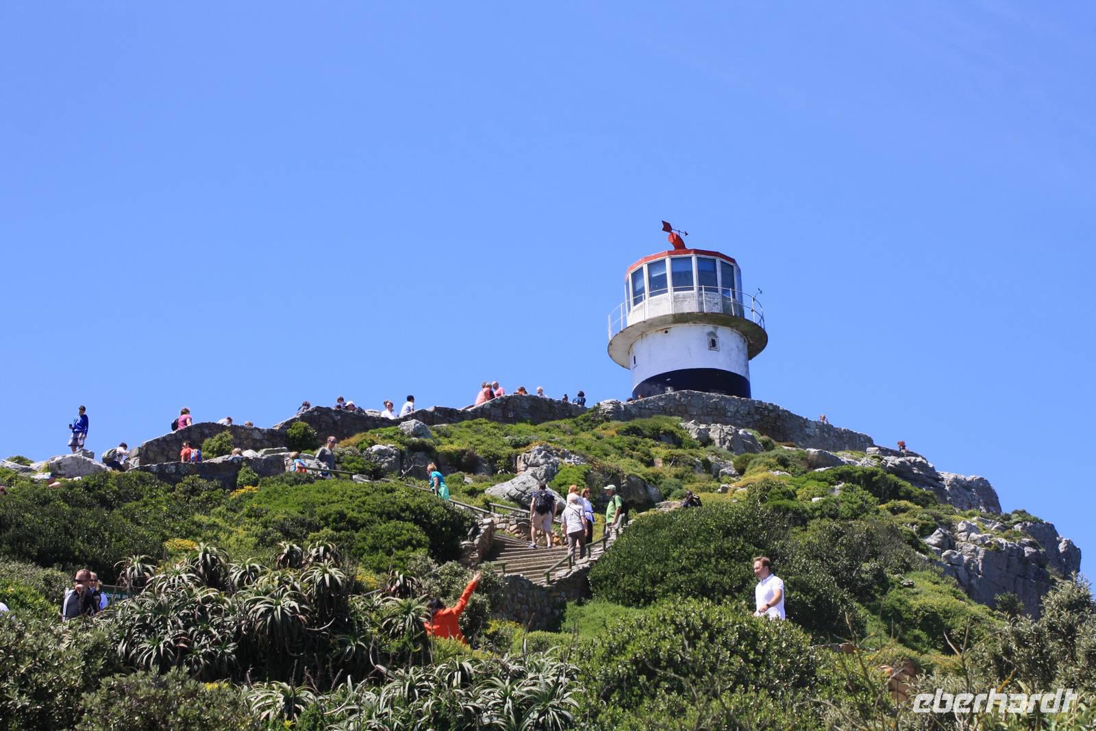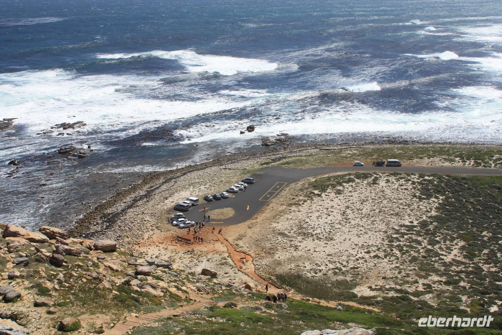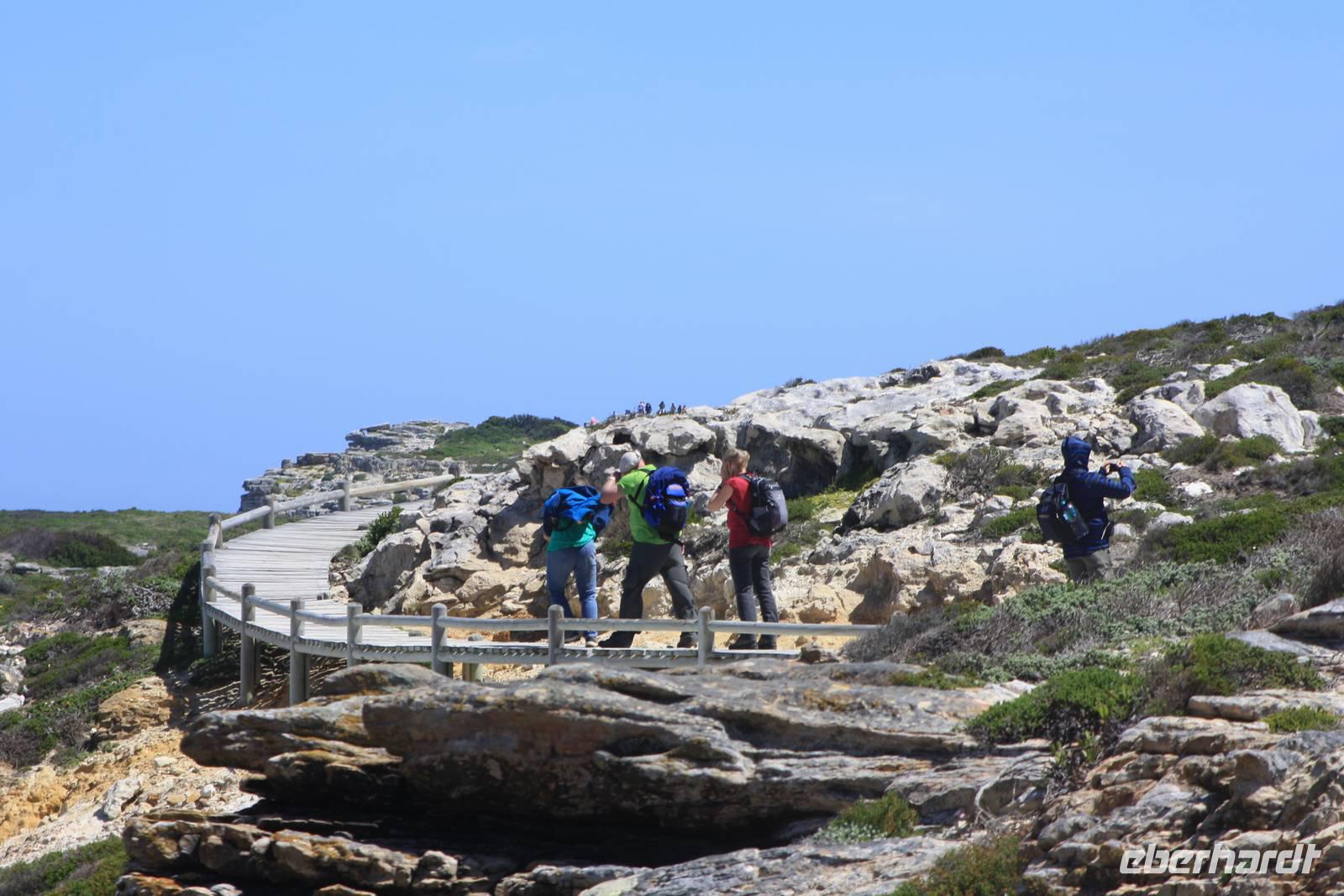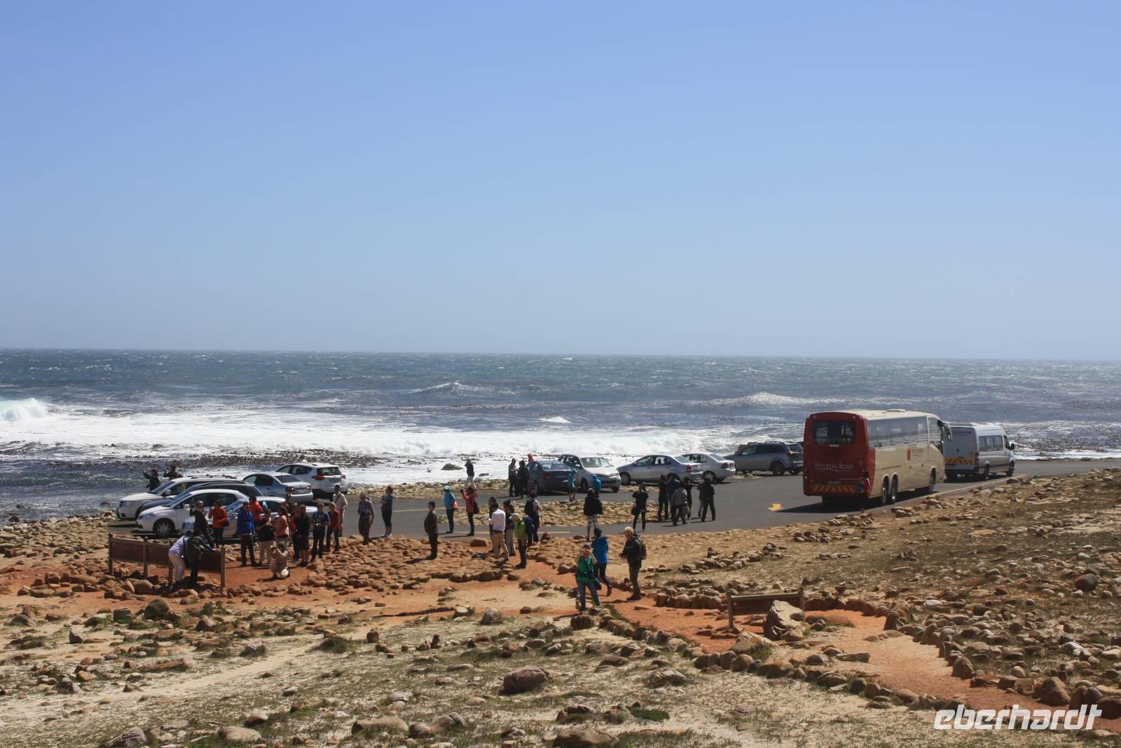 Während des Frühstücks wurde schon einmal die Internetseite des Tafelbergs gecheckt, doch trotz wolkenlosen Himmel und abschwächendem Wind hieß es: die Seilbahn ist geschlossen und somit schwanden unsere Hoffnungen den berühmten Berg mit seiner tollen Aussicht doch noch von oben genießen zu können. Wir machten uns auf den Weg zum Kap der Guten Hoffnung. Doch unserer aufmerksamen Gruppe fiel zufällig auf, dass die Seilbahn fuhr und somit machten wir uns spontan noch auf den Weg zum Tafelberg. Mit einer kurzen Wartezeit, wir standen fast ganz vorne in der Reihe der „noch ticketlosen", erklommen wir in nur wenigen Minuten mit der Seilbahn den über 1000 Meter hohen Tafelberg. Oben angekommen erkundeten wir einen kleinen Teil des Tafelberg-Nationalparks und machten wunderschöne Fotoaufnahmen der Umgebung, insbesondere von dem am Ozean liegenden Kapstadt und seinen Sehenswürdigkeiten. Am späten Vormittag wieder an der Talstation angekommen machten wir uns auf den Weg zum Kap, mit dem Zwischenhalt Hout Bay und der Fahrt über eine atemberaubende Küstenstraße, dem Chapman´s Peak Drive. Am Cape Point angekommen legten wir ein kleines Picknick an einer windgeschützten Stelle ein, mussten unser Essen aber vor diebischen und scheinbar furchtlosen Vögeln verteidigen. Danach machten wir uns auf den Weg zum oberen Leuchtturm am Cape Point, natürlich zu Fuß, denn keiner unserer Wandergruppe hatte nur im Geringsten daran gedacht mit der Standseilbahn die wenigen hundert Meter bergauf zu bewältigen. Oben angekommen machten wir ein paar Erinnerungsfotos, aber allzu lange hielten wir uns nicht am Leuchtturm auf, denn trotz schönem Wetter war es sehr stürmisch an der südlichen Kapspitze, was wir auf der nachfolgenden Wanderung zum Kap der Guten Hoffnung auch nochmal zu spüren bekamen. Auf dem ein paar Kilometer langen Weg gingen wir an der Felsküste entlang und wurden ein paar Mal beinahe von heftigen Böen vom Weg abgebracht, aber wir ließen uns nicht beirren und fanden unseren Weg zum berühmten „Kap der Guten Hoffnung" Schild, wo wir nach kurzer Wartezeit in der Warteschlange unser lang ersehntes Gruppenfoto schießen konnten. Kurz darauf stießen wir noch mit Orangensaft und dem obligatorischen Windhoek Draught auf das Erreichen des Kaps an und besiegelten somit unsere kleine private Kaptaufe. Nach einer knappen Stunde Fahrt erreichten wir dann Simon´s Town und besuchten eine Pinguinkolonie mit hunderten von Tieren. Auf einem Holzsteg konnte man die Tiere beobachten und die eine oder andere Fotoaufnahme machen. Auf dem Rückweg kamen wir dann noch trotz eines Staus wohlbehalten in Kapstadt am Hotel an und ließen den Abend bei einem leckeren letzten Abendessen in Südafrika ausklingen, bevor es hieß: Koffer packen, Morgen geht es zurück nach Deutschland.