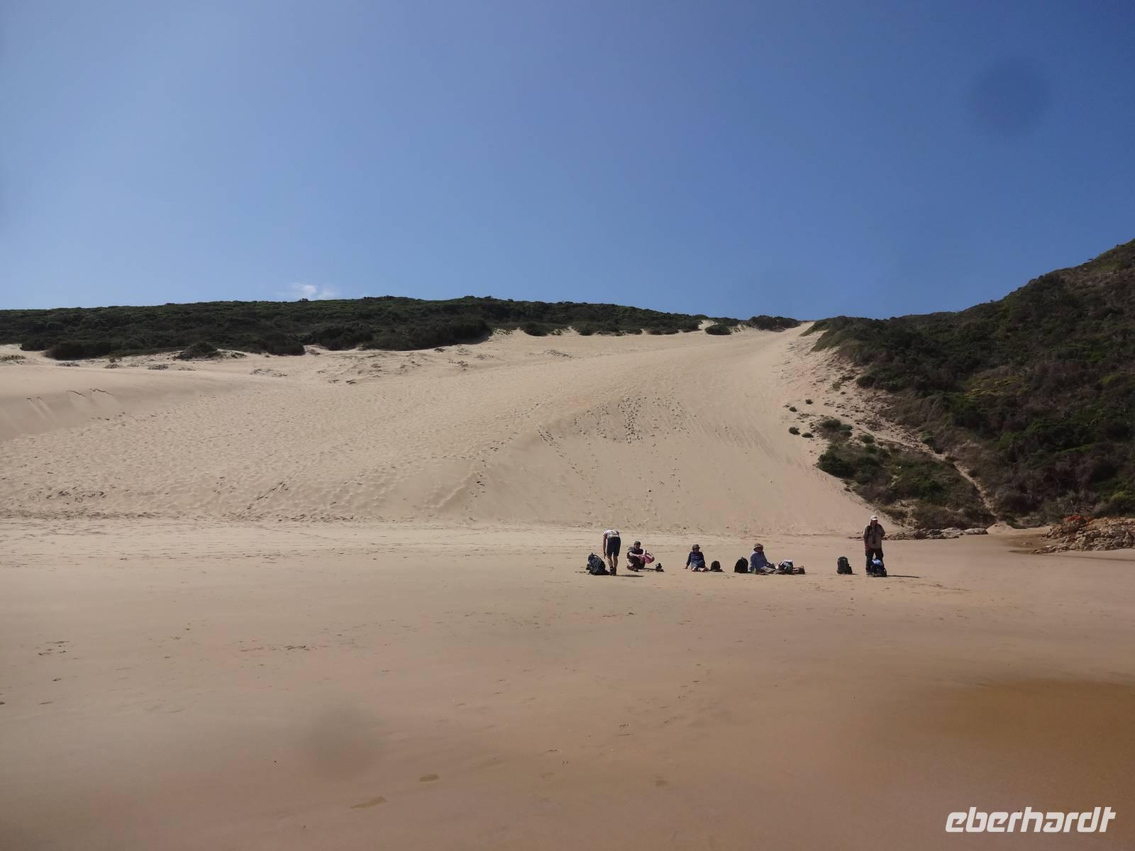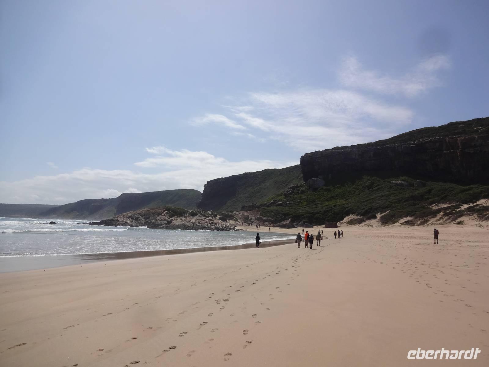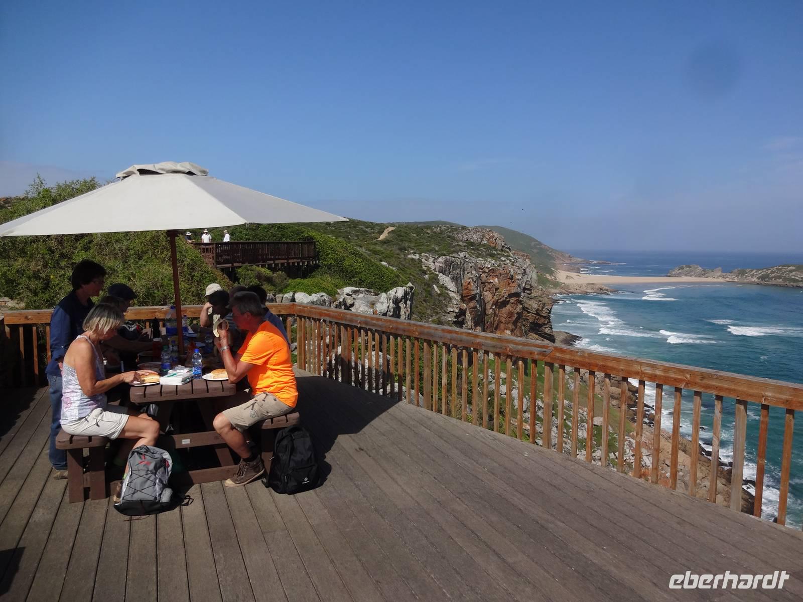 Nach einem genüsslichen Frühstück ging es heute ein Stück zurück in Richtung Osten nach Plettenburg Bay, im nahegelegenen Robberg Naturreservat begannen wir unsere Wanderung mit tollem Blick auf den langen Sandstrand der angrenzenden Bucht. An der Felsküste entlang liefen wir über einen schmalen Pfad, Treppenstufen und sandigen Wegabschnitten mit wunderschönen Ausblicken auf das offene Meer. Wir genossen das hier und jetzt und beobachteten hunderte von Seehunden auf den Felsen ruhend und im Wasser tummelnd. Am ersten Viertel des großen Rundweges angekommen beschloss die komplette Gruppe den großen Rundweg von knapp 10 Kilometern zu erwandern und so ging es weiter bis zur Landspitze. An der dem Ozean zugewandten Seite des Naturreservats ging es zurück über einen anspruchsvollen Pfad mit einigen kleinen Kletterpassagen. Nach diesen wurden wir dann mit einem tollen Strand belohnt an dem wir uns die nach der großen Wanderung „qualmenden Füße" ein wenig abkühlen und unseren Urlaub genießen konnten. Zurück am Parkplatz gab es ein kleines Picknick unter einem Sonnenschirm mit wunderschönem Blick auf die Küste und einer kühlen Brise vom Ozean. In Knysna statteten wir an der Waterfront einem weiteren Restaurant einen Besuch ab und wurden nicht von unseren Erwartungen enttäuscht, die letzte Nacht in Knysna brach an.