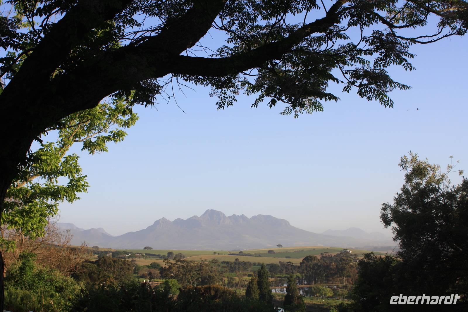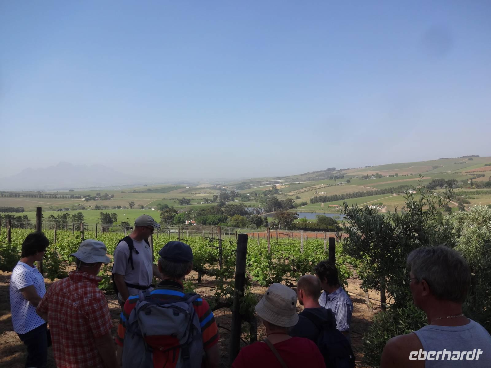 Heute hatten wir eine lange Autofahrt vor uns, es ging in Richtung Weinland in der Nähe von unserem Zielpunkt Kapstadt. Eine kleine Mittagspause verbrachten wir auf dem Weg in einem kleinen gemütlichen Café mit köstlichen Süßigkeiten, leckeren Säften und Café, bevor wir am frühen Nachmittag ein modernes und luxuriöses Weingut besuchten. Hier genossen wir eine kleine Weinprobe mit in der Gegend von Stellenbosch angebauten Weinen und bestaunten das architektonisch sehr schöne Anwesen, insbesondere die große Uhr mit dem offenen Uhrwerk die insbesondere die Männer faszinierte. Da wir sowieso durch die aufgeweckte Studentenstadt Stellenbosch zu unserem Hotel fuhren, beschlossen wir kurzfristig noch ein wenig Freizeit in der Stadt zu verbringen und durch die geschäftigen Gassen zu bummeln. Die durch Restaurants, Café und auch einige Souvenirläden gesäumten Straßen versprühten viel Charme und die Gruppe konnte ein wenig Freizeit genießen und ihren Wünschen nachgehen bevor wir am späten Nachmittag in unser schönes Hotel, im Weinberg gelegenes Hotel eincheckten und das Abendessen im hoteleigenen Restaurant genossen.