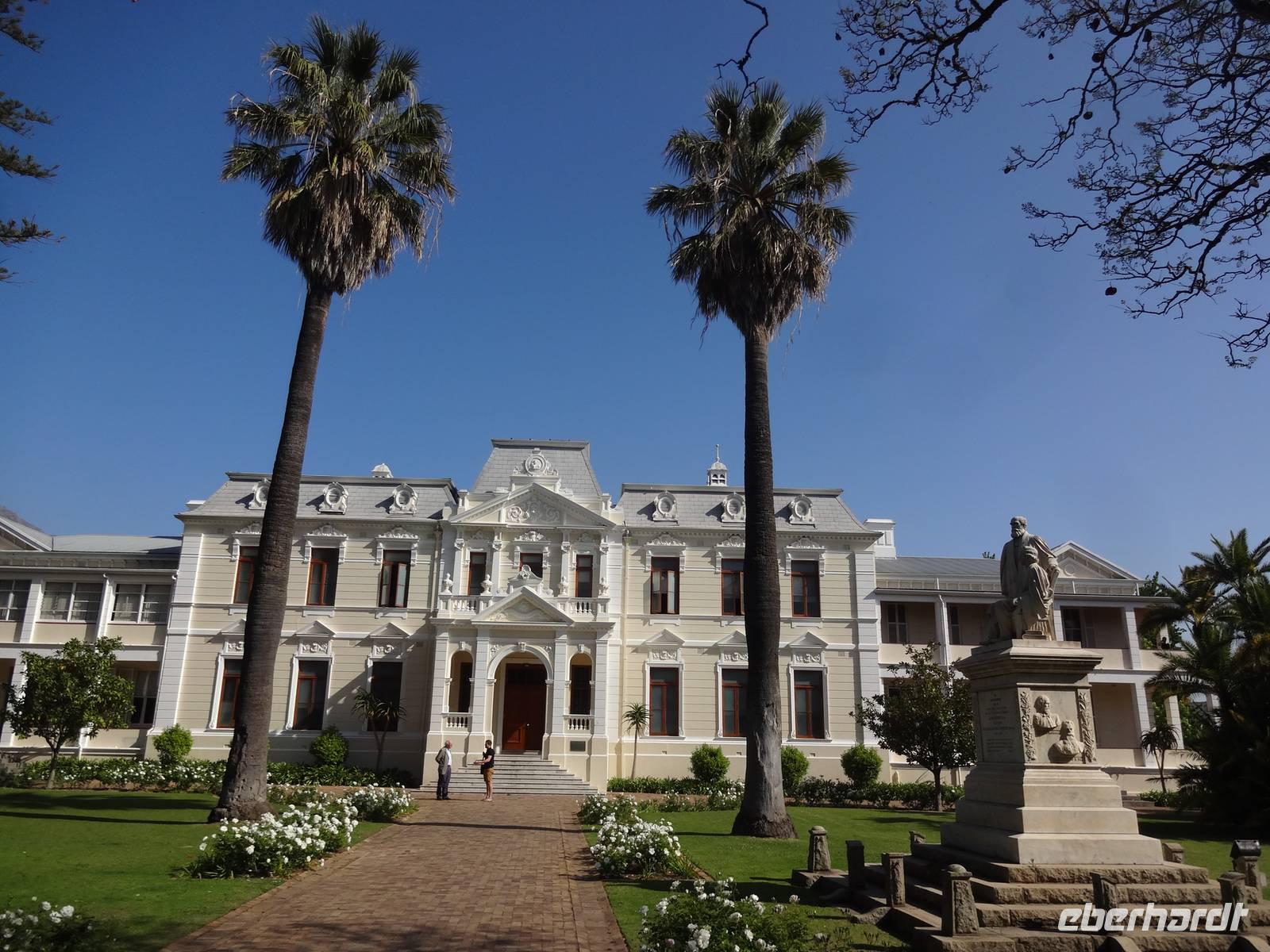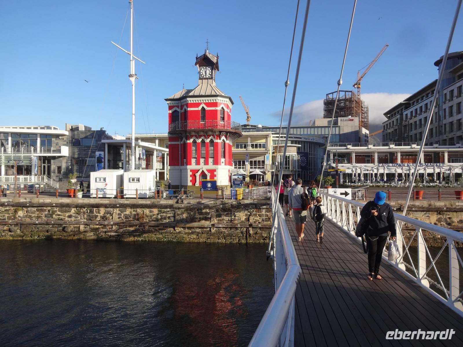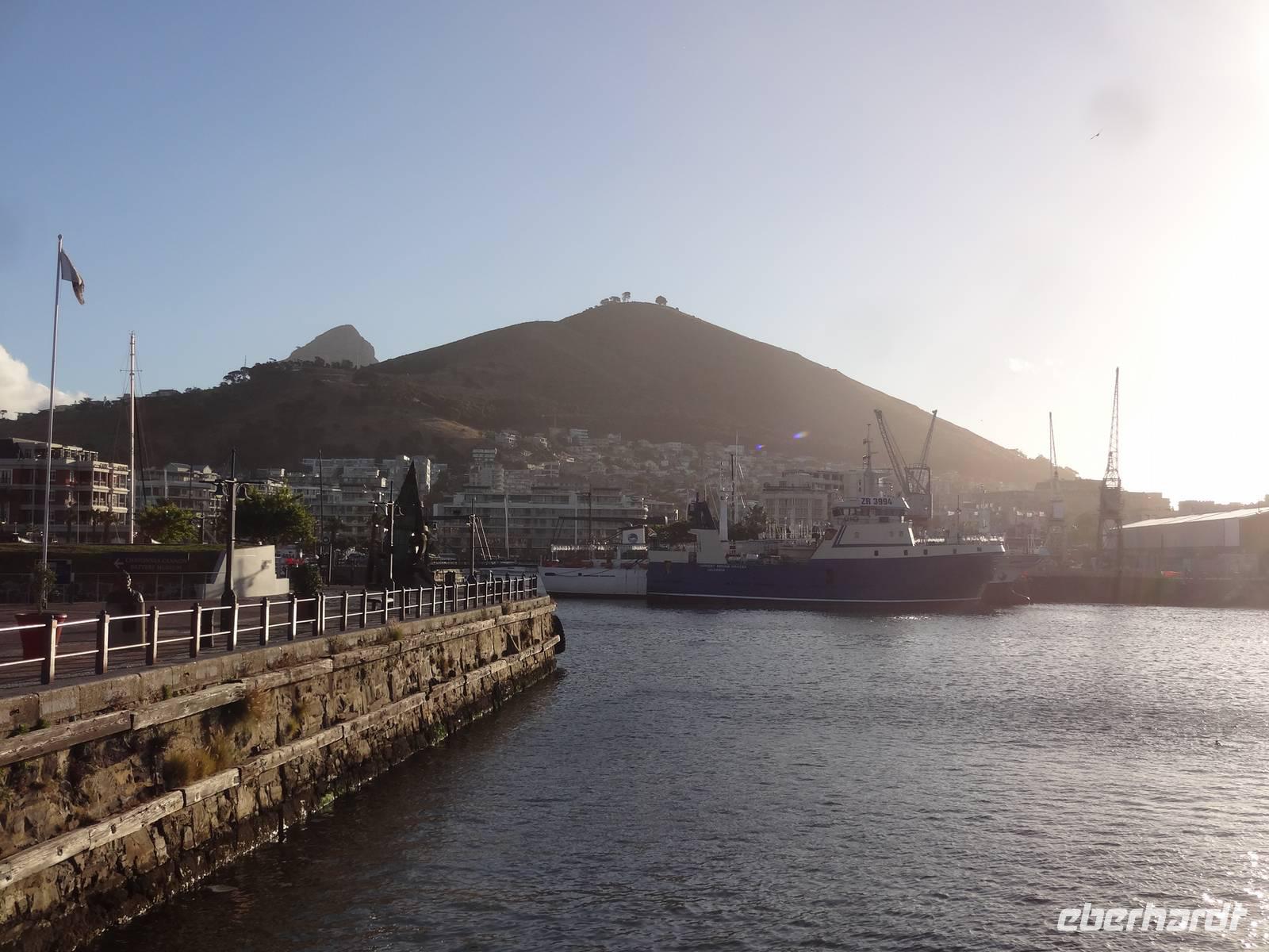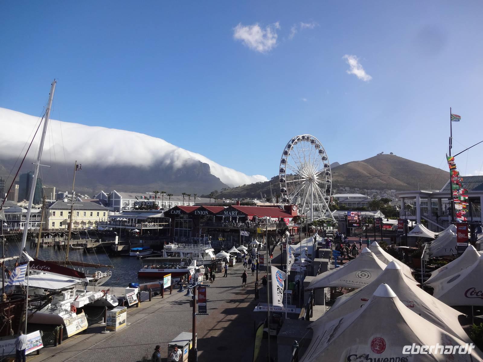 Da wir dem allmorgendlichen Berufsverkehr in Richtung Kapstadt aus dem Wege gehen wollten, starteten wir gemütlich in unseren heutigen Tag. Auf dem Weg sahen wir schon, wie sich langsam die „Tischdecke" über den Tafelberg legte und nach der Kofferabgabe im Hotel stand letztendlich leider fest, dass wir an diesem Tag nicht auf den Tafelberg konnten, da der Wind zu stark war und der Seilbahnbetrieb eingestellt wurde. Das tat unserer guten Stimmung aber keinen Abbruch und wir erlebten trotz alledem einen schönen Tag in Kapstadt. Zuerst ging es für unsere Gruppe auf den Signal Hill, einem Hügel über Kapstadt thronend, der uns einen tollen Blick auf den Tafelberg, den Ozean mit dem berühmten Robben Island, den Lion´s Head - dem Löwenkopf - und über große Teile von Kapstadt gewährte. Unser nächster Stopp war das Malaienviertel mit seinen bunten Häusern, wir schlenderten durch die Gassen und wurden über den Zweck dieser bunten Bemalung aufgeklärt. Diese diente Früher zur Orientierung, denn nur wenige Teile der Bevölkerung konnten lesen oder schreiben und somit wusste jeder, wer in welchem Haus wohnte, vorausgesetzt man war nicht farbenblind. Weiter ging es durch die turbulente Innenstadt an verschiedenen Regierungsgebäuden vorbei und durch das Bankenviertel in Richtung Südafrikanischen Nationalmuseum, wo wir unseren Minibus abstellten und zu Fuß den Company Garden, einen sehr schön angelegten botanischen Garten erkundeten. Durch die Altstadt und über den Marktplatz schlenderten wir zu Fuß, bevor es wieder zurück in Richtung Minibus ging. Kurz vor der Ankunft am Parkplatz begegneten wir dann noch einer Gruppe von Studenten, die wir schon aus den Zeitungen und den Nachrichten kannten, die aber friedlich durch die Straßen zogen und gegen die Erhöhung der Studiengebühren protestierten. Danach fuhren wir zurück zum Hotel, bezogen unsere Zimmer und genossen ein wenig Freizeit. Am Nachmittag ging es dann zur berühmten Waterfront mit ihren vielen Geschäften und Restaurants, wir brauchten ja schließlich noch ein paar Souvenirs und hungrig waren wir auch.