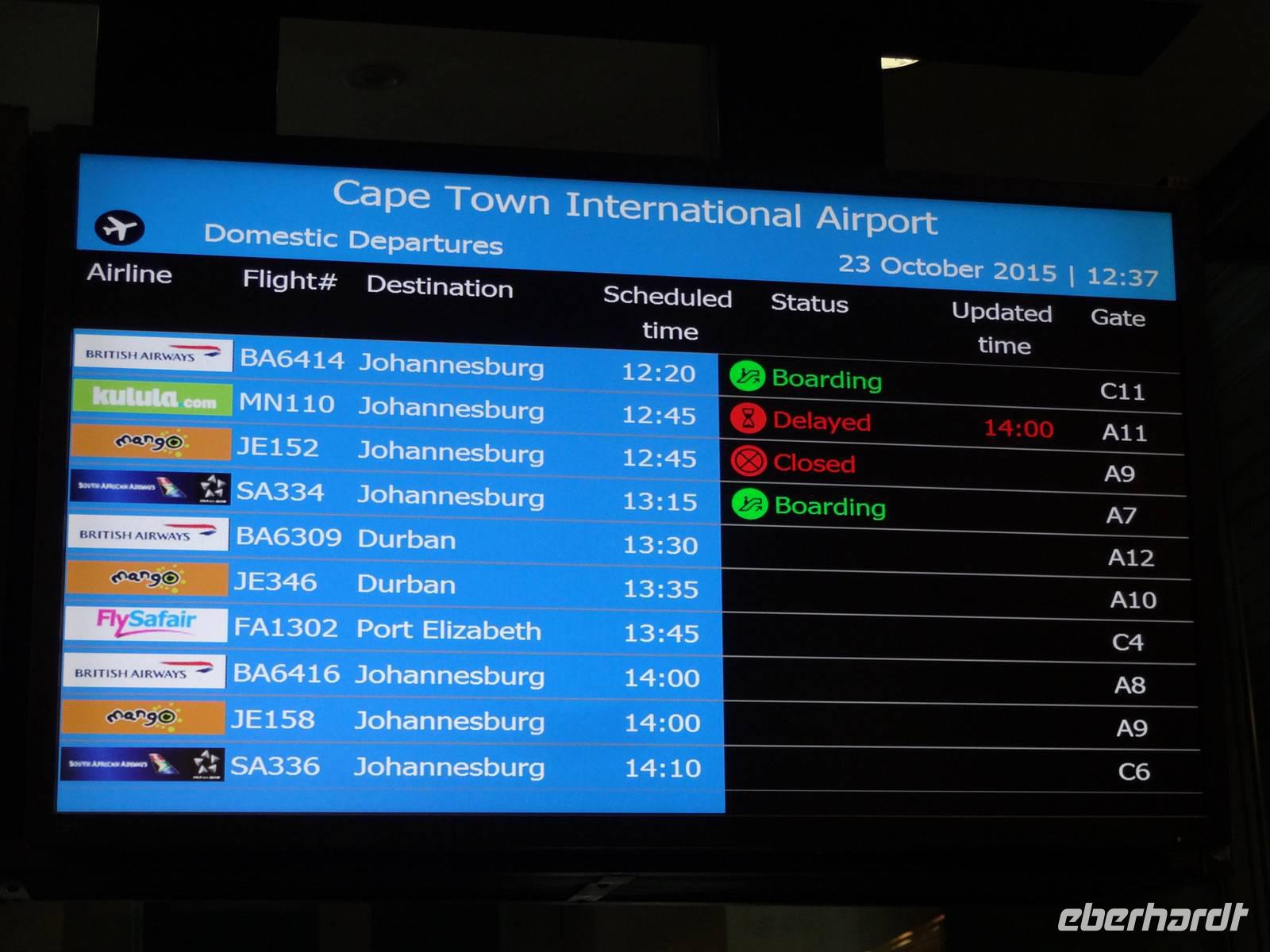 Am Freitagmittag geht es für uns Reisgäste von verschiedenen Flughäfen in Deutschland los, die erste Etappe in Richtung Umsteigeflughafen Frankfurt/Main wird in Angriff genommen. Am Nachmittag gelandet bleiben uns ein paar Stunden Zeit, um uns im Frankfurter Flughafen umzuschauen, eine Kleinigkeit zu Essen und unsere Reisegruppe zu komplettieren, bevor es am Abend weiter geht: auf nach Südafrika!