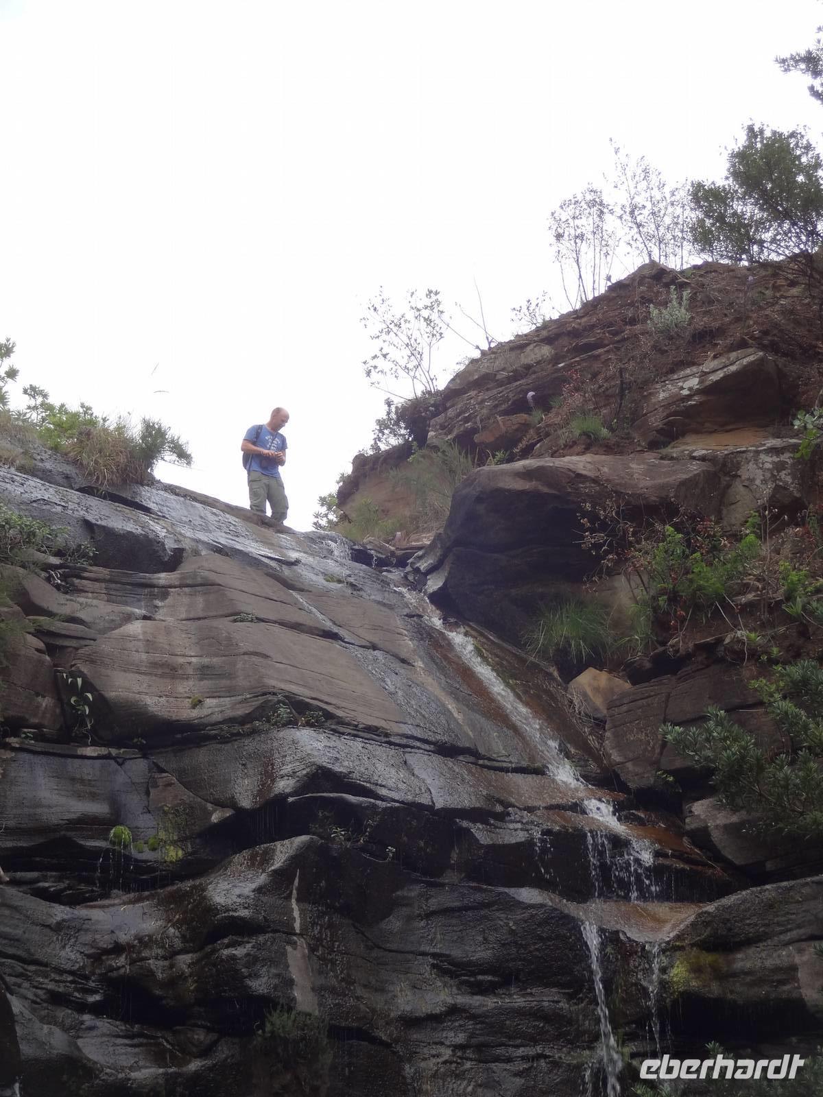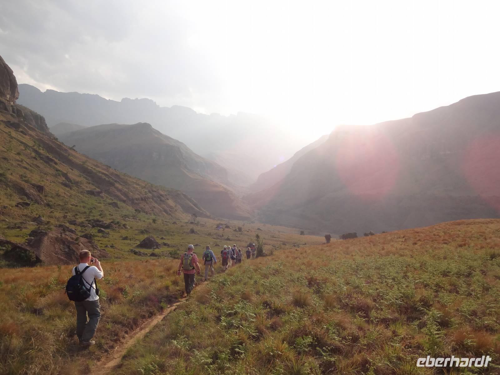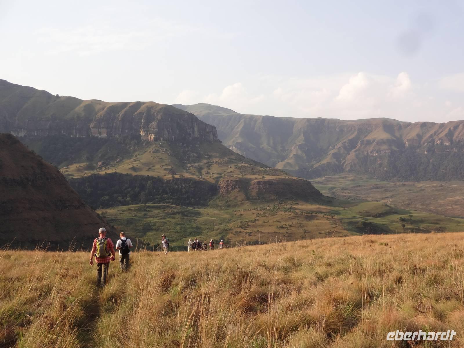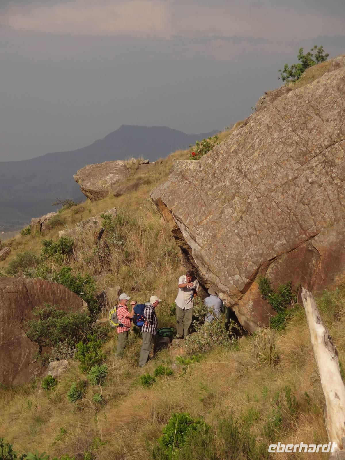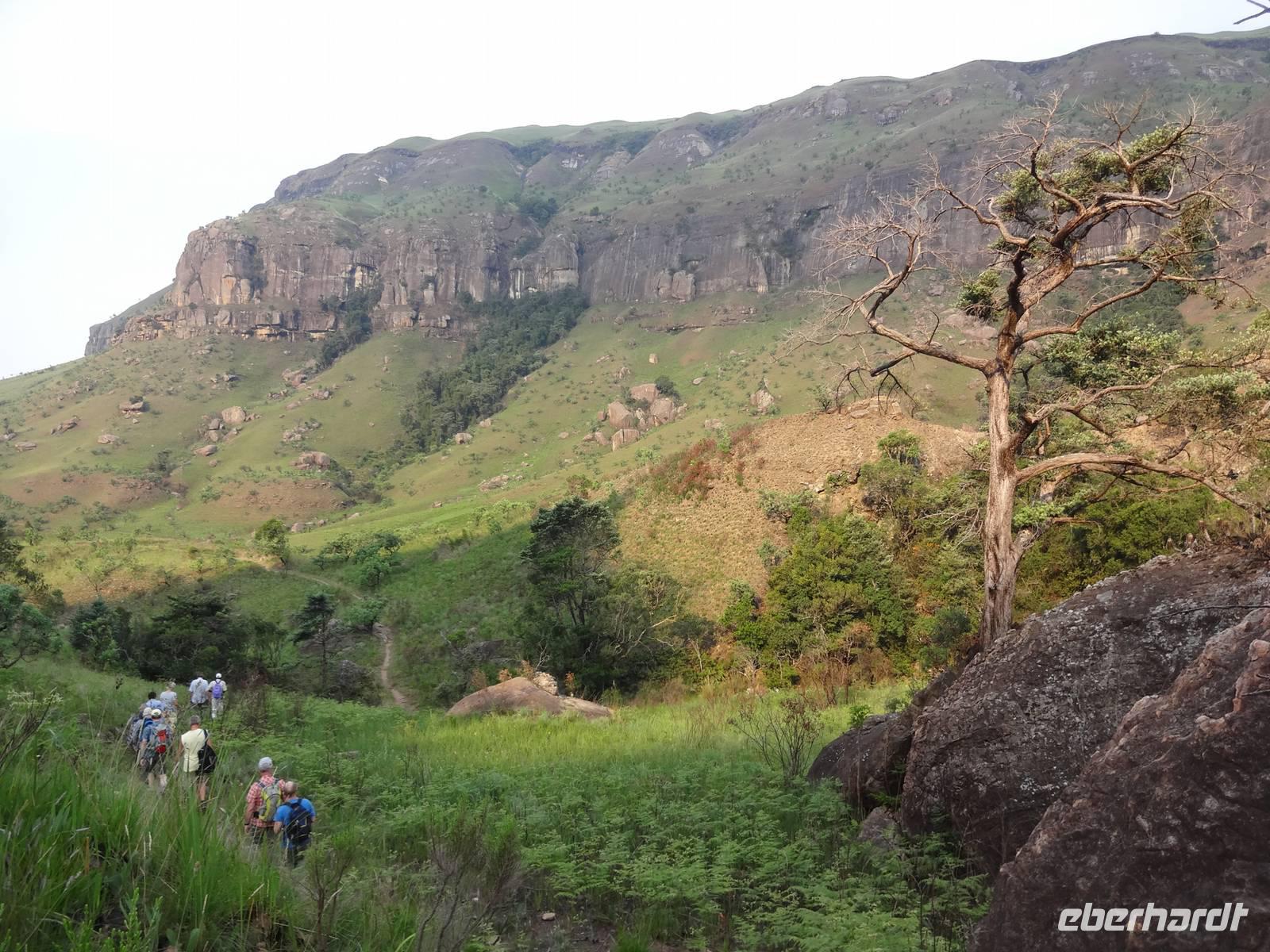 Gut gefrühstückt fuhren wir mit Zama zu seinem Dorf, in einfachen Lehmhütten lebend und mit den einfachsten Mitteln auskommend bestaunten wir die Lebensweise des hier beheimateten Zulu Volkes. Kleinkinder liefen barfuß über Stock und Stein, Frauen wuschen die Wäsche in großen Blechkörben und das Weidevieh graste frei im Dorf bevor es am Abend wieder vom Halter zurück zum Haus getrieben wurde. Einen kurzen Blick in das Haus des Guides geworfen ging es zum Medizinmann, dem Sangoma, des Dorfes, zufällig der Bruder unseres Guides und extra für uns in seiner traditionellen Tracht gekleidet ;-) Er begrüßte uns in seiner Hütte und wir warfen natürlich einen interessierten Blick in diese, bevor er einem mutigen Reisegast sogar die Zukunft vorhersagte, eine tolle Erfahrung die wir hier gewonnen haben. Aber die Führung durch das Dorf war noch nicht vorbei, wir gingen noch zum Wäschewaschplatz am Fluss und zur Highschool, die wir aber nicht von innen besichtigten da gerade der Unterricht lief, was wir voll und ganz respektierten. Vorbei ging es am Kindergarten, und bevor wir weiterkamen rannten die kleinen Kinder zum Zaun, begrüßten uns herzlich und hatten gaaanz große Augen. Wir wurden in den Kindergarten gebeten und waren natürlich gut vorbereitet! Die Kids stellten sich artig in der Reihe auf und holten sich ohne Drängelei jeweils eine Süßigkeit ab, ein tolles Bild! Bevor es weiter zur Grundschule ging wurden wir mit einem lauten „Byyeee" verabschiedet. In der Schule angekommen warfen wir einen Blick in die Klassenräume mit den in Schuluniformen gekleideten Schülern, so eine Touristengruppe lenkt ja schon ein wenig vom Unterricht ab und somit hielten wir uns nicht allzu lange auf dem Schulgelände auf und verließen die Schüler nachdem wir ein paar Mitbringsel von Zuhause der Lehrerin übergeben hatten. Nach dem Kauf einiger Souvenirs im dörflichen Craft Center ging es dann nach dem Mittagessen zu unserer Nachmittagswanderung zu den Doreen Falls. Am gleichen Punkt wie am Vortag startend erkundeten wir nun das Nachbartal und liefen in Richtung eines Wasserfalls. Zama, unser Wanderguide, immer mit offenen Augen unterwegs zeigte uns eine kleine Eule auf einem Felsvorsprung und eine kleine Herde Elands, die wiederum unsere Gruppe beobachtete. Am aufgrund des geringen Regens in den Vormonaten klein ausgefallenen Wasserfall legten wir eine kurze Pause ein und genossen die wunderschöne Umgebung, bevor es wieder für einige aus der Gruppe und dem Reiseleiter zum Ausgangspunkt zurück ging. Der Rest der Gruppe wählte einen anderen Weg auf der gegenüberliegenden Talseite und wanderte mit Zama zu dem vorher besprochenen Treffpunkt, wo wir mit dem Minibus abgeholt wurden und gemeinsam zum Hotel fuhren. Nach dem Abendessen ging es dann direkt ins Bett, denn es hieß: Flieger am nächsten Morgen kriegen und so wurde es eine kurze Nacht.