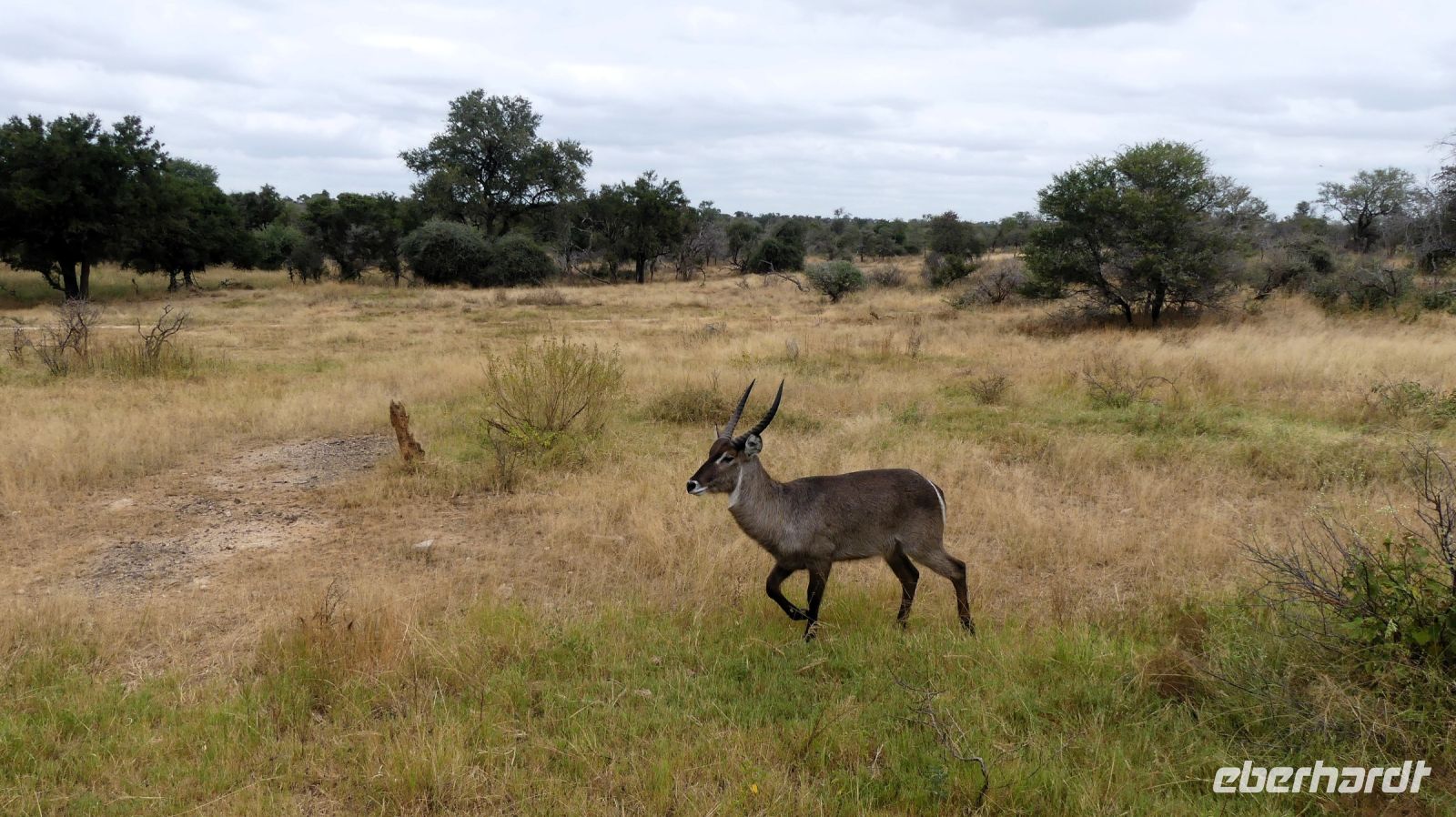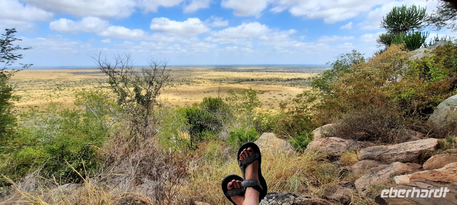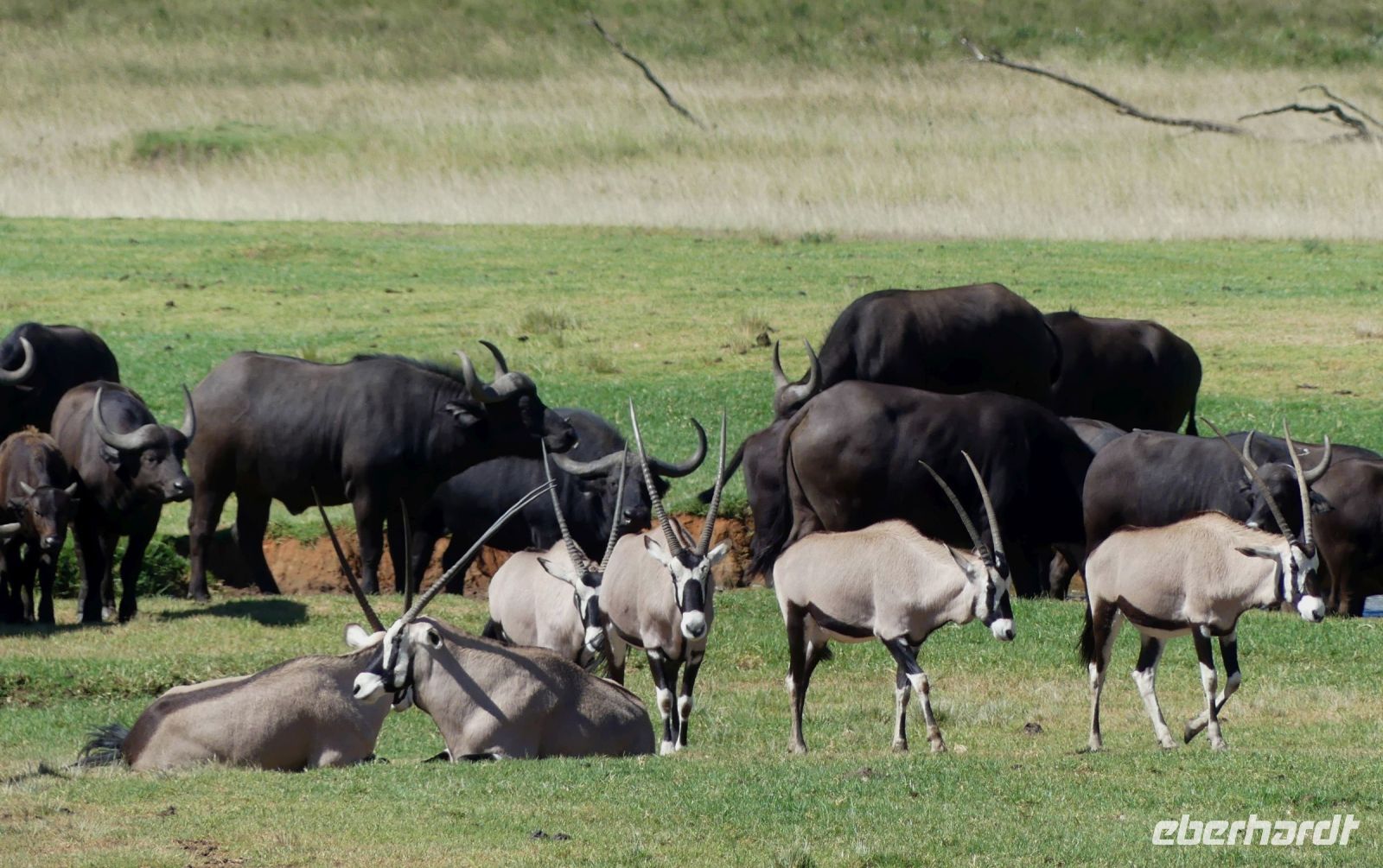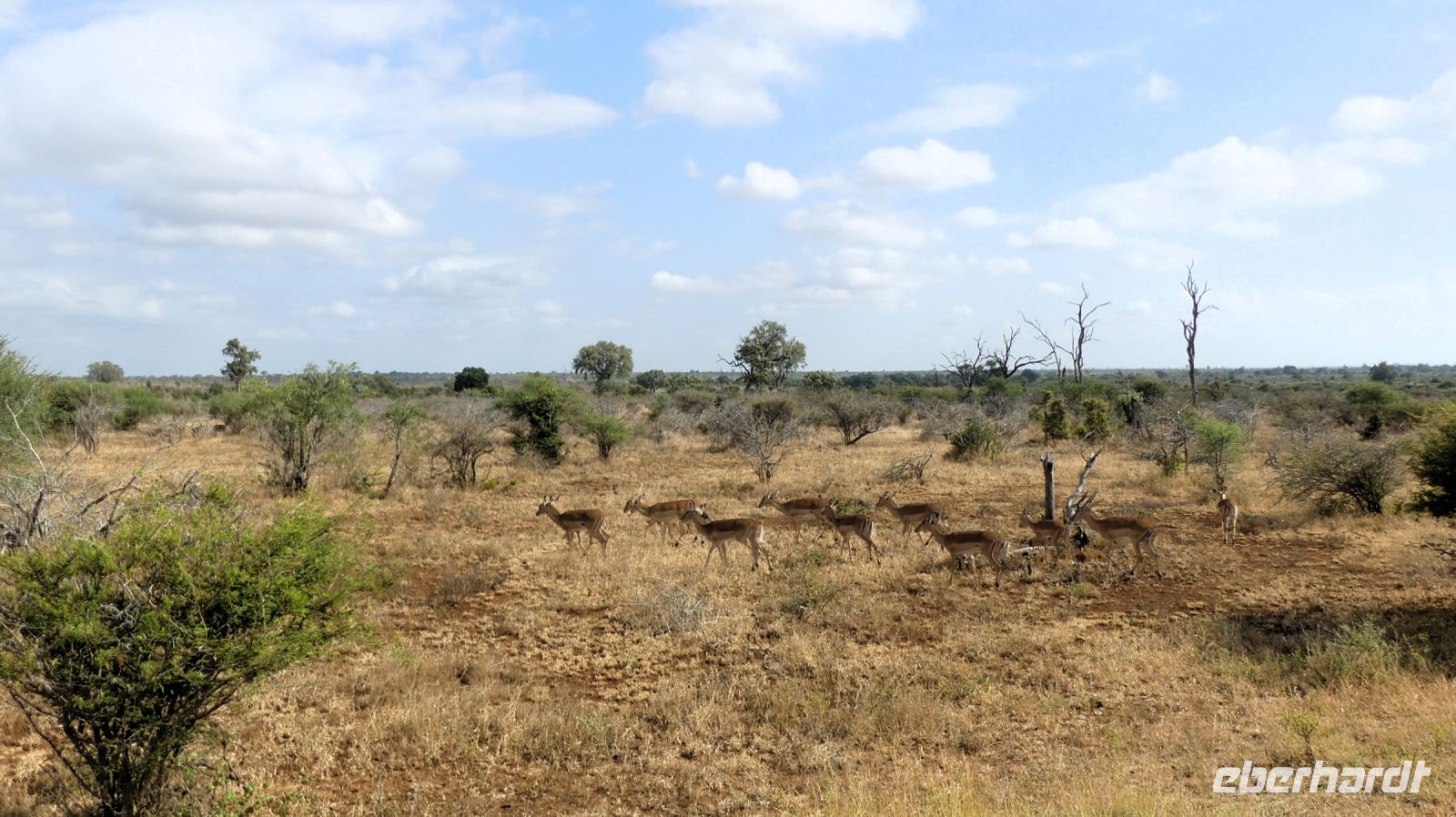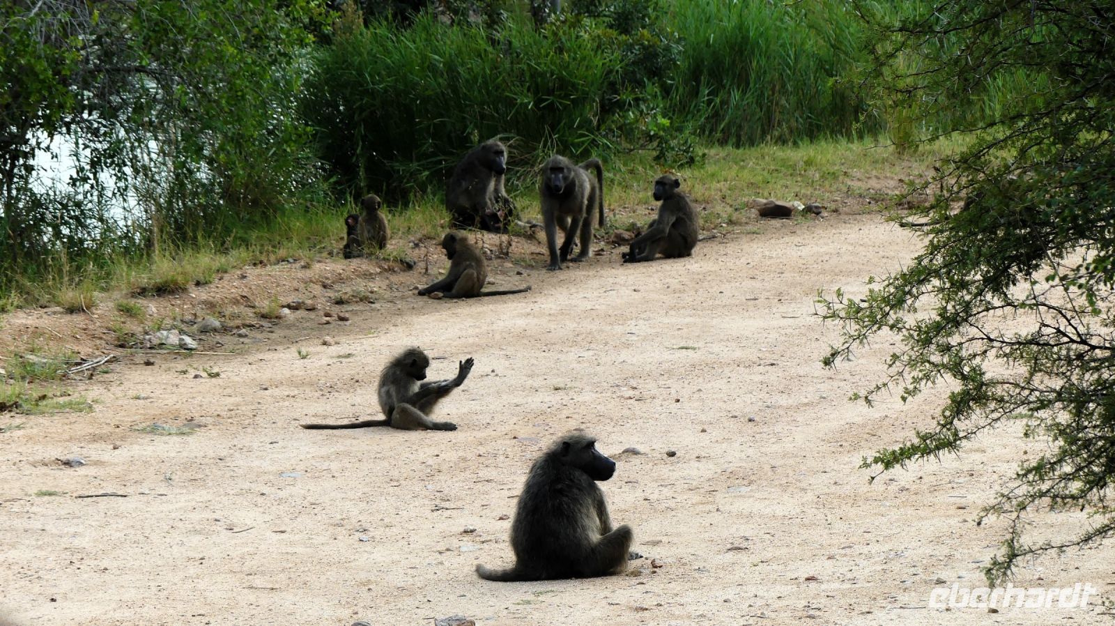 Noch vor Sonnenaufgang standen wir am nächsten Tag auf. Etwas müde, dennoch voller Spannung und Vorfreude schlürften wir Kaffee oder Tee. Mit dem Bus fuhren wir zum unweit entfernten Phabeni Gate. Der Kruger NP öffnet bei Sonnenaufgang. Am Eingangstor warteten unsere Ranger Lincoln und Jack und wir stiegen in zwei Jeeps um. Heia Safari! Während der Fahrt erlebten wir einen magischen Sonnenaufgang. Zebras und Antilopen am Straßenrand, doch dann wurde die Fahrt rasanter. Nicht ohne Grund: nicht weit von der Pad konnten wir zwei Löwen-Männchen (Brüder)Löwenrudel beobachten- WOW. Noch vor unserem Frühstückspicknick erspähten wir Schwarzfersen-Impalas, eine Kudu-Familie, Zebrasteifen, Pavian-Herde beim Frühstück, Weißrückengeiner, Streifengnus, Giraffen und natürlich Elefanten! Ein Halbstarker hatte sich Spaß, uns zu erschrecken - Törrö! Auf dem Tshokwane Picknickplatz, unterm Leberwurstbaum packten wir unsere Lunch-Pakete aus und frühstückten in Gesellschaft von Mister Pavian, der auf die Bedienung wartete, Glanzstaren und Buschböcken, bevor es mit unserer Safari weiter ging. Neben einer einzigartigen, sich ständig verändernden Landschaft kam uns noch einiges vor die Linse. In Skukuza am Sabie River verbrachten wir unsere Mittagspause und konnten Hippos im Fluss und grasende Elefanten beobachten. Auf unserer Rückfahrt versperrte uns eine große Büffel-Herde den Weg. Später stieg uns beißender Geruch in die Nase. An einem Damm trauerte eine Hippo-Familie in respektvoller Entfernung um einen Artgenossen, nur ein Krokodil suchte seine Nähe. Und das Beste kommt bekanntlich zum Schluss: ein Leopard im Baum, der sich dann von seinem Hochsitz ins Grasland verkrümelte und wir wir waren live dabei! Bei einer Safari muss man eben zur richtigen Zeit am richtigen Ort sein! Am späteren Nachmittag waren wir in unserer Unterkunft zurück. Beim gemeinsamen Abendessen schlemmten wir noch einmal vom leckeren Buffet. Nach einem Absacker in der Bar gingen wir zu Bett. Vor meinem Zimmer war reger Betrieb: Nachtfalter, Geckos und eine stattlicher Frosch. Den bekam ich leider nicht zu fassen und konnte somit nicht feststellen, ob es vielleicht ein verwunschener Prinz war?