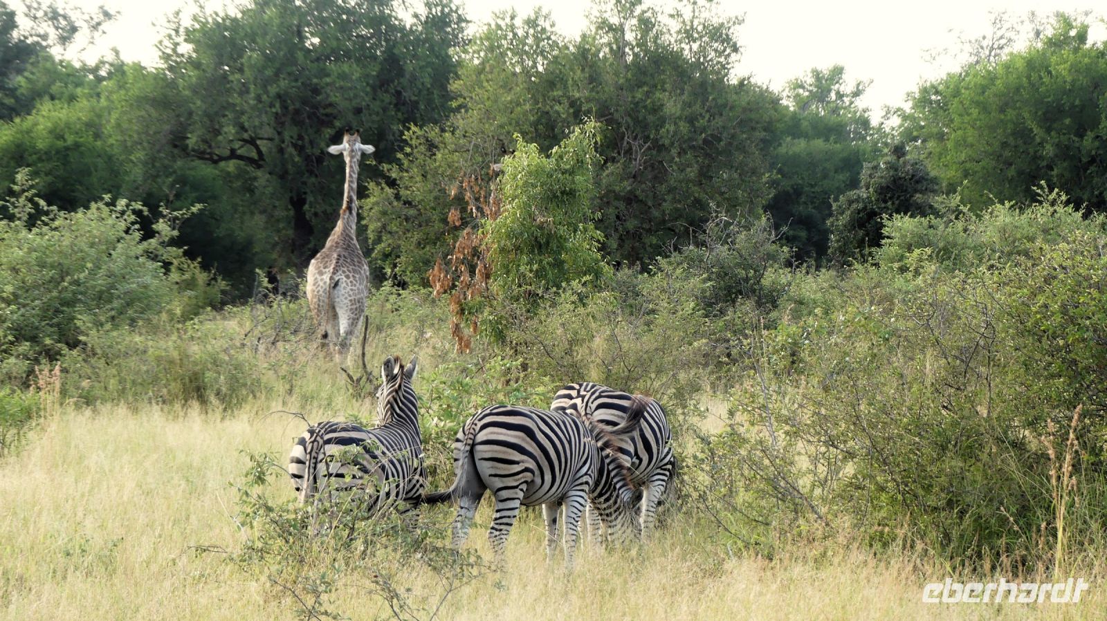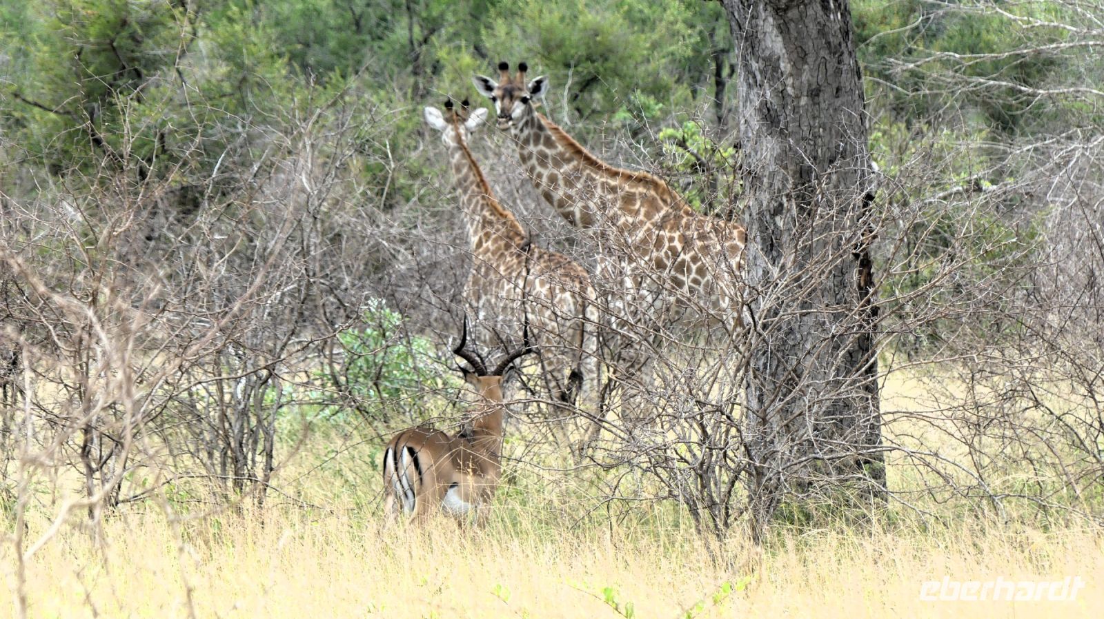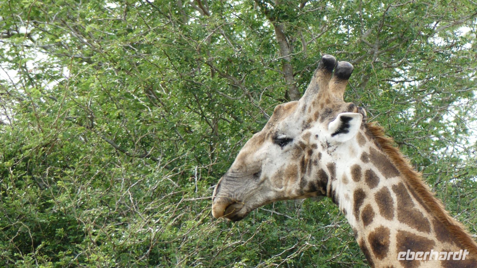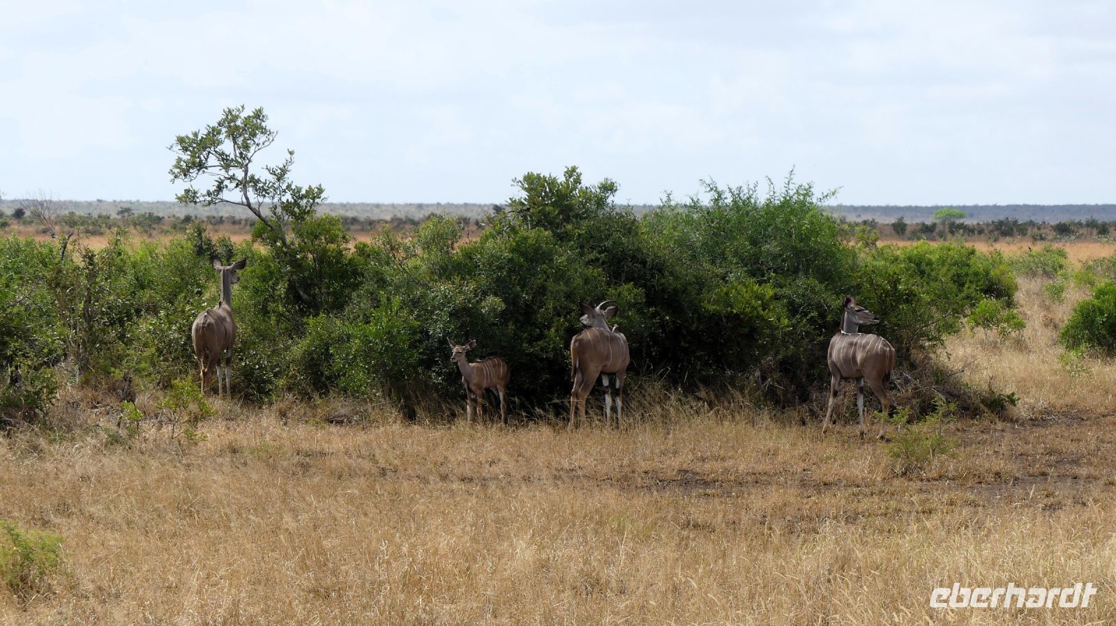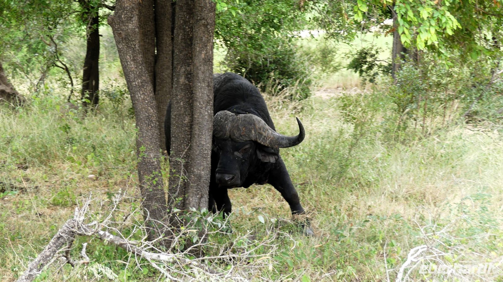 Noch vor Sonnenaufgang standen wir am nächsten Tag auf. Etwas müde, dennoch voller Spannung und Vorfreude schlürften wir Kaffee oder Tee. Mit dem Bus fuhren wir zum unweit entfernten Phabeni Gate. Der Kruger NP öffnet bei Sonnenaufgang. Am Eingangstor warteten unsere Ranger Lincoln und Jack und wir stiegen in zwei Jeeps um. Heia Safari! Während der Fahrt erlebten wir einen magischen Sonnenaufgang. Zebras und Antilopen am Straßenrand, doch dann wurde die Fahrt rasanter. Nicht ohne Grund: nicht weit von der Pad konnten wir zwei Löwen-Männchen (Brüder)Löwenrudel beobachten- WOW. Noch vor unserem Frühstückspicknick erspähten wir Schwarzfersen-Impalas, eine Kudu-Familie, Zebrasteifen, Pavian-Herde beim Frühstück, Weißrückengeiner, Streifengnus, Giraffen und natürlich Elefanten! Ein Halbstarker hatte sich Spaß, uns zu erschrecken - Törrö! Auf dem Tshokwane Picknickplatz, unterm Leberwurstbaum packten wir unsere Lunch-Pakete aus und frühstückten in Gesellschaft von Mister Pavian, der auf die Bedienung wartete, Glanzstaren und Buschböcken, bevor es mit unserer Safari weiter ging. Neben einer einzigartigen, sich ständig verändernden Landschaft kam uns noch einiges vor die Linse. In Skukuza am Sabie River verbrachten wir unsere Mittagspause und konnten Hippos im Fluss und grasende Elefanten beobachten. Auf unserer Rückfahrt versperrte uns eine große Büffel-Herde den Weg. Später stieg uns beißender Geruch in die Nase. An einem Damm trauerte eine Hippo-Familie in respektvoller Entfernung um einen Artgenossen, nur ein Krokodil suchte seine Nähe. Und das Beste kommt bekanntlich zum Schluss: ein Leopard im Baum, der sich dann von seinem Hochsitz ins Grasland verkrümelte und wir wir waren live dabei! Bei einer Safari muss man eben zur richtigen Zeit am richtigen Ort sein! Am späteren Nachmittag waren wir in unserer Unterkunft zurück. Beim gemeinsamen Abendessen schlemmten wir noch einmal vom leckeren Buffet. Nach einem Absacker in der Bar gingen wir zu Bett. Vor meinem Zimmer war reger Betrieb: Nachtfalter, Geckos und eine stattlicher Frosch. Den bekam ich leider nicht zu fassen und konnte somit nicht feststellen, ob es vielleicht ein verwunschener Prinz war?