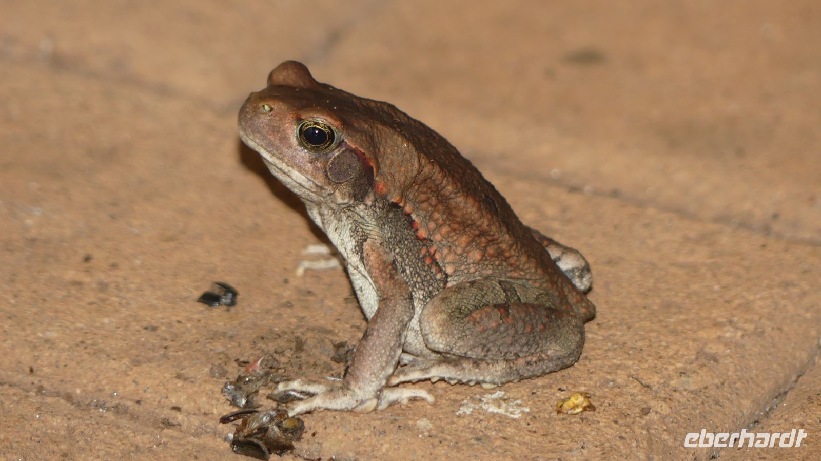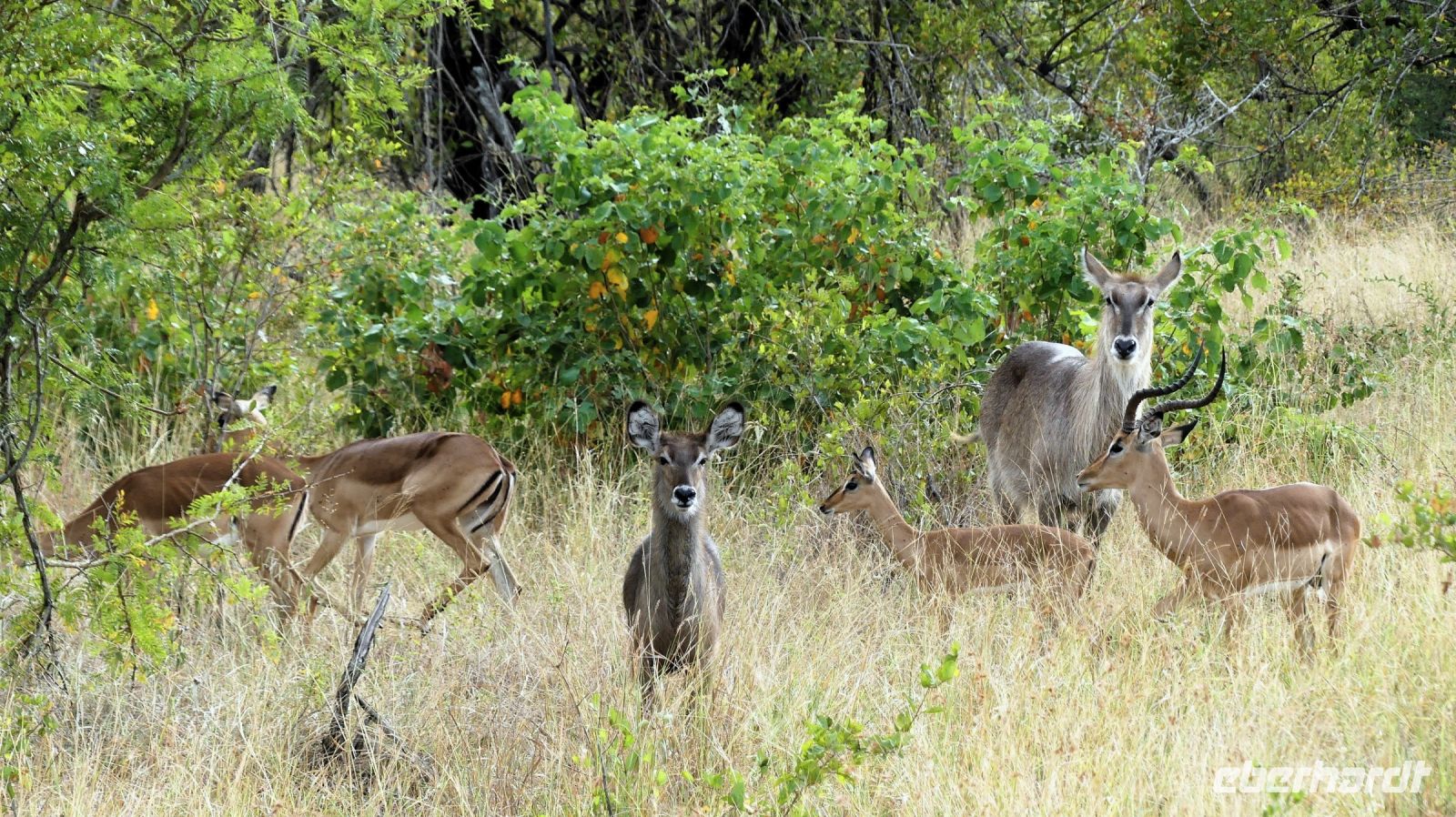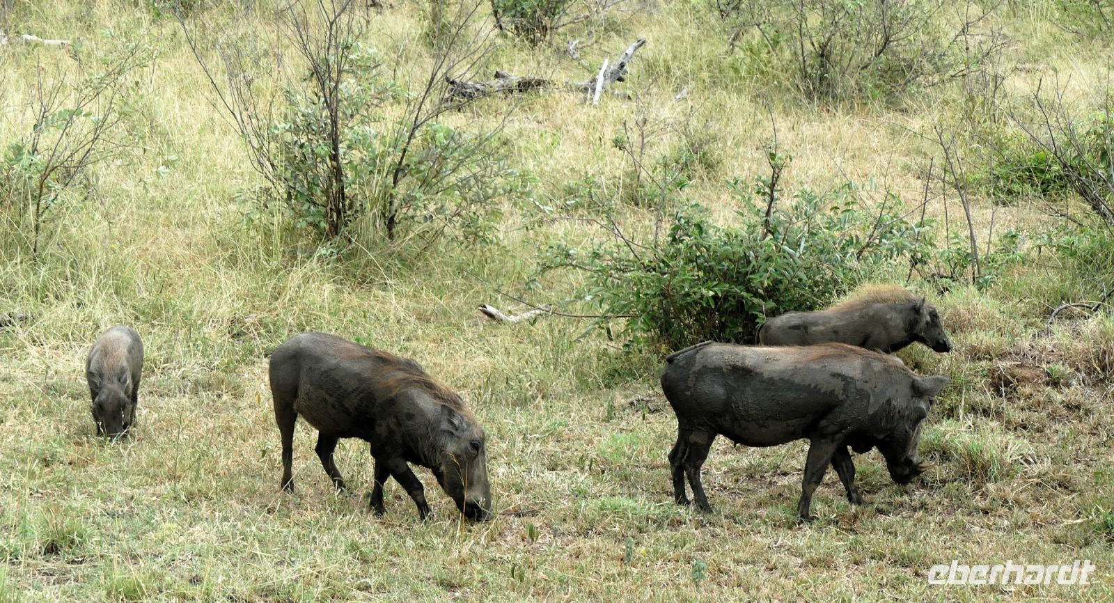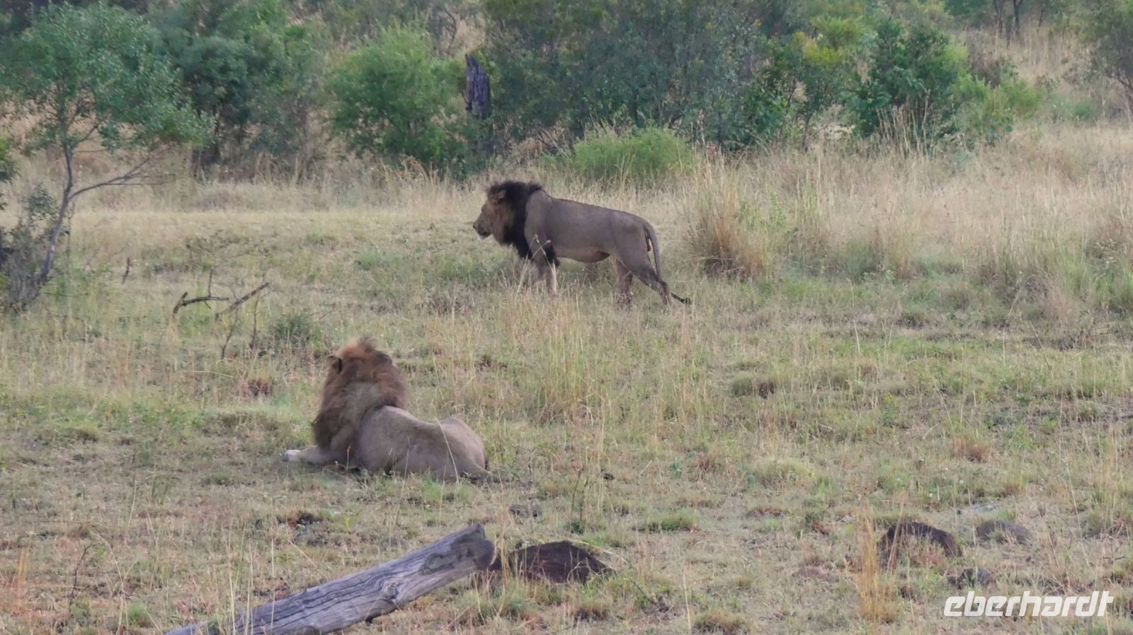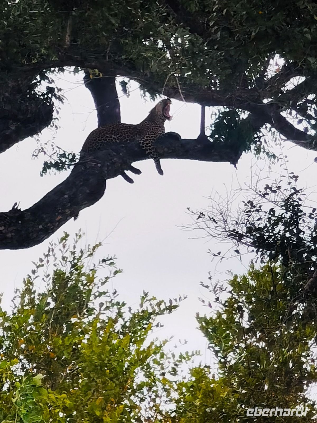 Noch vor Sonnenaufgang standen wir am nächsten Tag auf. Etwas müde, dennoch voller Spannung und Vorfreude schlürften wir Kaffee oder Tee. Mit dem Bus fuhren wir zum unweit entfernten Phabeni Gate. Der Kruger NP öffnet bei Sonnenaufgang. Am Eingangstor warteten unsere Ranger Lincoln und Jack und wir stiegen in zwei Jeeps um. Heia Safari! Während der Fahrt erlebten wir einen magischen Sonnenaufgang. Zebras und Antilopen am Straßenrand, doch dann wurde die Fahrt rasanter. Nicht ohne Grund: nicht weit von der Pad konnten wir zwei Löwen-Männchen (Brüder)Löwenrudel beobachten- WOW. Noch vor unserem Frühstückspicknick erspähten wir Schwarzfersen-Impalas, eine Kudu-Familie, Zebrasteifen, Pavian-Herde beim Frühstück, Weißrückengeiner, Streifengnus, Giraffen und natürlich Elefanten! Ein Halbstarker hatte sich Spaß, uns zu erschrecken - Törrö! Auf dem Tshokwane Picknickplatz, unterm Leberwurstbaum packten wir unsere Lunch-Pakete aus und frühstückten in Gesellschaft von Mister Pavian, der auf die Bedienung wartete, Glanzstaren und Buschböcken, bevor es mit unserer Safari weiter ging. Neben einer einzigartigen, sich ständig verändernden Landschaft kam uns noch einiges vor die Linse. In Skukuza am Sabie River verbrachten wir unsere Mittagspause und konnten Hippos im Fluss und grasende Elefanten beobachten. Auf unserer Rückfahrt versperrte uns eine große Büffel-Herde den Weg. Später stieg uns beißender Geruch in die Nase. An einem Damm trauerte eine Hippo-Familie in respektvoller Entfernung um einen Artgenossen, nur ein Krokodil suchte seine Nähe. Und das Beste kommt bekanntlich zum Schluss: ein Leopard im Baum, der sich dann von seinem Hochsitz ins Grasland verkrümelte und wir wir waren live dabei! Bei einer Safari muss man eben zur richtigen Zeit am richtigen Ort sein! Am späteren Nachmittag waren wir in unserer Unterkunft zurück. Beim gemeinsamen Abendessen schlemmten wir noch einmal vom leckeren Buffet. Nach einem Absacker in der Bar gingen wir zu Bett. Vor meinem Zimmer war reger Betrieb: Nachtfalter, Geckos und eine stattlicher Frosch. Den bekam ich leider nicht zu fassen und konnte somit nicht feststellen, ob es vielleicht ein verwunschener Prinz war?