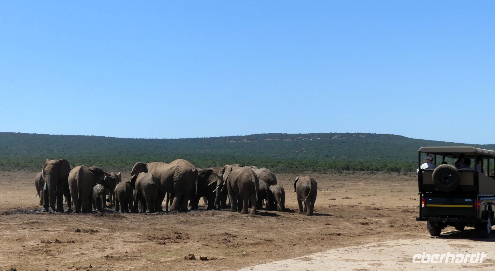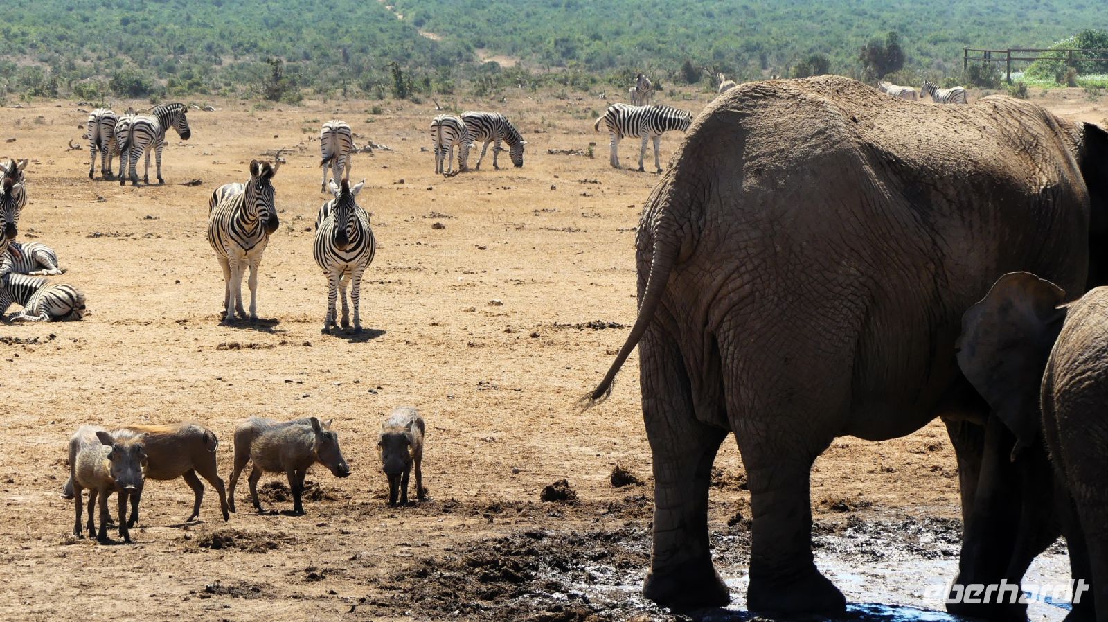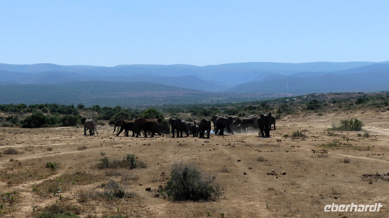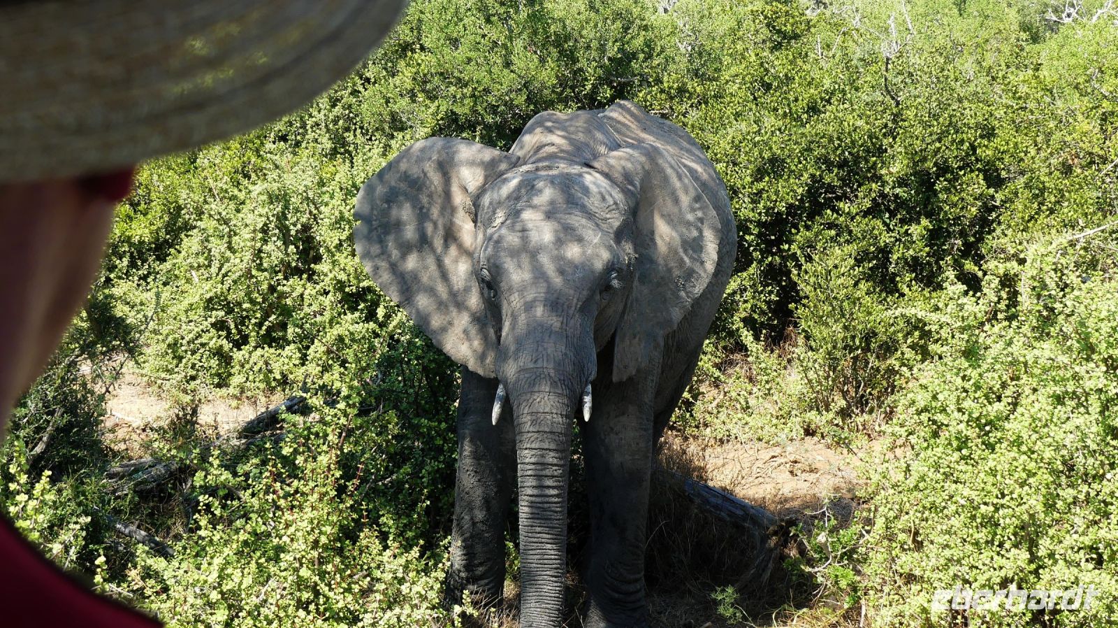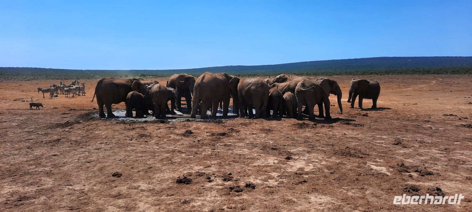 Nach dem Frühstück begrüßten uns Donald und Dencil, unsere Ranger für unsere Pirschfahrt im Addo. Wir bestiegen unsere komfortablen Jeeps und fuhren zum nicht weit entfernten Main Gate. Wir erfuhren, dass bereits 1931 ein kleines Gebiet von 2.500 Hektar als Schutzgebiet deklariert wurde, um die letzten, in dieser Region lebenden Elefanten zu retten. Damals waren es nur 16, über 600 sind es heute, die Zahl steigt ständig, da sie keine natürlichen Feinde haben. Heute erstreckt sich der Nationalpark bis zum Indischen Ozean auf 180.000 Hektar (inklusive des Meeresanteils). Somit beheimatet der Park nicht nur die Big 5, sondern die Big 7, denn Haie und Wale gehören dazu. Wir freuten uns auf einen sonnigen und elefantistischen Tag im Addo. Auf Schildern wurden wir hingewiesen, langsam zu fahren: Achtung Mistkäfer! Die Dung Beetles oder Pillendreher stehen sogar unter Artenschutz, verrichten sie doch den wichtigsten Job, das Putzen! Von der weit überschaubaren und grünen Landschaft, durchzogen mit Hügeln und gespickt mit zahlreichen Wasserlöchern waren wir verzaubert. Überall Speckbäume (Büsche) mit ihren saftig fleischigen Blättern, die hier das Hauptnahrungsmittel der grauen Riesen sind. Und dazwischen Elefanten, Elefanten, Elefanten, die natürlich die Haupttakteure im Park sind. Ob im Busch oder an den Wasserlöchern versammelt, mal in der Ferne, mal ganz hautnah! Was uns sofort auffiel, die meisten Weibchen haben keine Stoßzähne. Ein genetische Eigenart, die wahrscheinlich durch die Wilderei (Elfenbein) ausgelöst wurde. Heute versucht man frisches Blut in die Erbfolge zu bringen. z.B. wurde ein starker, männlicher Elefantenbulle aus dem Krüger Nationalpark in eine Herde integriert. Wir entdeckten Steppenzebras, Hartebeest, Schakal und die putzigen Warzenschweine; ein Sing-Habicht spähte die Umgebung aus, während ein Erdmännchen auf einem Busch on Top seinen Wachposten-Job sehr ernst nahm. Später kreuzte eine Straßenfamilie unseren Weg. Mama Strauß frühstückte und Papa Strauß sorgte sich liebevoll um den Nachwuchs - ein tierischer Morgen! Auf einer sicheren Anhöhe hielten wir für einen Boxenstopp. Mit frischen Kaffee genossen wir den Panoramablick, bevor wir weiter pirschten. Ab und zu hielten wir den Atem an, wenn Elefanten fast unseren Jeep streiften. Am Hapoor Wasserloch, welches nach einem sehr dominaten Bullen mit markanten Schlitz im Ohr benannt wurde, herrschte reger Betrieb: Elefanten-Schlammschlacht rechts, große Elefanten- und Zebraherden links und wir mittendrin. Der Hunger auf fotogene Elefanten war vorerst gestillt, nun waren wir dran. Auf Jacks Picknickplatz entzündeten Dencil und Donald das Feuer: Braai Time. Beim rustikalen Busch-BBQ wurden wir mit allerhand Leckereien bewirtet: Kudu-Wurst, Fleischspieß meets Salat und mehr. Baie Dankee, baie lekker. Gut gestärkt verspürten wir dennoch Hunger auf weitere Pirscherfolge: Warzenschweine, Büffel, Kudus, Schildi und einen Löwen. Wenn auch aus weiterer Entfernung, aber immerhin einer von den zwei Löwenmännchen, die hier im Addo mit 3 Löwinnen leben. Ein Tag voller elefantistischer Momente im Addo ging zu Ende. In unserer schönen Lodge verabschiedeten wir uns von Dencil und Donald, die diesen Tag besonders für uns gemacht haben. Beim leckeren Abendessen ließen wir den Tag noch einmal Revue passieren. Auch Fledermäuse waren wieder zu Gast, eine überlebte leider nicht;-).