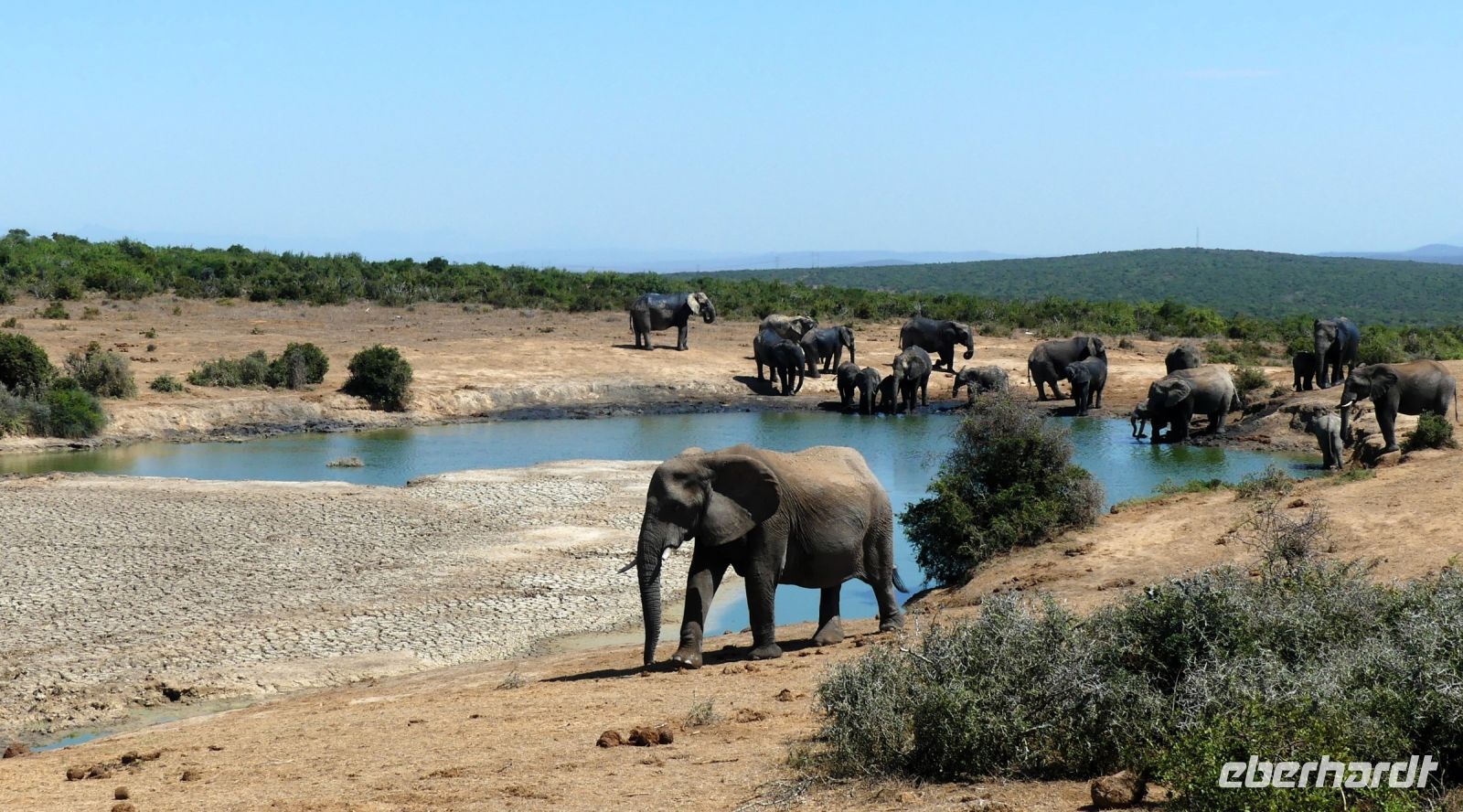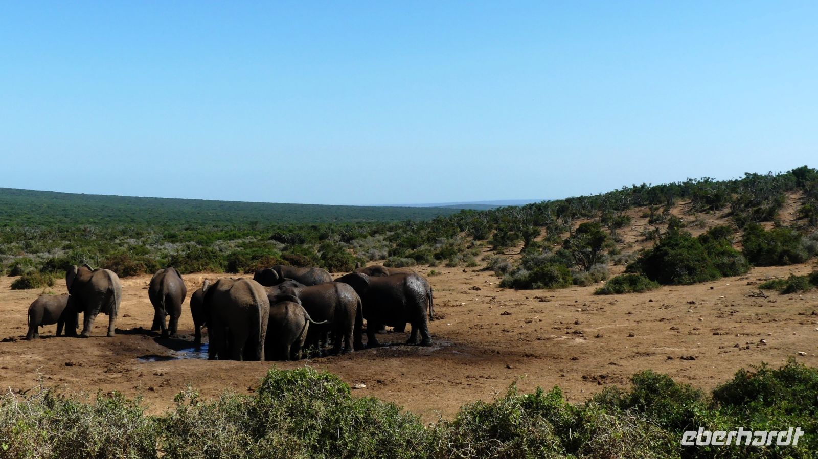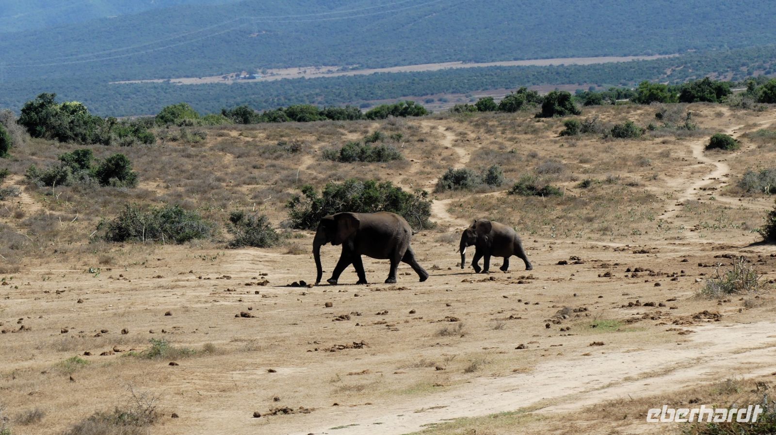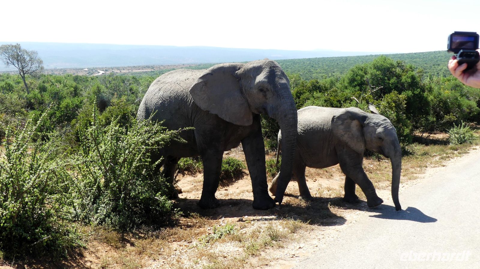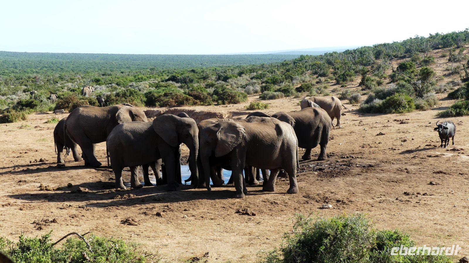 Nach dem Frühstück begrüßten uns Donald und Dencil, unsere Ranger für unsere Pirschfahrt im Addo. Wir bestiegen unsere komfortablen Jeeps und fuhren zum nicht weit entfernten Main Gate. Wir erfuhren, dass bereits 1931 ein kleines Gebiet von 2.500 Hektar als Schutzgebiet deklariert wurde, um die letzten, in dieser Region lebenden Elefanten zu retten. Damals waren es nur 16, über 600 sind es heute, die Zahl steigt ständig, da sie keine natürlichen Feinde haben. Heute erstreckt sich der Nationalpark bis zum Indischen Ozean auf 180.000 Hektar (inklusive des Meeresanteils). Somit beheimatet der Park nicht nur die Big 5, sondern die Big 7, denn Haie und Wale gehören dazu. Wir freuten uns auf einen sonnigen und elefantistischen Tag im Addo. Auf Schildern wurden wir hingewiesen, langsam zu fahren: Achtung Mistkäfer! Die Dung Beetles oder Pillendreher stehen sogar unter Artenschutz, verrichten sie doch den wichtigsten Job, das Putzen! Von der weit überschaubaren und grünen Landschaft, durchzogen mit Hügeln und gespickt mit zahlreichen Wasserlöchern waren wir verzaubert. Überall Speckbäume (Büsche) mit ihren saftig fleischigen Blättern, die hier das Hauptnahrungsmittel der grauen Riesen sind. Und dazwischen Elefanten, Elefanten, Elefanten, die natürlich die Haupttakteure im Park sind. Ob im Busch oder an den Wasserlöchern versammelt, mal in der Ferne, mal ganz hautnah! Was uns sofort auffiel, die meisten Weibchen haben keine Stoßzähne. Ein genetische Eigenart, die wahrscheinlich durch die Wilderei (Elfenbein) ausgelöst wurde. Heute versucht man frisches Blut in die Erbfolge zu bringen. z.B. wurde ein starker, männlicher Elefantenbulle aus dem Krüger Nationalpark in eine Herde integriert. Wir entdeckten Steppenzebras, Hartebeest, Schakal und die putzigen Warzenschweine; ein Sing-Habicht spähte die Umgebung aus, während ein Erdmännchen auf einem Busch on Top seinen Wachposten-Job sehr ernst nahm. Später kreuzte eine Straßenfamilie unseren Weg. Mama Strauß frühstückte und Papa Strauß sorgte sich liebevoll um den Nachwuchs - ein tierischer Morgen! Auf einer sicheren Anhöhe hielten wir für einen Boxenstopp. Mit frischen Kaffee genossen wir den Panoramablick, bevor wir weiter pirschten. Ab und zu hielten wir den Atem an, wenn Elefanten fast unseren Jeep streiften. Am Hapoor Wasserloch, welches nach einem sehr dominaten Bullen mit markanten Schlitz im Ohr benannt wurde, herrschte reger Betrieb: Elefanten-Schlammschlacht rechts, große Elefanten- und Zebraherden links und wir mittendrin. Der Hunger auf fotogene Elefanten war vorerst gestillt, nun waren wir dran. Auf Jacks Picknickplatz entzündeten Dencil und Donald das Feuer: Braai Time. Beim rustikalen Busch-BBQ wurden wir mit allerhand Leckereien bewirtet: Kudu-Wurst, Fleischspieß meets Salat und mehr. Baie Dankee, baie lekker. Gut gestärkt verspürten wir dennoch Hunger auf weitere Pirscherfolge: Warzenschweine, Büffel, Kudus, Schildi und einen Löwen. Wenn auch aus weiterer Entfernung, aber immerhin einer von den zwei Löwenmännchen, die hier im Addo mit 3 Löwinnen leben. Ein Tag voller elefantistischer Momente im Addo ging zu Ende. In unserer schönen Lodge verabschiedeten wir uns von Dencil und Donald, die diesen Tag besonders für uns gemacht haben. Beim leckeren Abendessen ließen wir den Tag noch einmal Revue passieren. Auch Fledermäuse waren wieder zu Gast, eine überlebte leider nicht;-).