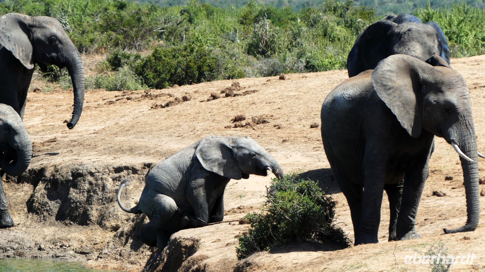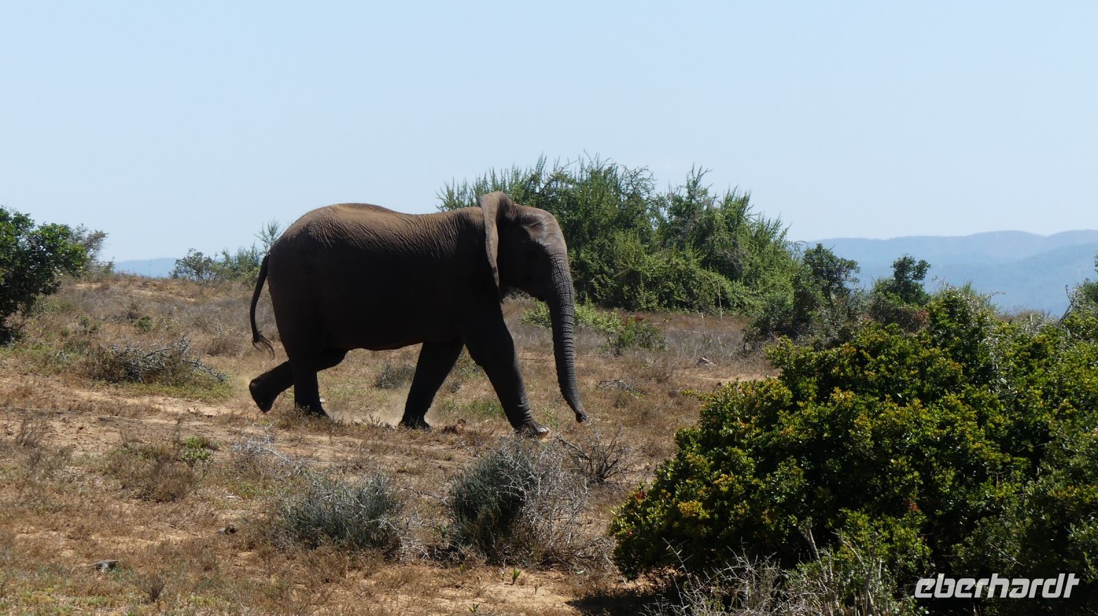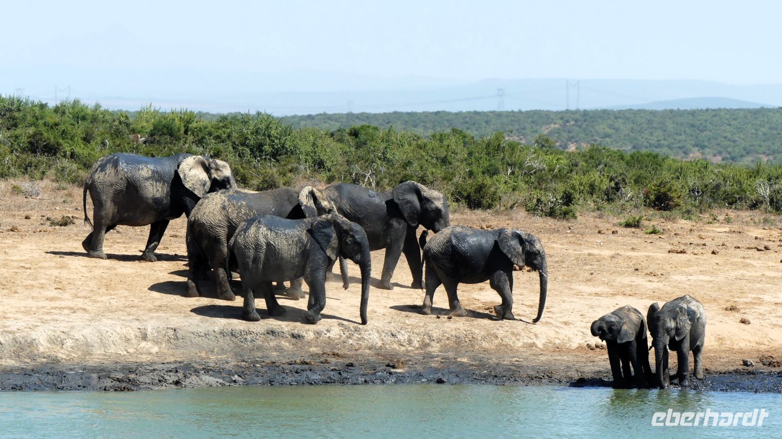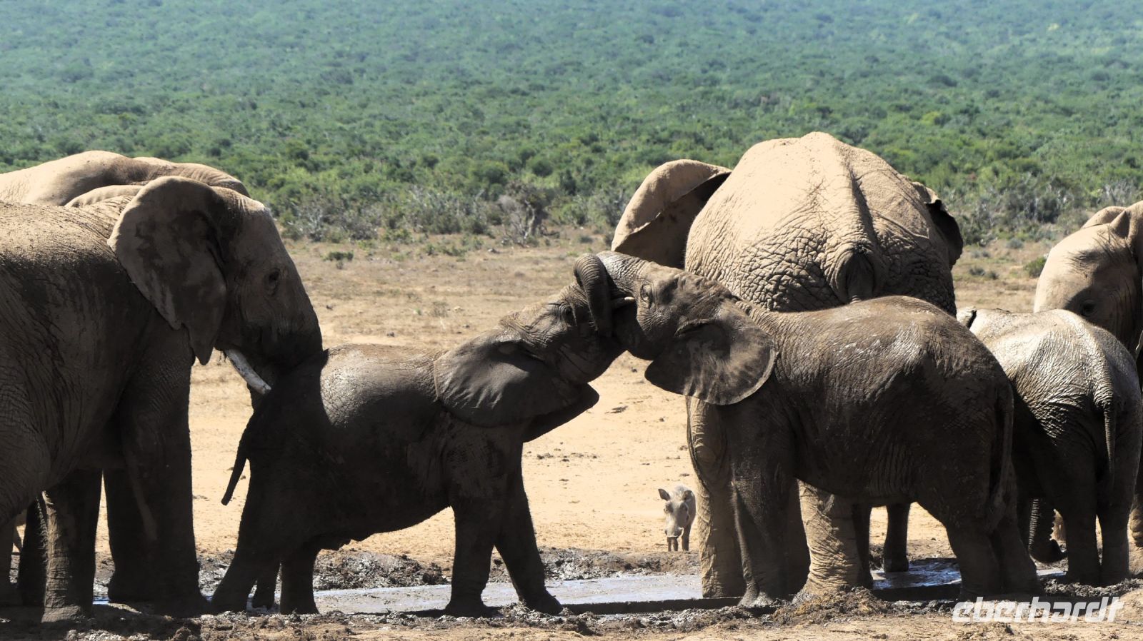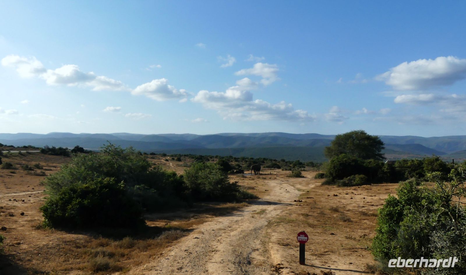 Nach dem Frühstück begrüßten uns Donald und Dencil, unsere Ranger für unsere Pirschfahrt im Addo. Wir bestiegen unsere komfortablen Jeeps und fuhren zum nicht weit entfernten Main Gate. Wir erfuhren, dass bereits 1931 ein kleines Gebiet von 2.500 Hektar als Schutzgebiet deklariert wurde, um die letzten, in dieser Region lebenden Elefanten zu retten. Damals waren es nur 16, über 600 sind es heute, die Zahl steigt ständig, da sie keine natürlichen Feinde haben. Heute erstreckt sich der Nationalpark bis zum Indischen Ozean auf 180.000 Hektar (inklusive des Meeresanteils). Somit beheimatet der Park nicht nur die Big 5, sondern die Big 7, denn Haie und Wale gehören dazu. Wir freuten uns auf einen sonnigen und elefantistischen Tag im Addo. Auf Schildern wurden wir hingewiesen, langsam zu fahren: Achtung Mistkäfer! Die Dung Beetles oder Pillendreher stehen sogar unter Artenschutz, verrichten sie doch den wichtigsten Job, das Putzen! Von der weit überschaubaren und grünen Landschaft, durchzogen mit Hügeln und gespickt mit zahlreichen Wasserlöchern waren wir verzaubert. Überall Speckbäume (Büsche) mit ihren saftig fleischigen Blättern, die hier das Hauptnahrungsmittel der grauen Riesen sind. Und dazwischen Elefanten, Elefanten, Elefanten, die natürlich die Haupttakteure im Park sind. Ob im Busch oder an den Wasserlöchern versammelt, mal in der Ferne, mal ganz hautnah! Was uns sofort auffiel, die meisten Weibchen haben keine Stoßzähne. Ein genetische Eigenart, die wahrscheinlich durch die Wilderei (Elfenbein) ausgelöst wurde. Heute versucht man frisches Blut in die Erbfolge zu bringen. z.B. wurde ein starker, männlicher Elefantenbulle aus dem Krüger Nationalpark in eine Herde integriert. Wir entdeckten Steppenzebras, Hartebeest, Schakal und die putzigen Warzenschweine; ein Sing-Habicht spähte die Umgebung aus, während ein Erdmännchen auf einem Busch on Top seinen Wachposten-Job sehr ernst nahm. Später kreuzte eine Straßenfamilie unseren Weg. Mama Strauß frühstückte und Papa Strauß sorgte sich liebevoll um den Nachwuchs - ein tierischer Morgen! Auf einer sicheren Anhöhe hielten wir für einen Boxenstopp. Mit frischen Kaffee genossen wir den Panoramablick, bevor wir weiter pirschten. Ab und zu hielten wir den Atem an, wenn Elefanten fast unseren Jeep streiften. Am Hapoor Wasserloch, welches nach einem sehr dominaten Bullen mit markanten Schlitz im Ohr benannt wurde, herrschte reger Betrieb: Elefanten-Schlammschlacht rechts, große Elefanten- und Zebraherden links und wir mittendrin. Der Hunger auf fotogene Elefanten war vorerst gestillt, nun waren wir dran. Auf Jacks Picknickplatz entzündeten Dencil und Donald das Feuer: Braai Time. Beim rustikalen Busch-BBQ wurden wir mit allerhand Leckereien bewirtet: Kudu-Wurst, Fleischspieß meets Salat und mehr. Baie Dankee, baie lekker. Gut gestärkt verspürten wir dennoch Hunger auf weitere Pirscherfolge: Warzenschweine, Büffel, Kudus, Schildi und einen Löwen. Wenn auch aus weiterer Entfernung, aber immerhin einer von den zwei Löwenmännchen, die hier im Addo mit 3 Löwinnen leben. Ein Tag voller elefantistischer Momente im Addo ging zu Ende. In unserer schönen Lodge verabschiedeten wir uns von Dencil und Donald, die diesen Tag besonders für uns gemacht haben. Beim leckeren Abendessen ließen wir den Tag noch einmal Revue passieren. Auch Fledermäuse waren wieder zu Gast, eine überlebte leider nicht;-).