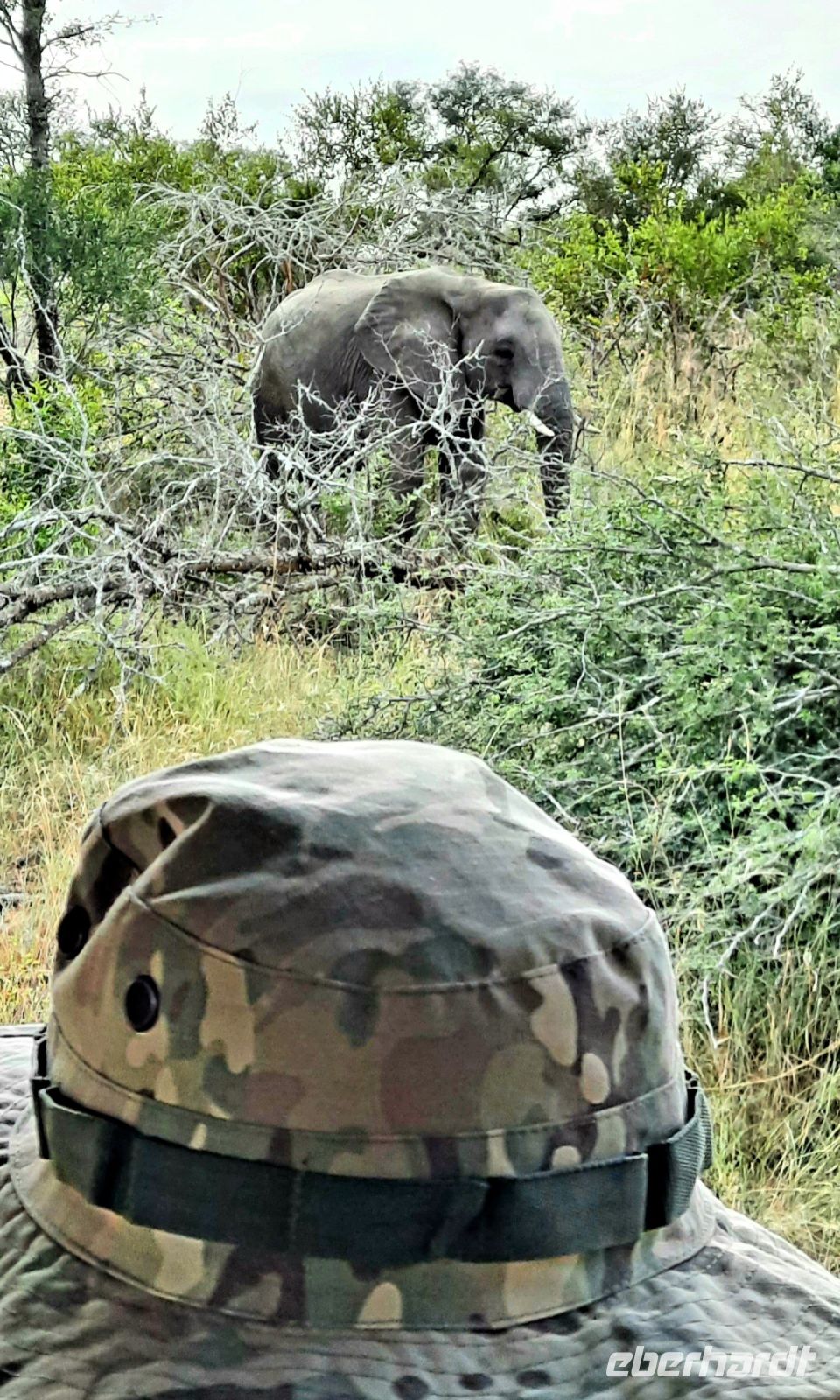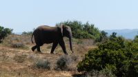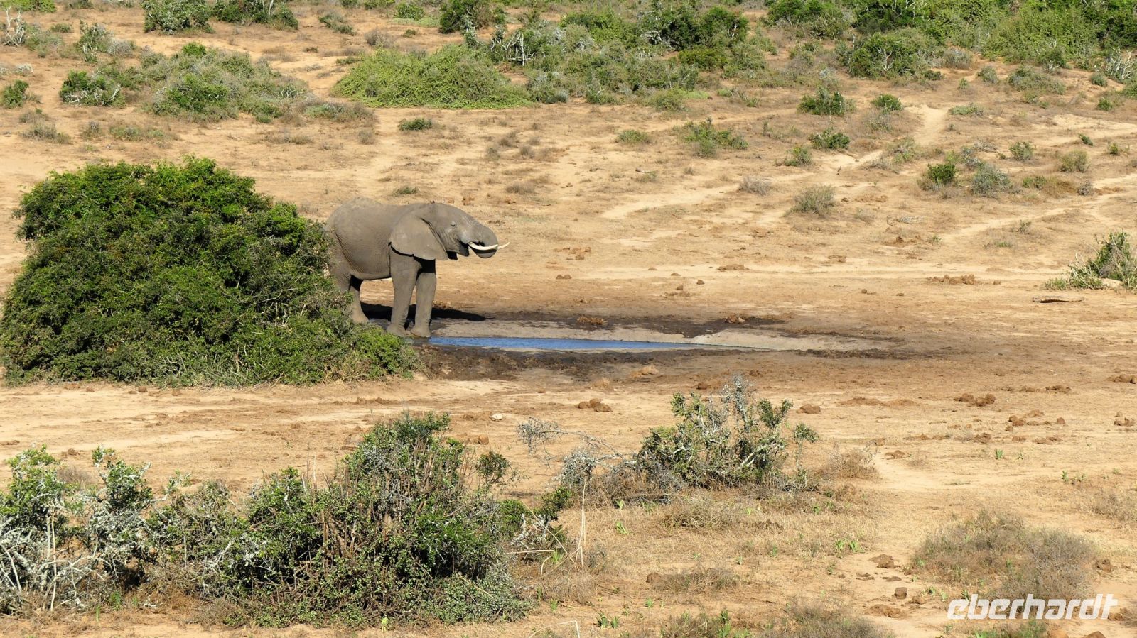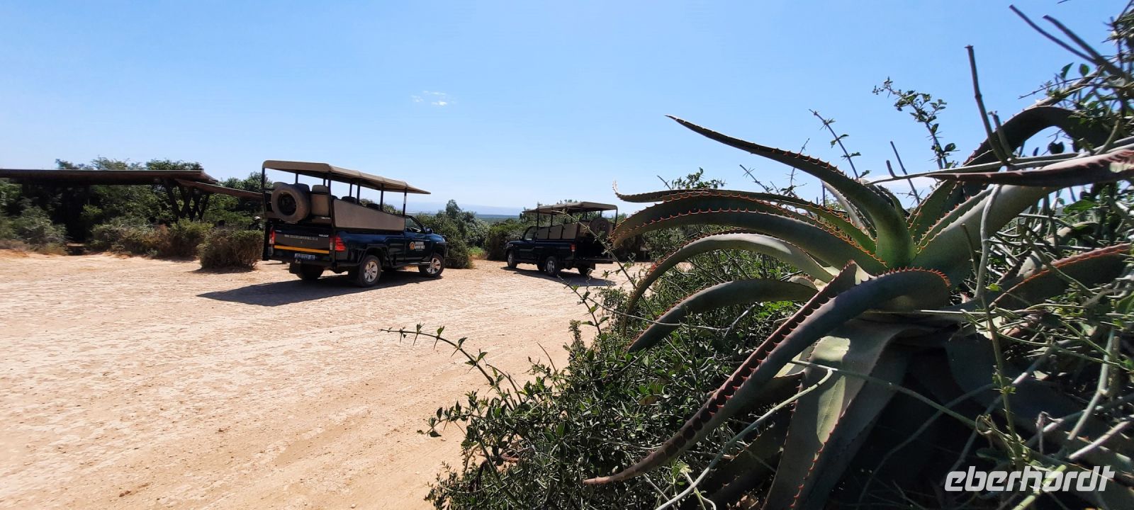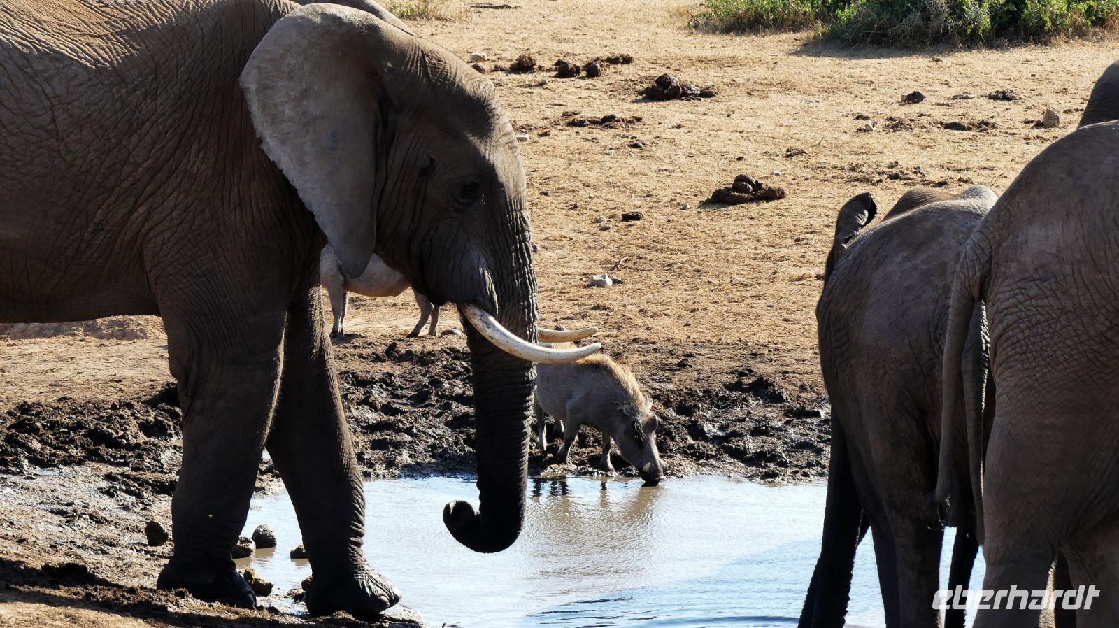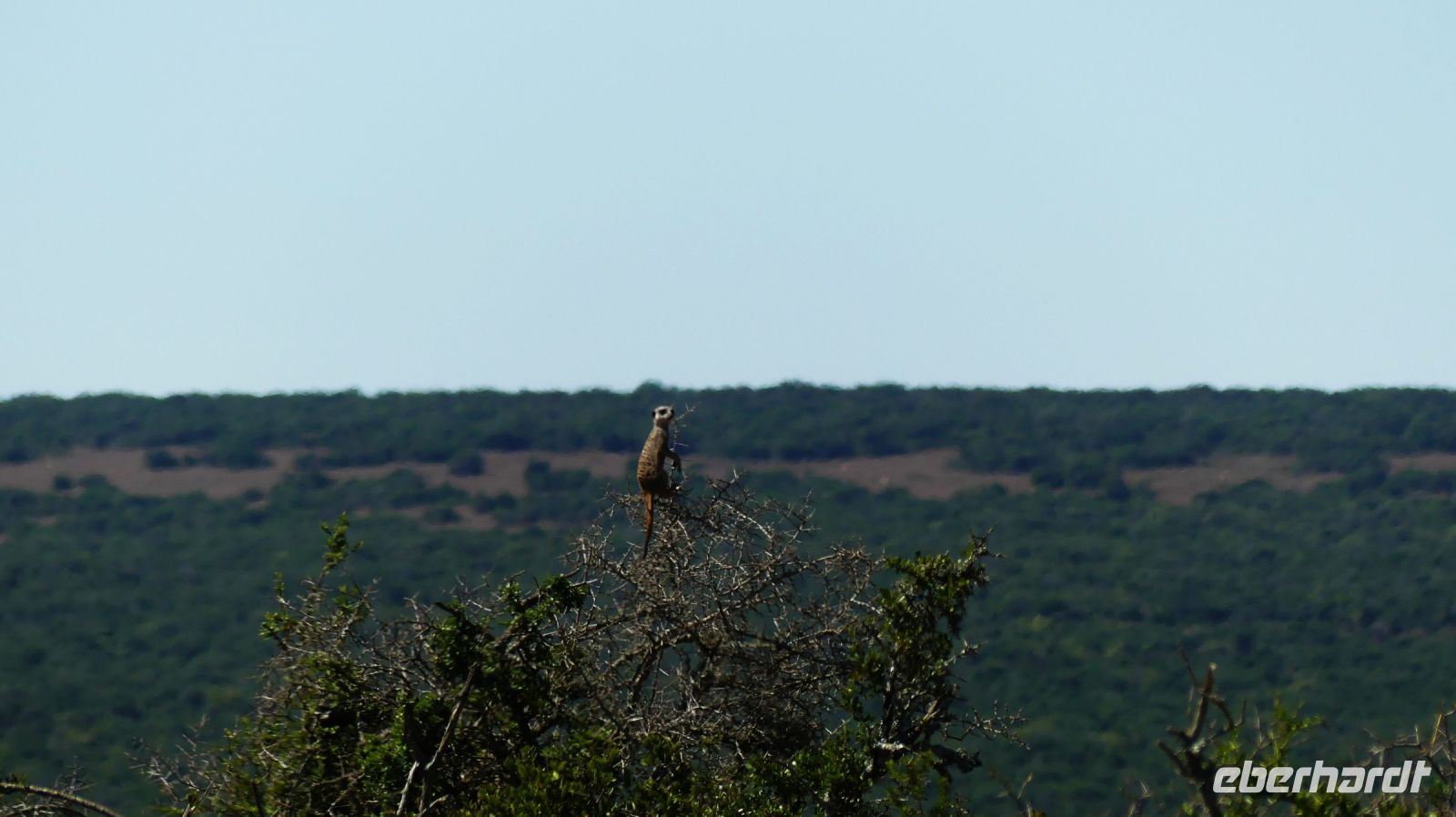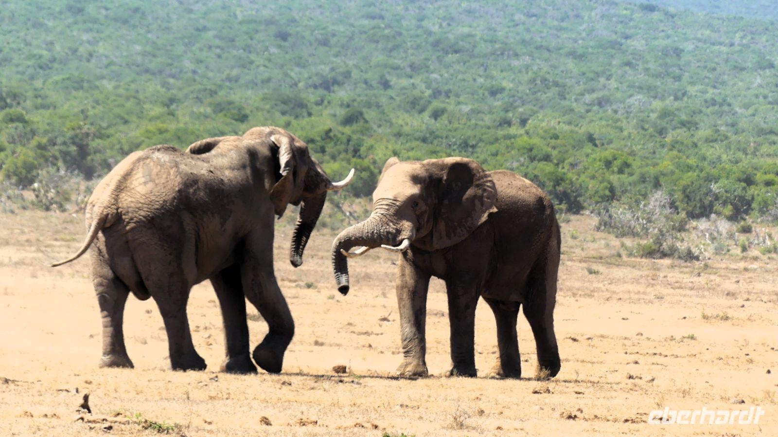 Nach dem Frühstück begrüßten uns Donald und Dencil, unsere Ranger für unsere Pirschfahrt im Addo. Wir bestiegen unsere komfortablen Jeeps und fuhren zum nicht weit entfernten Main Gate. Wir erfuhren, dass bereits 1931 ein kleines Gebiet von 2.500 Hektar als Schutzgebiet deklariert wurde, um die letzten, in dieser Region lebenden Elefanten zu retten. Damals waren es nur 16, über 600 sind es heute, die Zahl steigt ständig, da sie keine natürlichen Feinde haben. Heute erstreckt sich der Nationalpark bis zum Indischen Ozean auf 180.000 Hektar (inklusive des Meeresanteils). Somit beheimatet der Park nicht nur die Big 5, sondern die Big 7, denn Haie und Wale gehören dazu. Wir freuten uns auf einen sonnigen und elefantistischen Tag im Addo. Auf Schildern wurden wir hingewiesen, langsam zu fahren: Achtung Mistkäfer! Die Dung Beetles oder Pillendreher stehen sogar unter Artenschutz, verrichten sie doch den wichtigsten Job, das Putzen! Von der weit überschaubaren und grünen Landschaft, durchzogen mit Hügeln und gespickt mit zahlreichen Wasserlöchern waren wir verzaubert. Überall Speckbäume (Büsche) mit ihren saftig fleischigen Blättern, die hier das Hauptnahrungsmittel der grauen Riesen sind. Und dazwischen Elefanten, Elefanten, Elefanten, die natürlich die Haupttakteure im Park sind. Ob im Busch oder an den Wasserlöchern versammelt, mal in der Ferne, mal ganz hautnah! Was uns sofort auffiel, die meisten Weibchen haben keine Stoßzähne. Ein genetische Eigenart, die wahrscheinlich durch die Wilderei (Elfenbein) ausgelöst wurde. Heute versucht man frisches Blut in die Erbfolge zu bringen. z.B. wurde ein starker, männlicher Elefantenbulle aus dem Krüger Nationalpark in eine Herde integriert. Wir entdeckten Steppenzebras, Hartebeest, Schakal und die putzigen Warzenschweine; ein Sing-Habicht spähte die Umgebung aus, während ein Erdmännchen auf einem Busch on Top seinen Wachposten-Job sehr ernst nahm. Später kreuzte eine Straßenfamilie unseren Weg. Mama Strauß frühstückte und Papa Strauß sorgte sich liebevoll um den Nachwuchs - ein tierischer Morgen! Auf einer sicheren Anhöhe hielten wir für einen Boxenstopp. Mit frischen Kaffee genossen wir den Panoramablick, bevor wir weiter pirschten. Ab und zu hielten wir den Atem an, wenn Elefanten fast unseren Jeep streiften. Am Hapoor Wasserloch, welches nach einem sehr dominaten Bullen mit markanten Schlitz im Ohr benannt wurde, herrschte reger Betrieb: Elefanten-Schlammschlacht rechts, große Elefanten- und Zebraherden links und wir mittendrin. Der Hunger auf fotogene Elefanten war vorerst gestillt, nun waren wir dran. Auf Jacks Picknickplatz entzündeten Dencil und Donald das Feuer: Braai Time. Beim rustikalen Busch-BBQ wurden wir mit allerhand Leckereien bewirtet: Kudu-Wurst, Fleischspieß meets Salat und mehr. Baie Dankee, baie lekker. Gut gestärkt verspürten wir dennoch Hunger auf weitere Pirscherfolge: Warzenschweine, Büffel, Kudus, Schildi und einen Löwen. Wenn auch aus weiterer Entfernung, aber immerhin einer von den zwei Löwenmännchen, die hier im Addo mit 3 Löwinnen leben. Ein Tag voller elefantistischer Momente im Addo ging zu Ende. In unserer schönen Lodge verabschiedeten wir uns von Dencil und Donald, die diesen Tag besonders für uns gemacht haben. Beim leckeren Abendessen ließen wir den Tag noch einmal Revue passieren. Auch Fledermäuse waren wieder zu Gast, eine überlebte leider nicht;-).