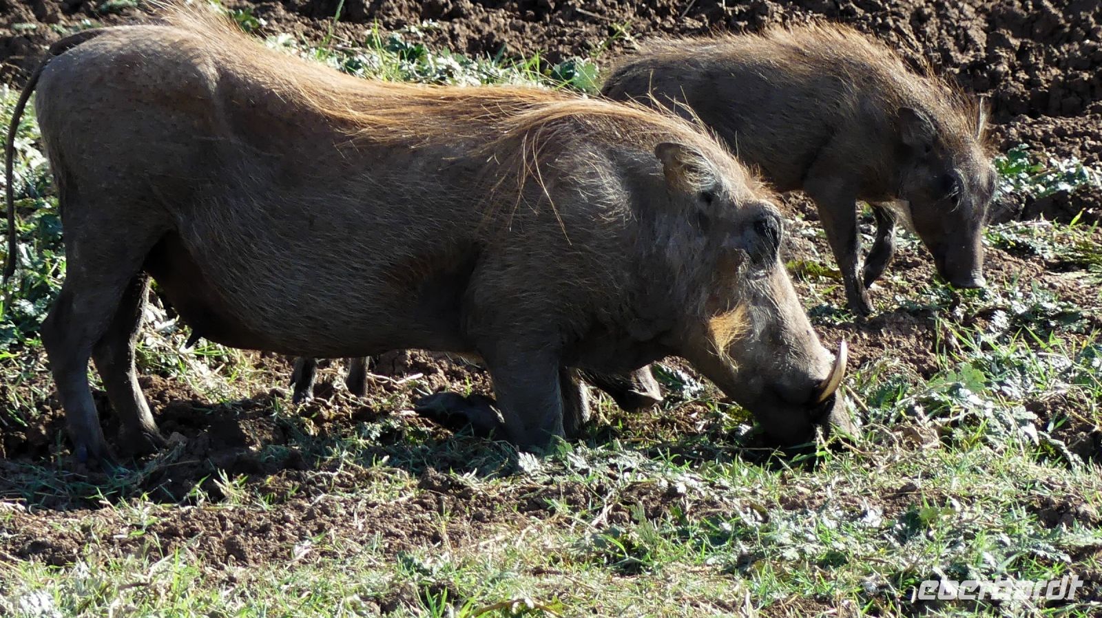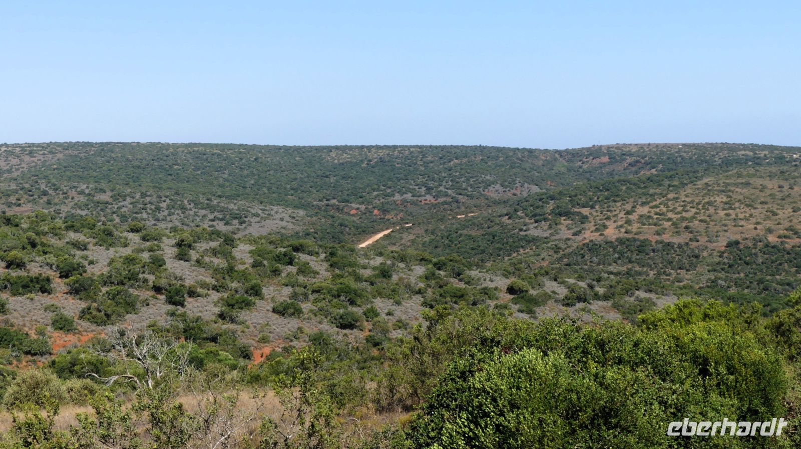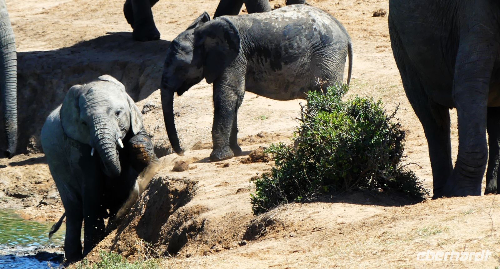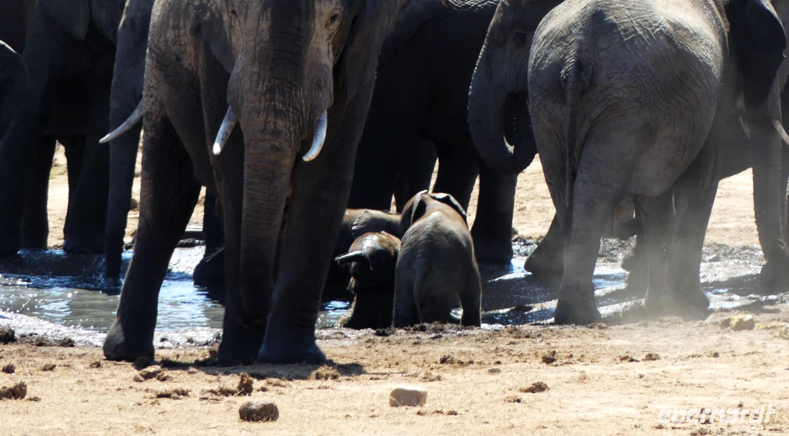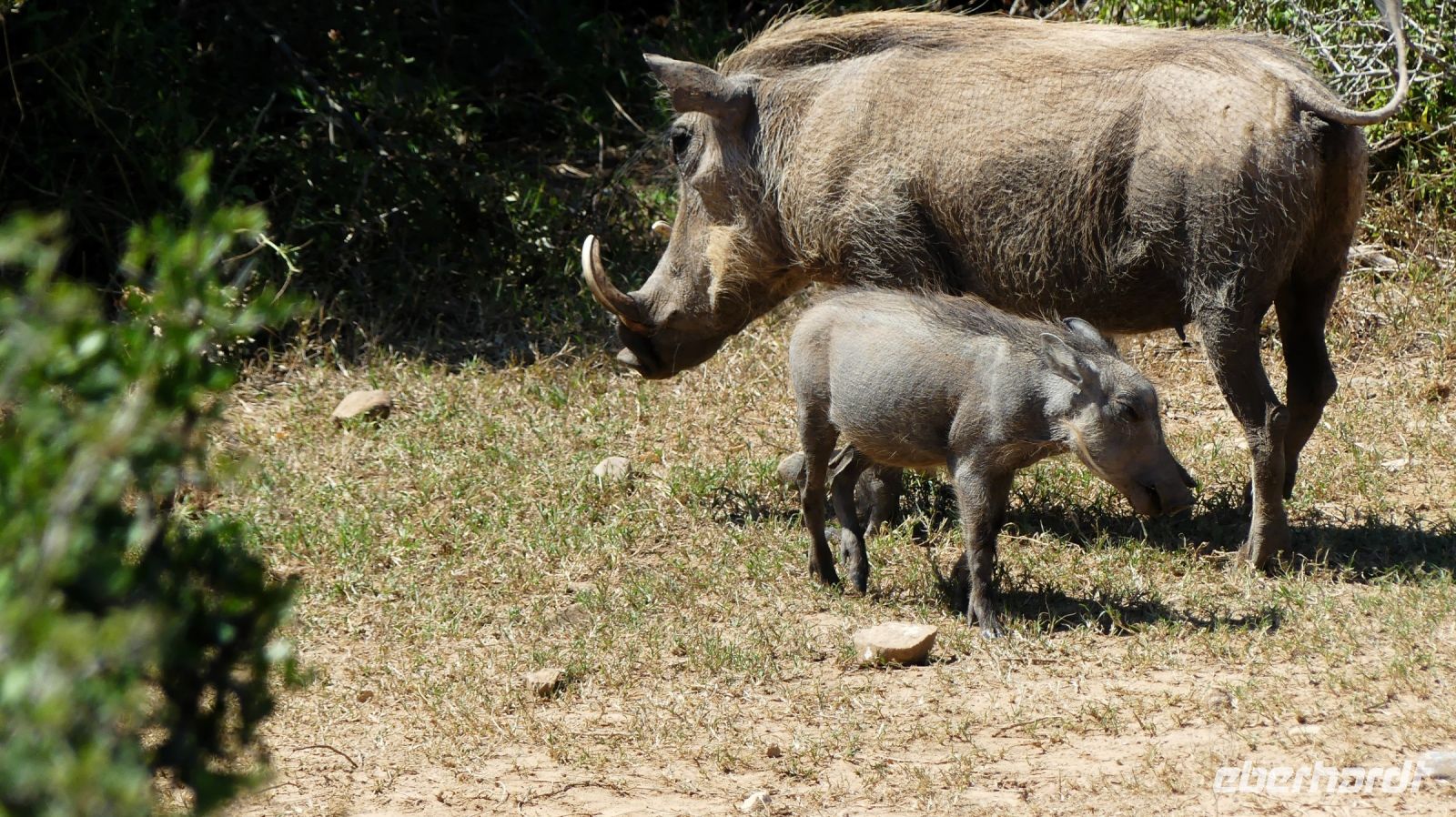 Nach dem Frühstück begrüßten uns Donald und Dencil, unsere Ranger für unsere Pirschfahrt im Addo. Wir bestiegen unsere komfortablen Jeeps und fuhren zum nicht weit entfernten Main Gate. Wir erfuhren, dass bereits 1931 ein kleines Gebiet von 2.500 Hektar als Schutzgebiet deklariert wurde, um die letzten, in dieser Region lebenden Elefanten zu retten. Damals waren es nur 16, über 600 sind es heute, die Zahl steigt ständig, da sie keine natürlichen Feinde haben. Heute erstreckt sich der Nationalpark bis zum Indischen Ozean auf 180.000 Hektar (inklusive des Meeresanteils). Somit beheimatet der Park nicht nur die Big 5, sondern die Big 7, denn Haie und Wale gehören dazu. Wir freuten uns auf einen sonnigen und elefantistischen Tag im Addo. Auf Schildern wurden wir hingewiesen, langsam zu fahren: Achtung Mistkäfer! Die Dung Beetles oder Pillendreher stehen sogar unter Artenschutz, verrichten sie doch den wichtigsten Job, das Putzen! Von der weit überschaubaren und grünen Landschaft, durchzogen mit Hügeln und gespickt mit zahlreichen Wasserlöchern waren wir verzaubert. Überall Speckbäume (Büsche) mit ihren saftig fleischigen Blättern, die hier das Hauptnahrungsmittel der grauen Riesen sind. Und dazwischen Elefanten, Elefanten, Elefanten, die natürlich die Haupttakteure im Park sind. Ob im Busch oder an den Wasserlöchern versammelt, mal in der Ferne, mal ganz hautnah! Was uns sofort auffiel, die meisten Weibchen haben keine Stoßzähne. Ein genetische Eigenart, die wahrscheinlich durch die Wilderei (Elfenbein) ausgelöst wurde. Heute versucht man frisches Blut in die Erbfolge zu bringen. z.B. wurde ein starker, männlicher Elefantenbulle aus dem Krüger Nationalpark in eine Herde integriert. Wir entdeckten Steppenzebras, Hartebeest, Schakal und die putzigen Warzenschweine; ein Sing-Habicht spähte die Umgebung aus, während ein Erdmännchen auf einem Busch on Top seinen Wachposten-Job sehr ernst nahm. Später kreuzte eine Straßenfamilie unseren Weg. Mama Strauß frühstückte und Papa Strauß sorgte sich liebevoll um den Nachwuchs - ein tierischer Morgen! Auf einer sicheren Anhöhe hielten wir für einen Boxenstopp. Mit frischen Kaffee genossen wir den Panoramablick, bevor wir weiter pirschten. Ab und zu hielten wir den Atem an, wenn Elefanten fast unseren Jeep streiften. Am Hapoor Wasserloch, welches nach einem sehr dominaten Bullen mit markanten Schlitz im Ohr benannt wurde, herrschte reger Betrieb: Elefanten-Schlammschlacht rechts, große Elefanten- und Zebraherden links und wir mittendrin. Der Hunger auf fotogene Elefanten war vorerst gestillt, nun waren wir dran. Auf Jacks Picknickplatz entzündeten Dencil und Donald das Feuer: Braai Time. Beim rustikalen Busch-BBQ wurden wir mit allerhand Leckereien bewirtet: Kudu-Wurst, Fleischspieß meets Salat und mehr. Baie Dankee, baie lekker. Gut gestärkt verspürten wir dennoch Hunger auf weitere Pirscherfolge: Warzenschweine, Büffel, Kudus, Schildi und einen Löwen. Wenn auch aus weiterer Entfernung, aber immerhin einer von den zwei Löwenmännchen, die hier im Addo mit 3 Löwinnen leben. Ein Tag voller elefantistischer Momente im Addo ging zu Ende. In unserer schönen Lodge verabschiedeten wir uns von Dencil und Donald, die diesen Tag besonders für uns gemacht haben. Beim leckeren Abendessen ließen wir den Tag noch einmal Revue passieren. Auch Fledermäuse waren wieder zu Gast, eine überlebte leider nicht;-).