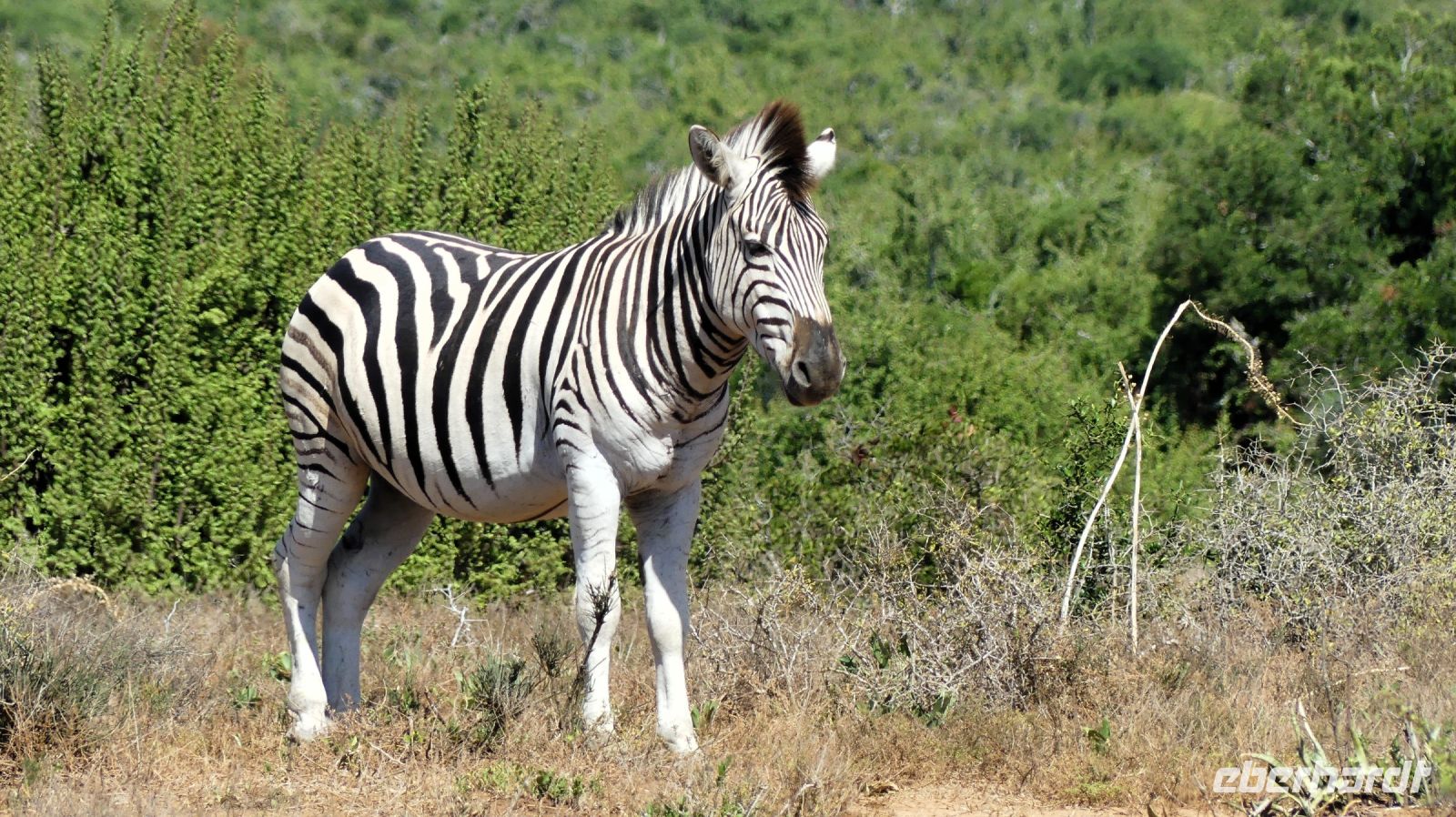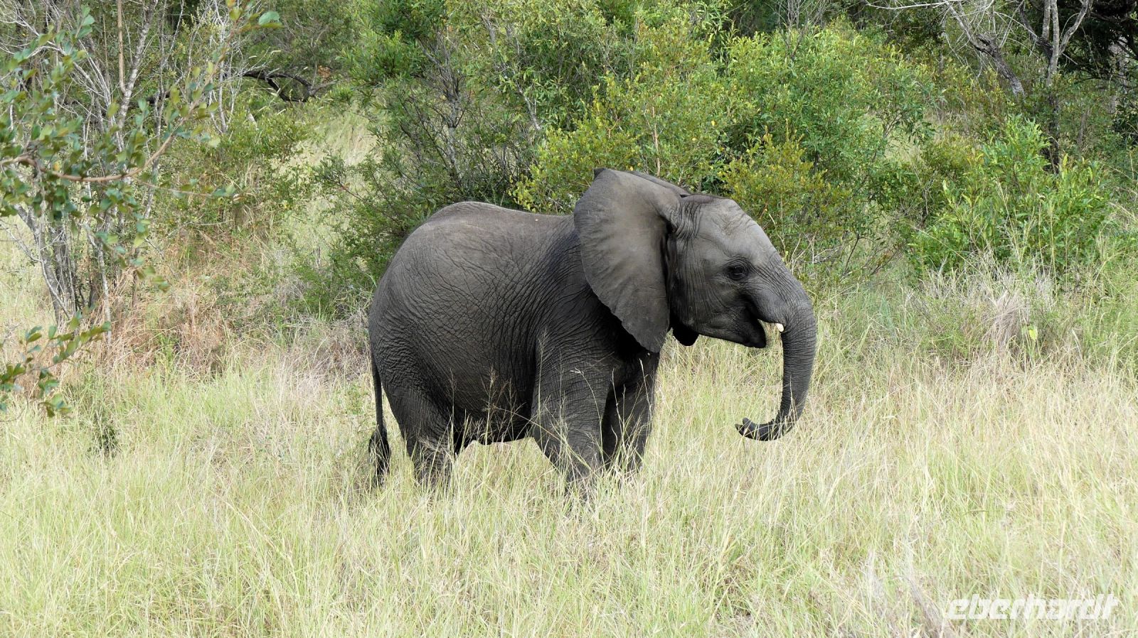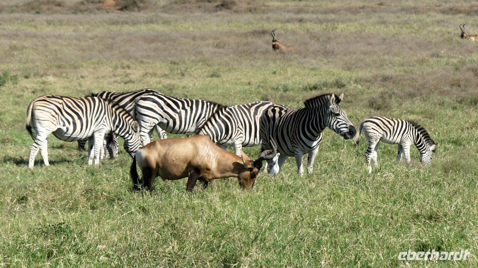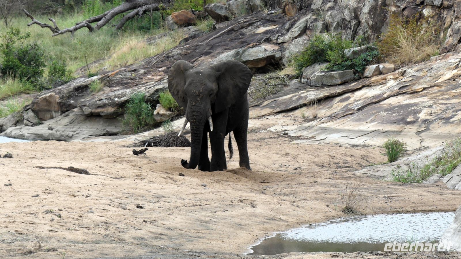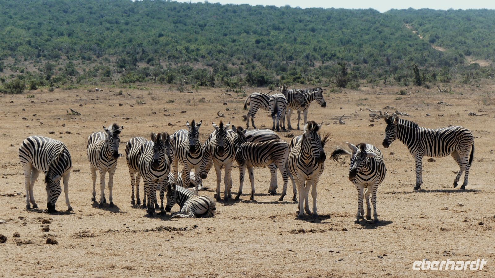 Nach dem Frühstück begrüßten uns Donald und Dencil, unsere Ranger für unsere Pirschfahrt im Addo. Wir bestiegen unsere komfortablen Jeeps und fuhren zum nicht weit entfernten Main Gate. Wir erfuhren, dass bereits 1931 ein kleines Gebiet von 2.500 Hektar als Schutzgebiet deklariert wurde, um die letzten, in dieser Region lebenden Elefanten zu retten. Damals waren es nur 16, über 600 sind es heute, die Zahl steigt ständig, da sie keine natürlichen Feinde haben. Heute erstreckt sich der Nationalpark bis zum Indischen Ozean auf 180.000 Hektar (inklusive des Meeresanteils). Somit beheimatet der Park nicht nur die Big 5, sondern die Big 7, denn Haie und Wale gehören dazu. Wir freuten uns auf einen sonnigen und elefantistischen Tag im Addo. Auf Schildern wurden wir hingewiesen, langsam zu fahren: Achtung Mistkäfer! Die Dung Beetles oder Pillendreher stehen sogar unter Artenschutz, verrichten sie doch den wichtigsten Job, das Putzen! Von der weit überschaubaren und grünen Landschaft, durchzogen mit Hügeln und gespickt mit zahlreichen Wasserlöchern waren wir verzaubert. Überall Speckbäume (Büsche) mit ihren saftig fleischigen Blättern, die hier das Hauptnahrungsmittel der grauen Riesen sind. Und dazwischen Elefanten, Elefanten, Elefanten, die natürlich die Haupttakteure im Park sind. Ob im Busch oder an den Wasserlöchern versammelt, mal in der Ferne, mal ganz hautnah! Was uns sofort auffiel, die meisten Weibchen haben keine Stoßzähne. Ein genetische Eigenart, die wahrscheinlich durch die Wilderei (Elfenbein) ausgelöst wurde. Heute versucht man frisches Blut in die Erbfolge zu bringen. z.B. wurde ein starker, männlicher Elefantenbulle aus dem Krüger Nationalpark in eine Herde integriert. Wir entdeckten Steppenzebras, Hartebeest, Schakal und die putzigen Warzenschweine; ein Sing-Habicht spähte die Umgebung aus, während ein Erdmännchen auf einem Busch on Top seinen Wachposten-Job sehr ernst nahm. Später kreuzte eine Straßenfamilie unseren Weg. Mama Strauß frühstückte und Papa Strauß sorgte sich liebevoll um den Nachwuchs - ein tierischer Morgen! Auf einer sicheren Anhöhe hielten wir für einen Boxenstopp. Mit frischen Kaffee genossen wir den Panoramablick, bevor wir weiter pirschten. Ab und zu hielten wir den Atem an, wenn Elefanten fast unseren Jeep streiften. Am Hapoor Wasserloch, welches nach einem sehr dominaten Bullen mit markanten Schlitz im Ohr benannt wurde, herrschte reger Betrieb: Elefanten-Schlammschlacht rechts, große Elefanten- und Zebraherden links und wir mittendrin. Der Hunger auf fotogene Elefanten war vorerst gestillt, nun waren wir dran. Auf Jacks Picknickplatz entzündeten Dencil und Donald das Feuer: Braai Time. Beim rustikalen Busch-BBQ wurden wir mit allerhand Leckereien bewirtet: Kudu-Wurst, Fleischspieß meets Salat und mehr. Baie Dankee, baie lekker. Gut gestärkt verspürten wir dennoch Hunger auf weitere Pirscherfolge: Warzenschweine, Büffel, Kudus, Schildi und einen Löwen. Wenn auch aus weiterer Entfernung, aber immerhin einer von den zwei Löwenmännchen, die hier im Addo mit 3 Löwinnen leben. Ein Tag voller elefantistischer Momente im Addo ging zu Ende. In unserer schönen Lodge verabschiedeten wir uns von Dencil und Donald, die diesen Tag besonders für uns gemacht haben. Beim leckeren Abendessen ließen wir den Tag noch einmal Revue passieren. Auch Fledermäuse waren wieder zu Gast, eine überlebte leider nicht;-).