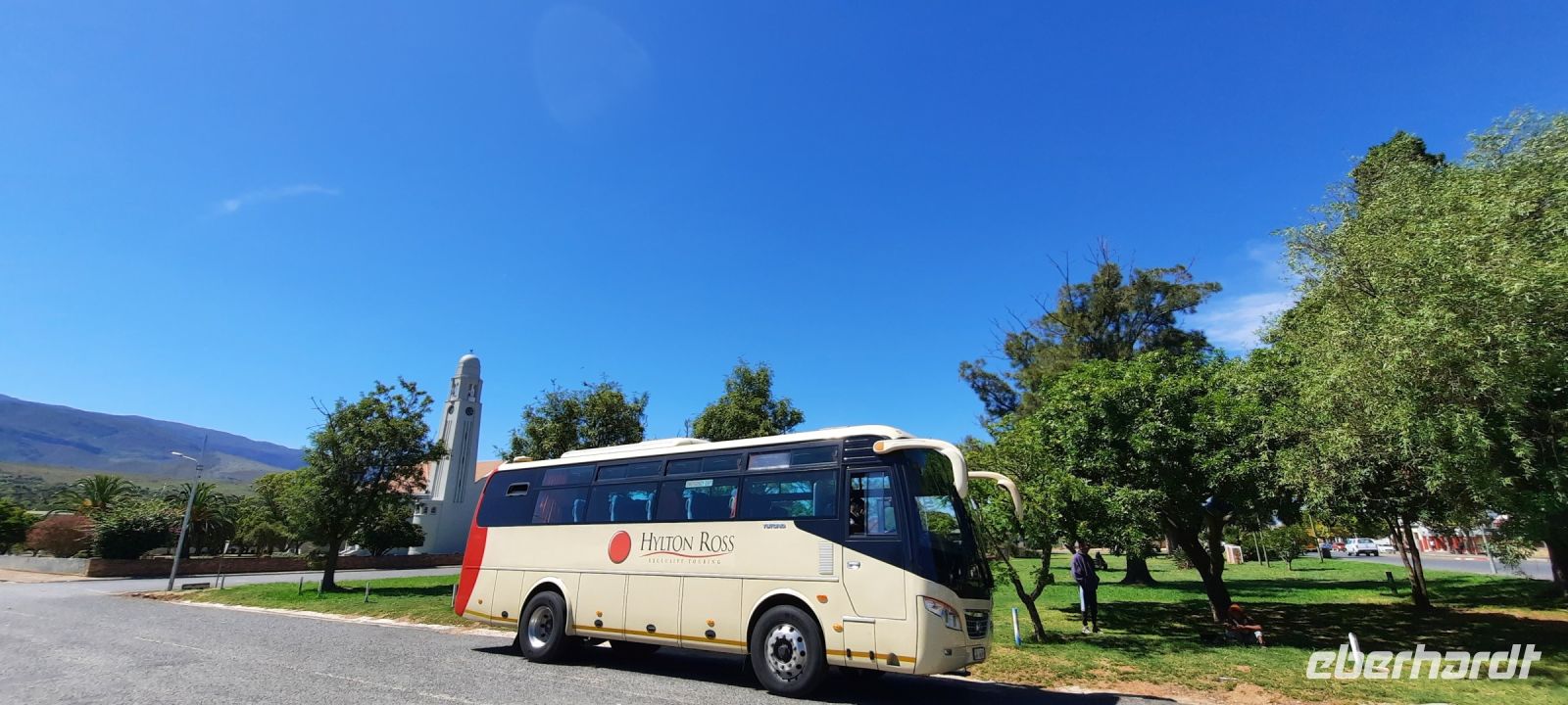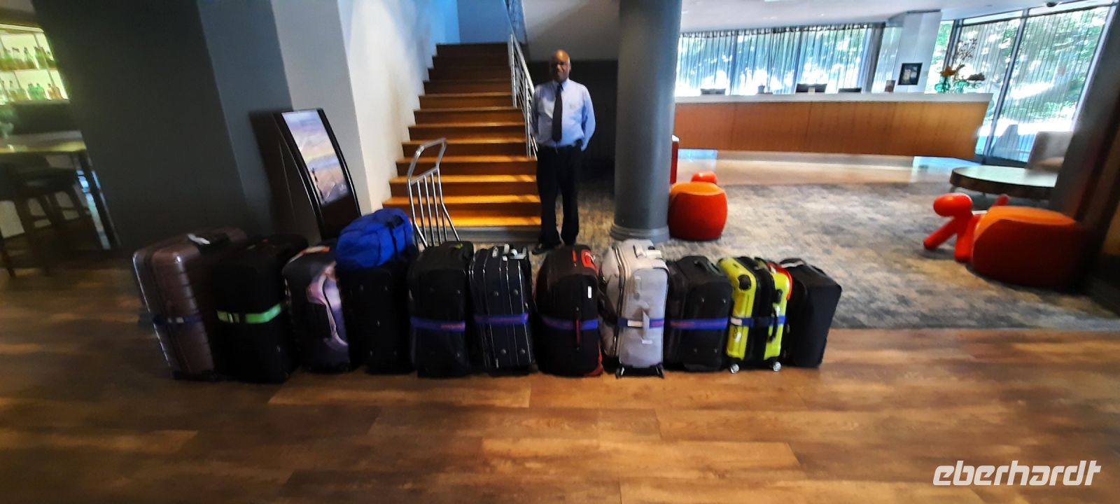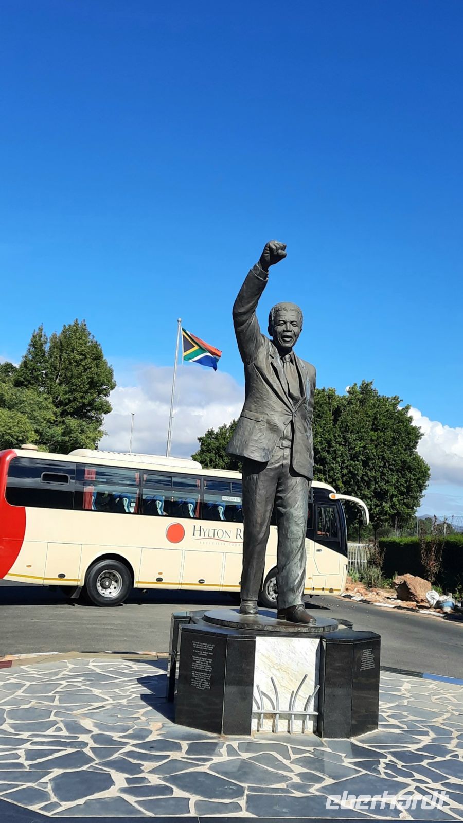 Am frühen Morgen landeten wir im südafrikanischen Johannesburg. Passkontrolle war easy und bald darauf konnten wir unsere Koffer vollzählig in Empfang nehmen. Am Ausgang begrüßte uns Frans, unser örtlicher Reiseleiter. Schnell noch Geld getauscht und ins sommerliche Outfit gehüpft - es konnte losgehen. Draußen wartete schon Benton mit seinem großen Bus, in dem alles schnell verstaut war. Für unser kleines Grüppchen stand ein Riesen-Reisebus zur Verfügung, theoretisch für jeden ein Fensterplatz. Auf einer kleinen City-Tour erkundeten wir per Bus die Mega-Metropole Johannesburg, das wirtschaftliche Zentrum Südafrikas. Kurze Zeit später, nach einem Zwischenstopp in einer Shopping-Mall, fuhren in das ca. 30 km entfernte Pretoria. Die Hauptstadt Südafrikas präsentierte uns im grünen Gewand und es warm wollig warm. Nach dem langen Flug stärkten wir uns erst einmal im Huckleberry, einem kleinen Cafe in einer schönen Parkanlage. Anschließend besichtigten das Voortrekker-Monument, welches uns die Geschichte der Buren (Bauern) anschaulich näher brachte. Im Inneren wird die Geschichte der Buren (Bauern) auf großen Marmor-Reliefs bildlich erzählt. Auch hoch über Stadt ragen die Union Buildings, dem Verwaltungssitz des Parlaments. Von hier oben hatten wir ebenfalls einen fantastischen Blick über die grüne Stadt. Wir liefen ein kurzes Stück durch den Park zur überdimensionalen Mandela-Statue. Daneben ist ein kleines Protest-Camp der San entstanden. So machen die San-People auf ihre Situation aufmerksam und fordern ihre offizielle Anerkennung von der Regierung. Rings herum befindet sich das elegante, ruhige Botschafts- und Universitätsviertel und auch unsere erste Unterkunft, das Courtyard Arcadia Hotel, wo wir beim gemeinsamen Abendessen und einem Gläschen Wein den ersten Tag ausklingen ließen.