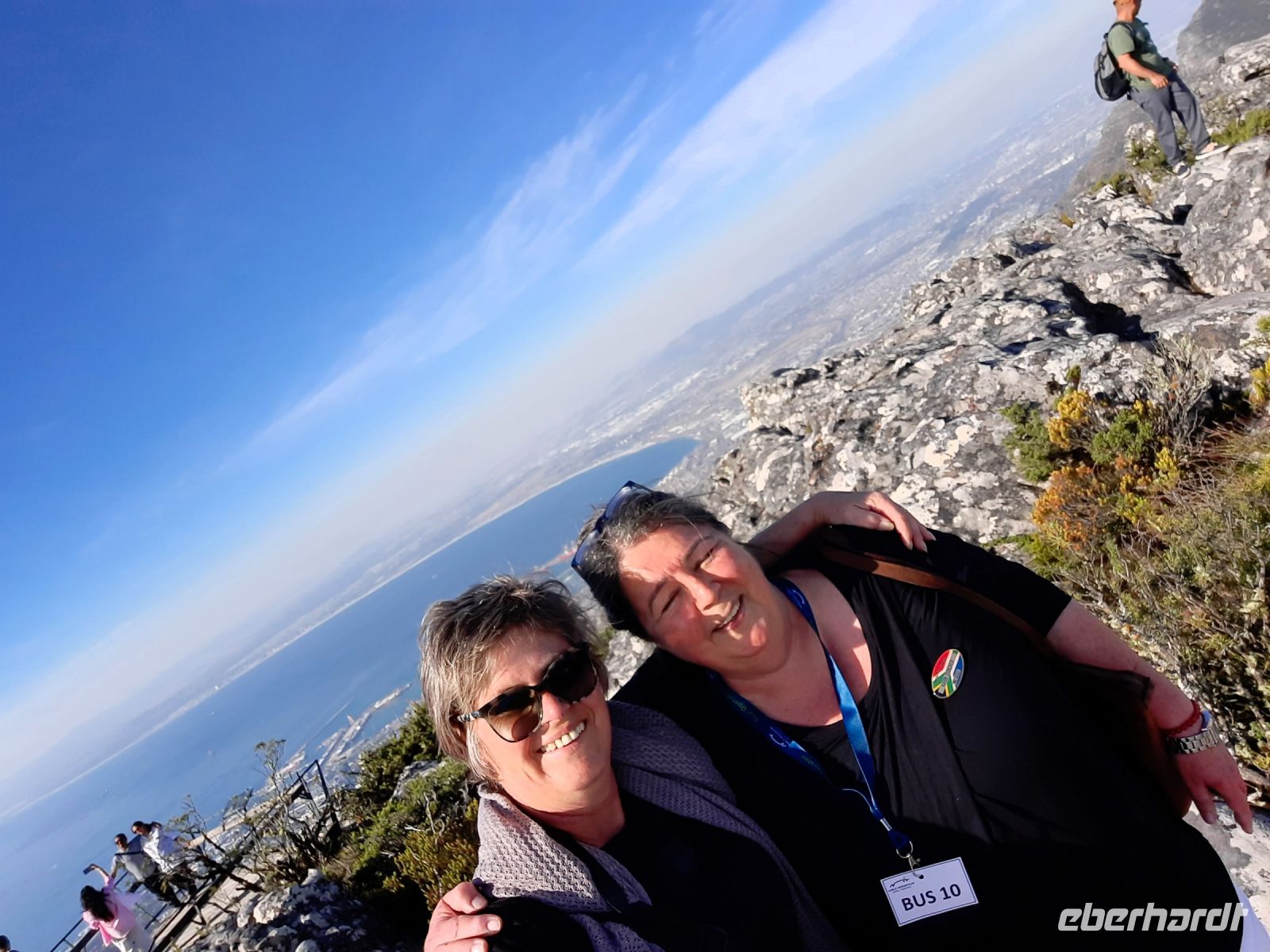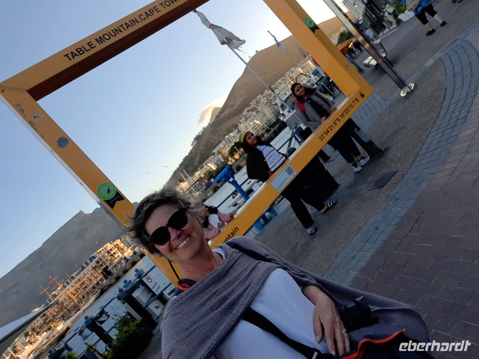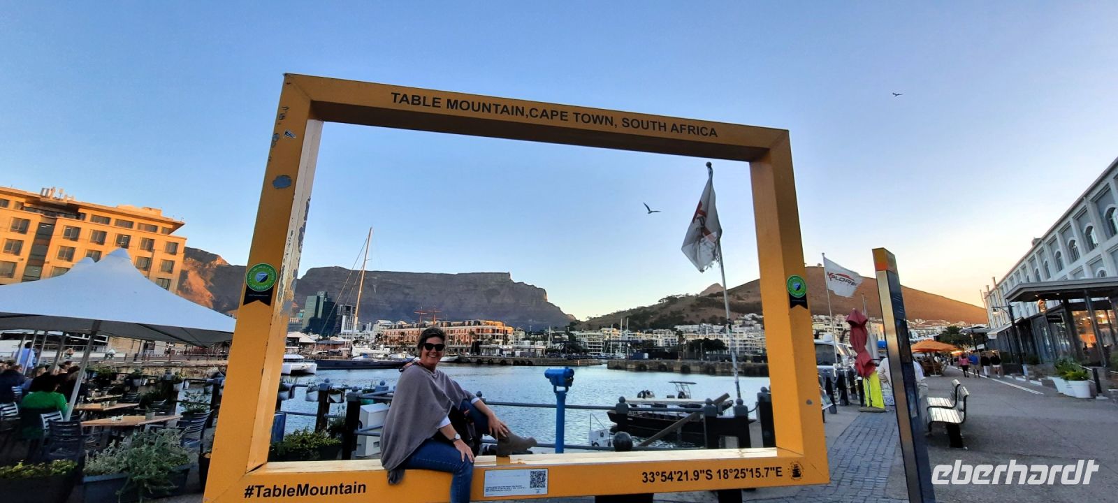 Vorbei an Kornfeldern und weitem Farmland, auf den sich Paradieskraniche tummelten sowie Rinder und Schafe weideten, fuhren wir in westliche Richtung. Bei Albertinia hielte wir an einer Aloenfarm und deckten uns mit natürlichen Beauty-Produkten ein. Aha, deshalb beindet sich ganz in der Nähe die Sleeping Beauty! Genauer gesagt, ist es eine Bergkette, die wie eine schlafende Schönheit aussieht. Annett`s Fantasie reichte leider nicht aus, um diese wirklich zu erkennen. Deutlich sichtbar dagegen waren die Sleeping Beautys später im Bus, die Augenpflege betrieben. In der alten Bäckerei Ou Meul (Alte Mühle) in Riversonderend gab es hausgemachte Leckereien und guten Kaffee, genau das Richtige für unsere Pause. Am frühen Nachmittag empfing uns Kapstadt gebührend mit Kaiserwetter. Kapstadt, eine der schönsten Städte der Welt! Davon konnten wir uns sogleich überzeugen. Mit vorab gebuchten Fast Track Tickets gelangten wir schnell auf den majestätischen Tafelberg. Schon die Auffahrt mit der Gondel-Seilbahn (Bauherren natürlich die Schweizer) war ein Erlebnis. Keiner musste drängeln, denn diese dreht sich während der Fahrt um 360 Grad. WOW, welche Ausblicke bei klarer Sicht und Sonnenschein. Liebe Reisegäste, das habt Ihr Euch verdient! Auf einem Rundweg boten sich uns jeder Menge atemberaubende Ausblicke. Kein Wunder, dass nun ganz individuelle Fotoshootings folgten. Begeistert vom Empfang in der Mutterstadt fuhren wir zu unserem komfortablen Hotel unterhalb des Tafelbergs. Am Abend chauffierte uns Humphrey zum Fischrestaurant Sea Breeze, wo wir herzlich empfangen wurden. Unsere Tafel im Private Room war festlich eingedeckt und der Service war perfekt. Ein leckerer und schöner Abschluss unseres ersten Tages in Kapstadt. Glücklich und satt fielen wir später in unsere Betten.