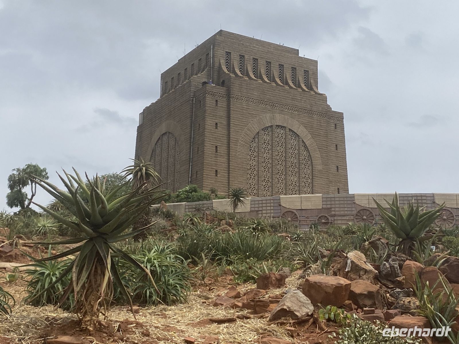 Nach einem langem Flug, erreichen wir Johannesburg, wo uns unser örtlicher Guide Frans (van Nieuwkerk) nach der Pass- und Zollkontrolle empfängt. Nach Geldtausch und keinen Einkäufen beginnt unsere Rundreise mit der Fahrt nach Pretoria, der Hauptstadt Südafrikas. Am Voortrekker Monument stoppen wir und besichtigen das Museum und besteigen das hohe Bauwerk. Mit einem herrlichen Bick auf Pretoria und die Umgebung werden wir belohnt. Danach fahren wir ins Zentrum der Stadt und besichtigen das Paul Kruger House. Eine kleine Stadtrundfahrt, mit Blick aber leider ohne Stopp am Church Square, folgt. Dafür erfreuen wir uns an blühenden Jacaranda Bäumen, die aus dem tropischen Gebieten Südamerikas stammen und die Straßen und Gärten Pretorias zieren. Den Abend mit einem 3-Gang-Menü und dem Kennenlernen des guten südafrikanischen Weines, sowie die Nacht verbrachten wir im Opi Kopi Guesthouse.