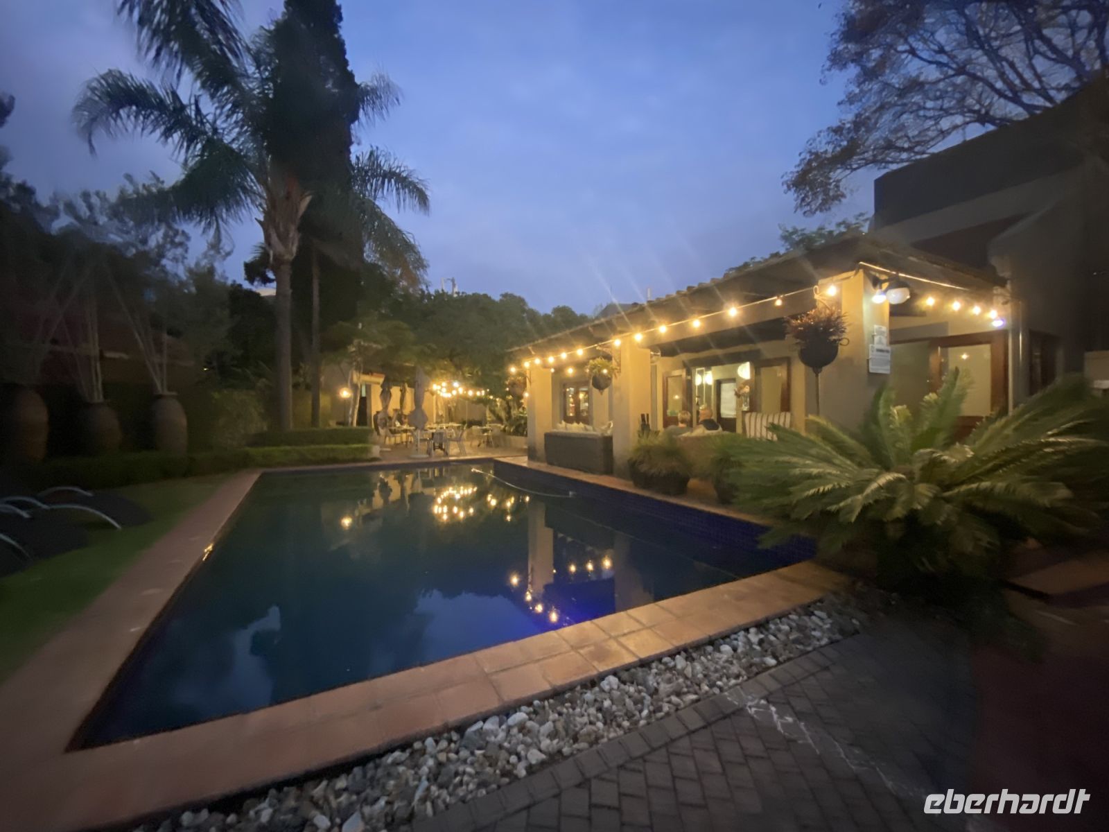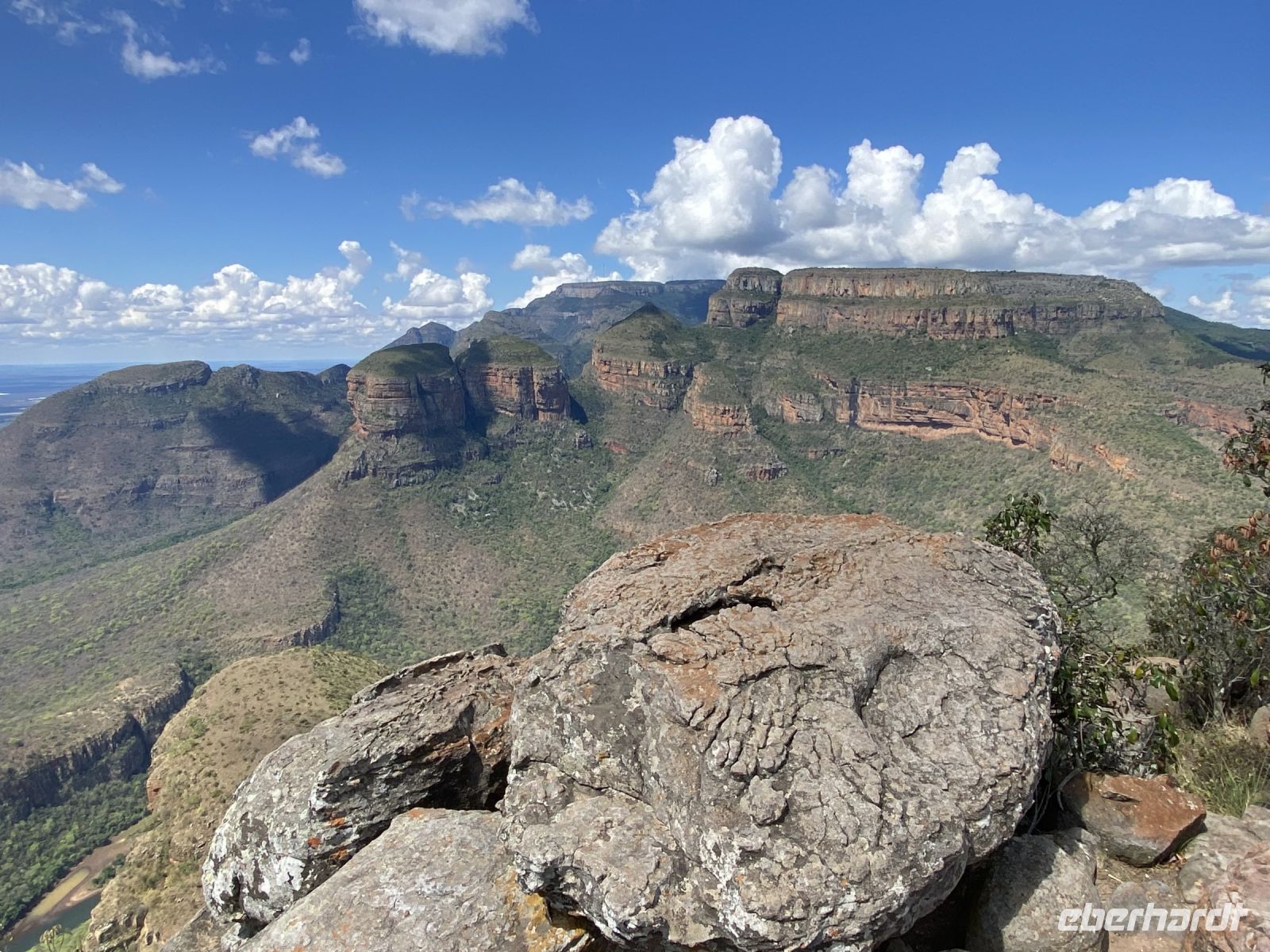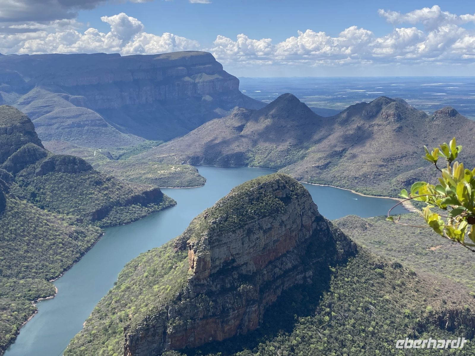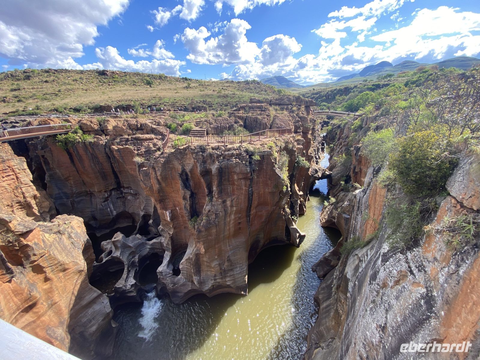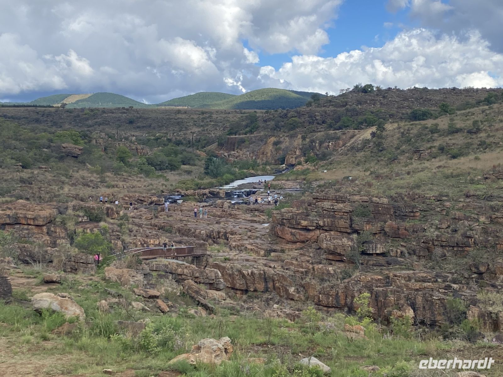 Nach dem Frühstück mussten wir Abschied von der vertrauten Lodge nehmen. Mit den Sonderbussen ging es zurück zum Airport, wo unser vertrauter Fahrer mit seinem Bus auf uns wartete. Vor uns lag jetzt die über 200 km lange Fahrt auf der weltbekannten Panorama Route in Mpumalanga und zu den Aussichtpunkten in über 1000 m Höhe. Wegen der kurzen Nächte fielen einigen Reiseteilnehmern die Augen zu und merkten nicht, dass unser Bus nur sehr langsam und in niedrigen Gängen voran kam. Dann meldete sich der Busfahrer und und verkündete uns, dass der Turbolader des Fahrzeuges defekt sei. Nach diesem Schock waren alle wieder hell wach. Als wir den Blyde River Canyon mit den Three Rondavels von weit oben betrachteten, organisierte unser Chauffeur einen Reparaturdienst, der am Abend zum Hotel kommen sollte. Auf der Weiterfahrt zum Bourkes Luck Potholes und weiterer Bergauffahrt brachte der Motor unseres Busses wieder mehr Leistung. Während unserer Wanderung und Besichtigung der nach Tom Bourke, der hier Gold fand, benannten Bourkes Glücksstrudellöcher, öffnete unser Fahrer die Motorhaube und sah, dass sich nur ein Luftführungsschlauch am Turbolader des Motors gelockert hatte und abgefallen war. Der Fehler wurde behoben. Wir erfreuten uns an der tollen Landschaft mit den Wasserfällen und tiefen Schluchten, die von Brücken überspannt wurden. In nun wieder zügiger Fahrt, aber mit etwas Verspätung, ging es weiter zu dem God’s Window (Gottes Fenster), anschließend via Graskop und Abstecher zur Pilgrims Rest, nach Hazyview, zum Perry`s Bridge Boutique Hotel, wo uns 19 Uhr das Abendessen serviert wurde.
