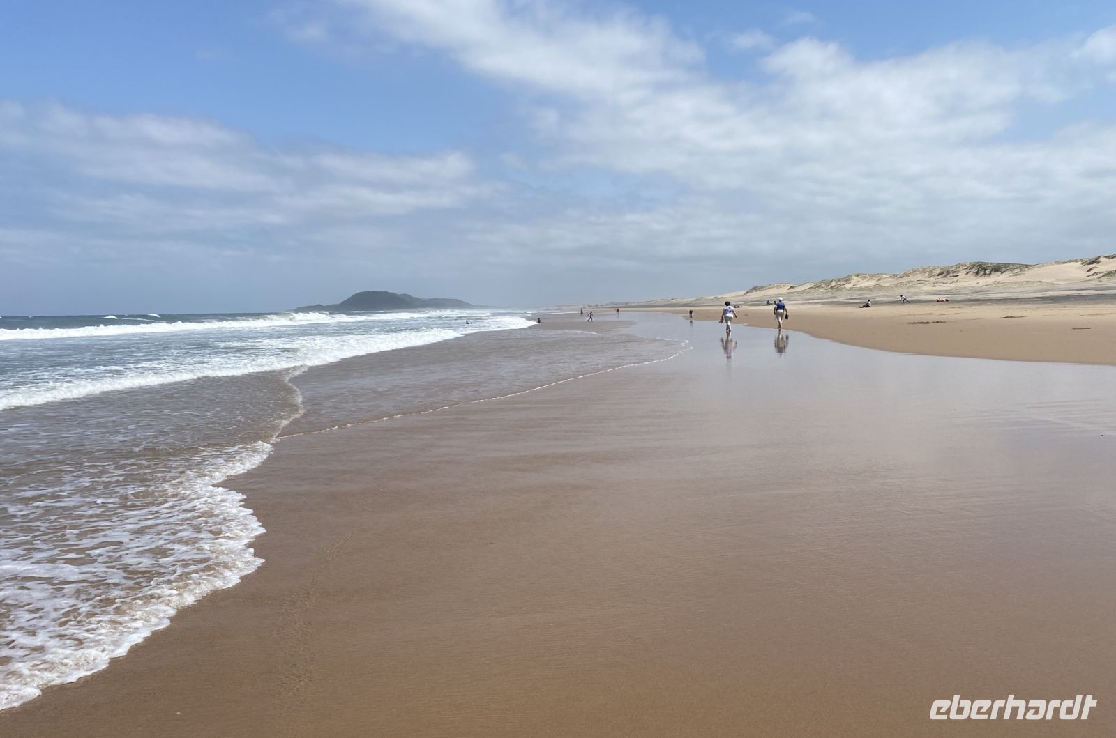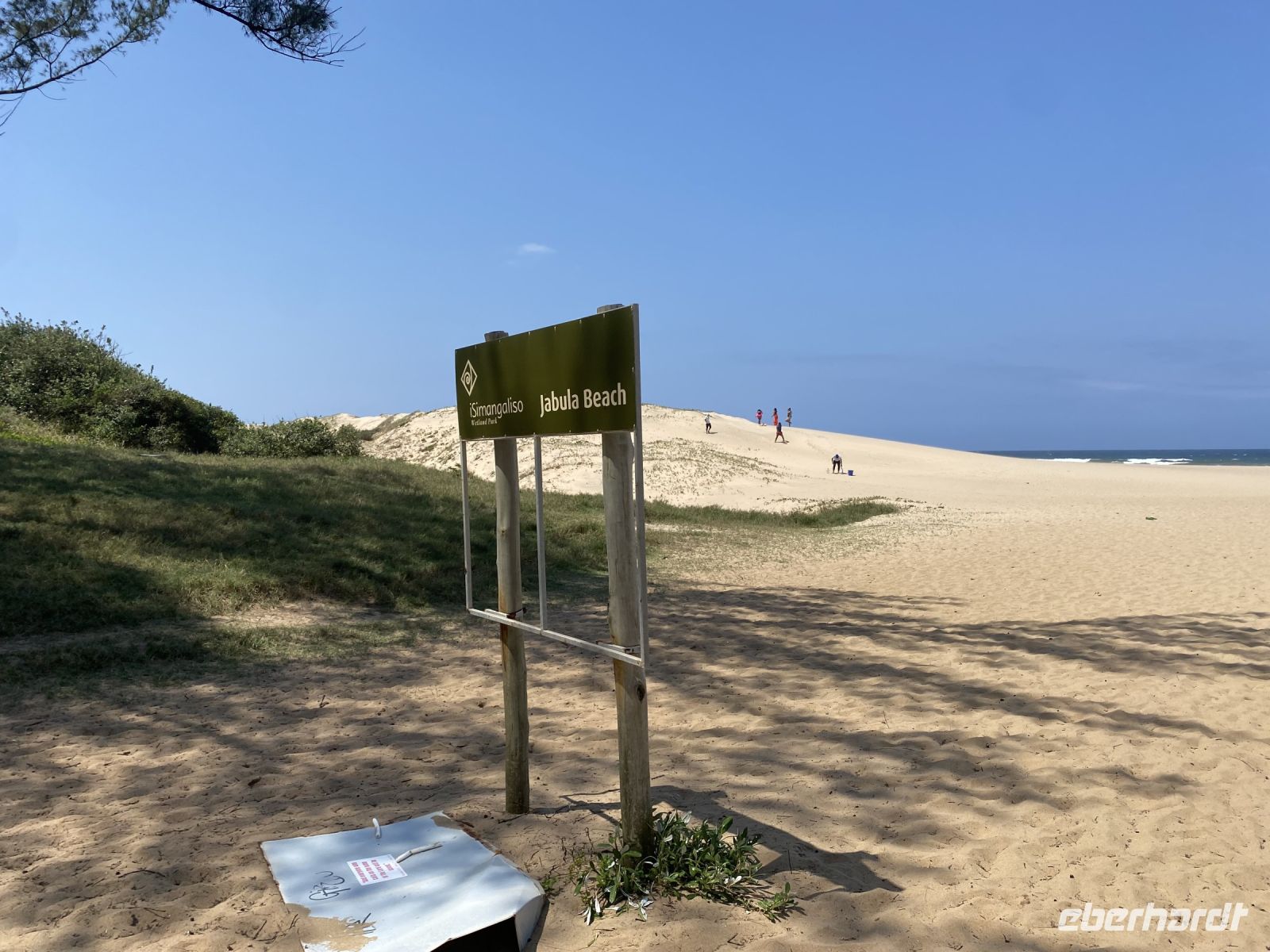 Mit Reisefahrzeug zum Eingang Campsite/Boat Club fahren (Parkplatz/TOI/Souvenirmark/Cafe) – weiter zu Fuss auf ausgeschilderten Weg (Naturschutzgebiet, geht über Holzwege/schattig/sehr schön) = kleine Wanderung/Spaziergang zum langen Sand-Strand am Indischen Ozean (2019 keine Toi/Umziehmöglichkeiten/Blick über Lagune und bewaldete Dünen)