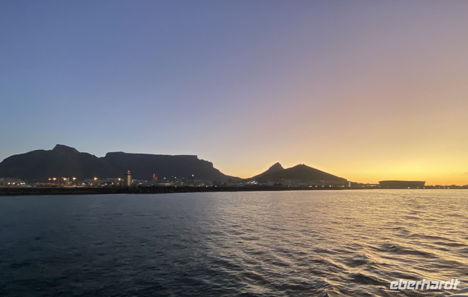 Eine City-Tour mit Bus und zu Fuß folgte. Unsere Unterkunft, das Portswood Hotel, erreichten wir am späten Nachmittag. Sofort nach einer Auffrischung ging es dann zur Sunset-Bootstour mit dem Serenity One Catamaran. Bei herrlichem Wetter und Sonnenuntergang konnten wir den Tafelberg, alle anderen Gipfel und die Stadt aus verschiedenen Richtungen und Lichtverhältnissen sehen und natürlich fotografieren.