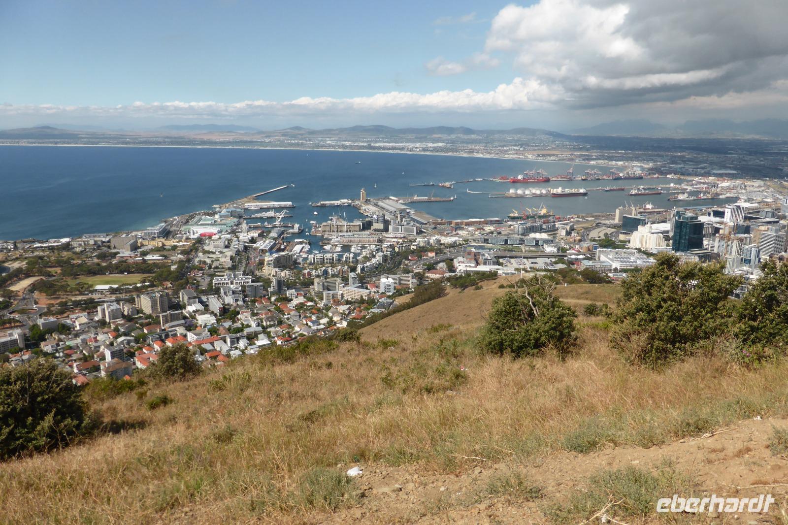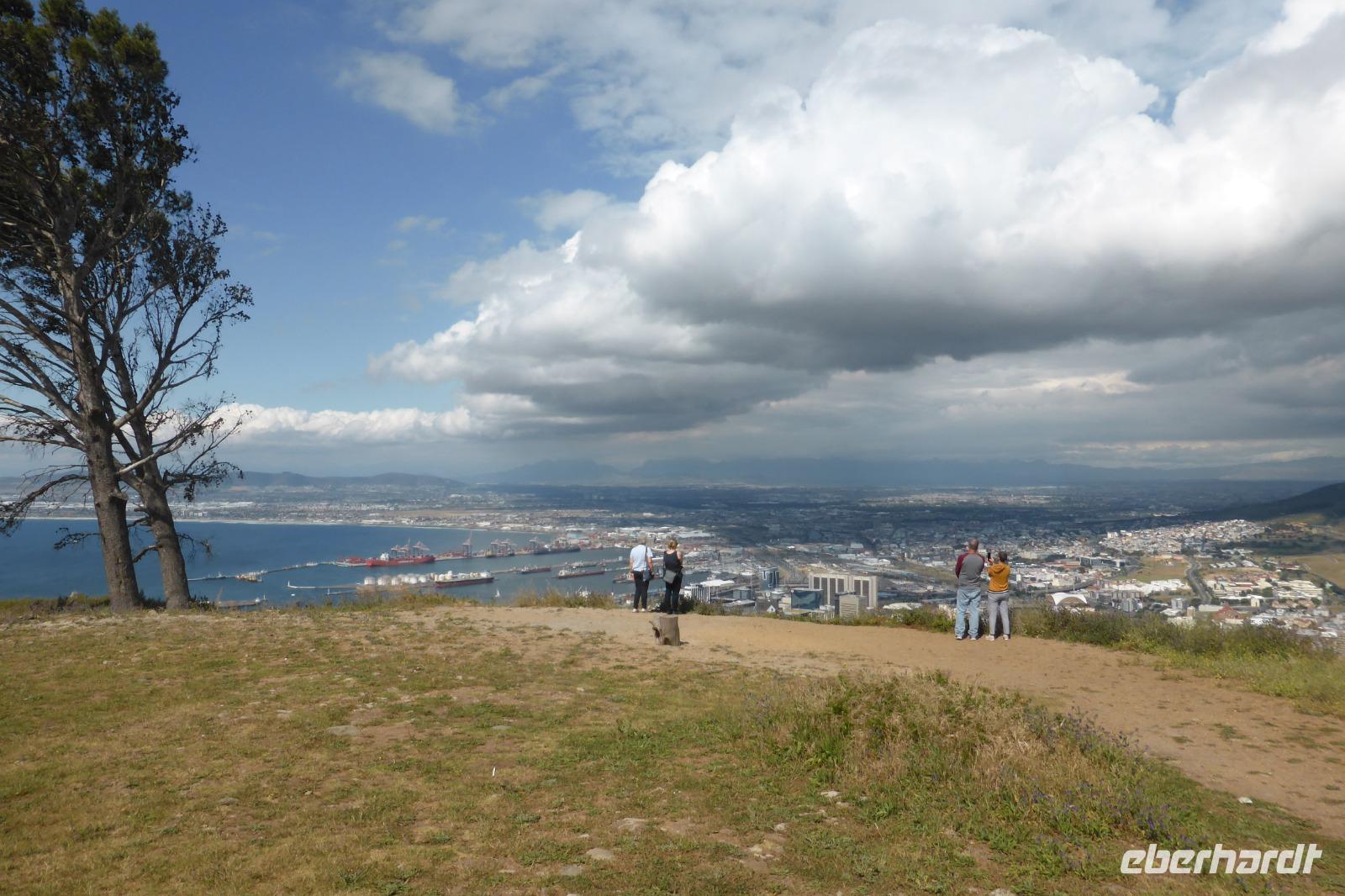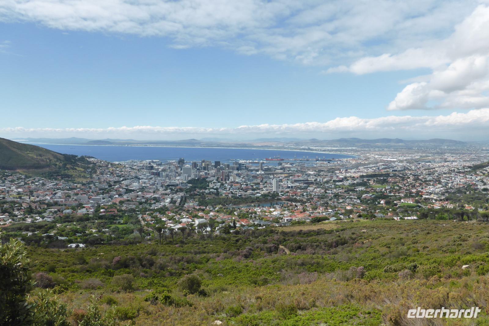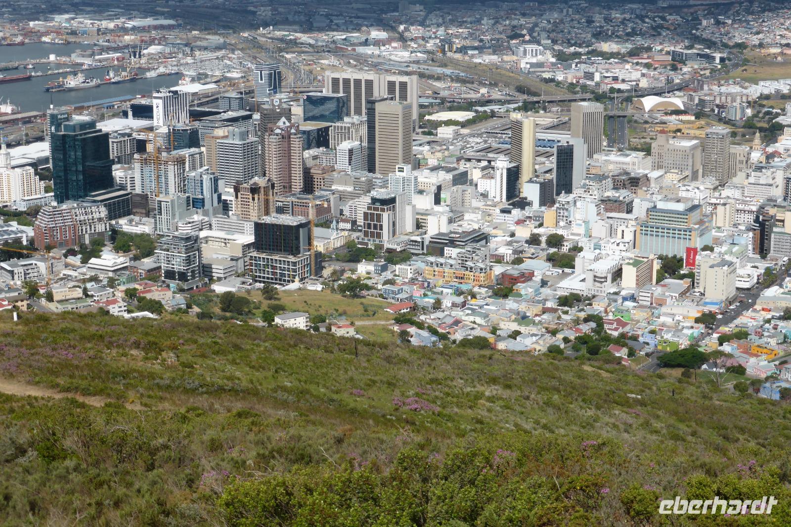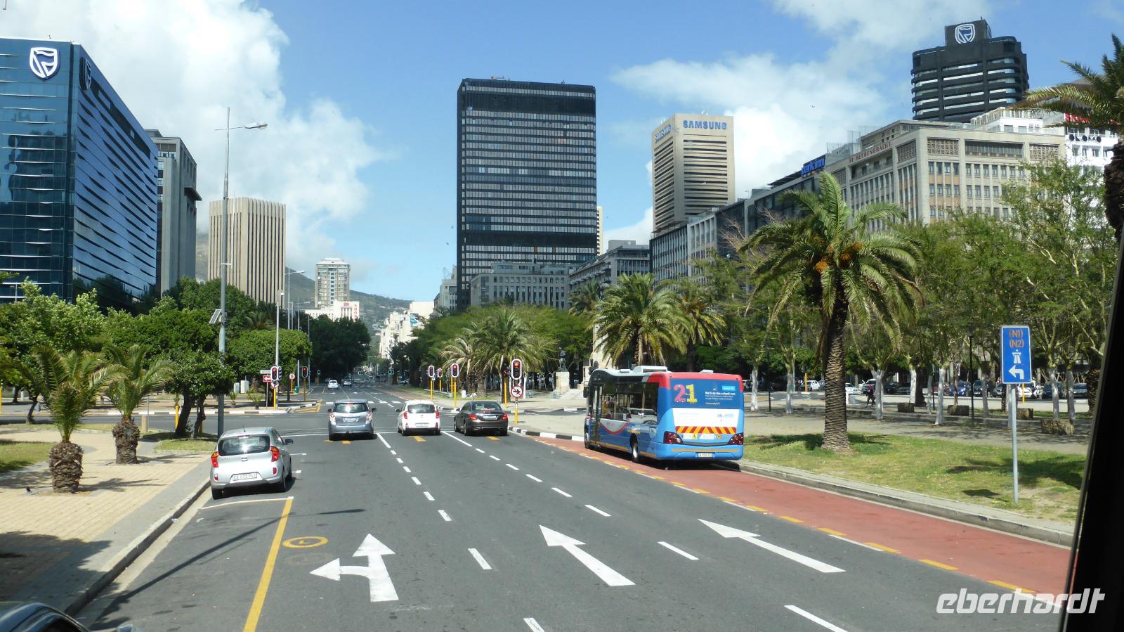 Im Laufe des Tages treffen wir am Frankfurter Flughafen ein, wo am Abend unser Fernflug nach Kapstadt startet. Nach 9.500 Kilometer und 11,5 Stunden Flug erreichen wir am nächsten Morgen Kapstadt. Am Flughafen empfängt uns Keith, der örtliche Reiseleiter. Da er in in Bonn studiert hat, spricht er gut Deutsch. Zunächst besorgen wir uns in der Wechselstube noch Südafrikanische Rand, was etwas umständlich ist, weil die Passdaten erfaßt werden müssen und sich entsprechend hinzieht. Dann können wir zu unserer Stadtrundfahrt in die 6 Millionen Einwohner Metropole starten.