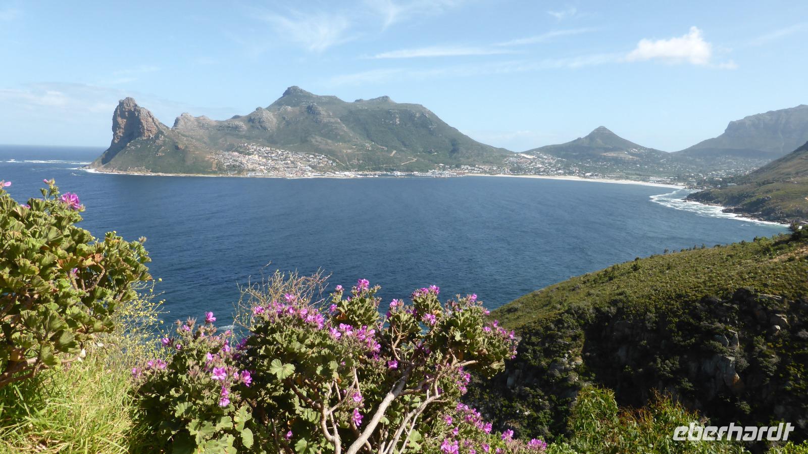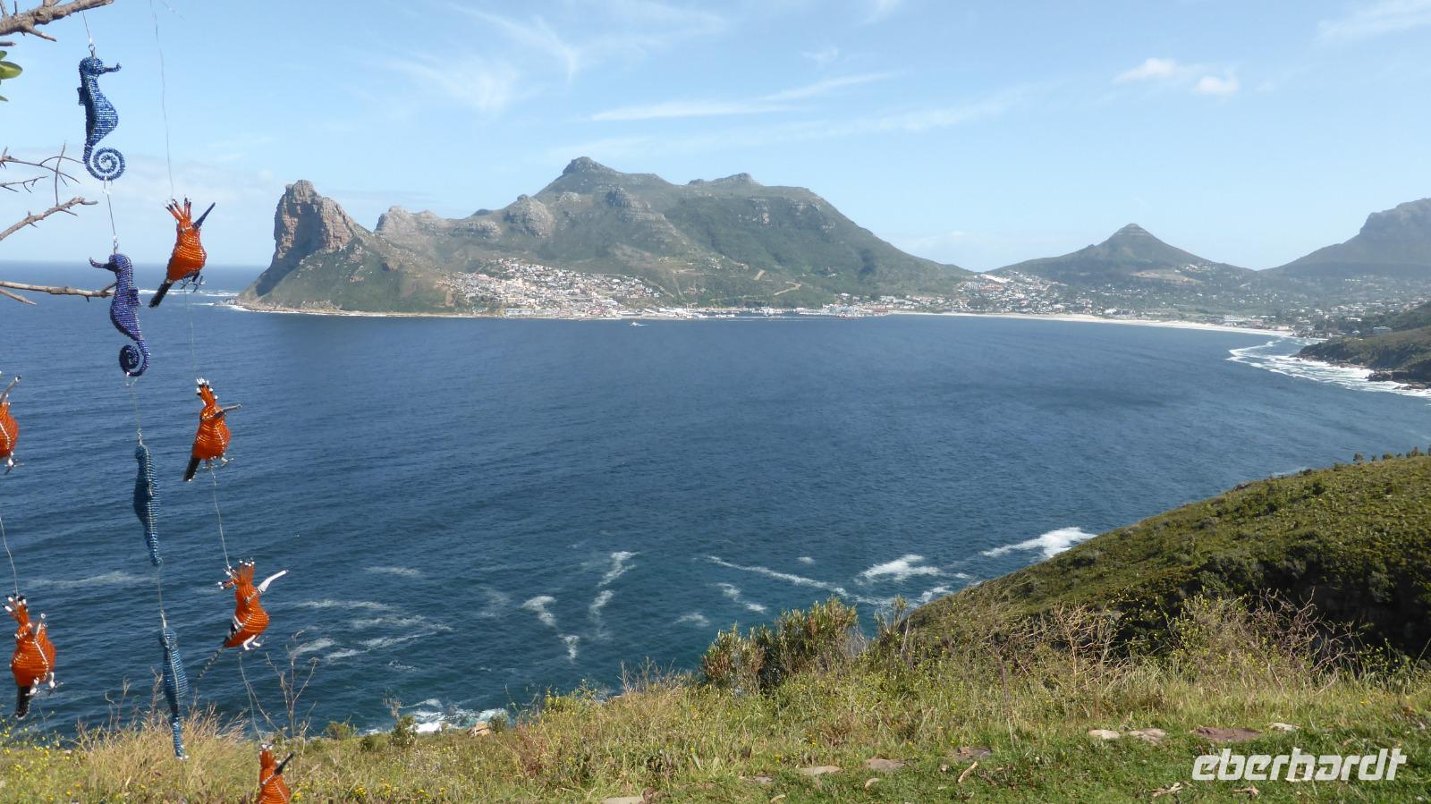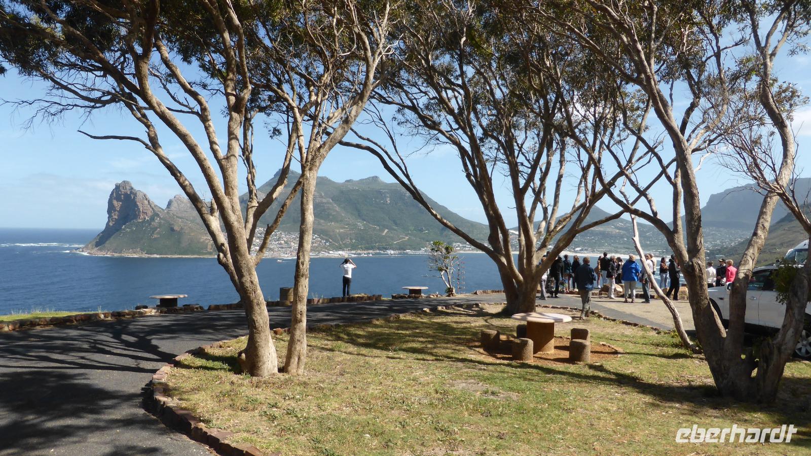 Unser Tag am selbst erklärten „schönsten Ende der Welt" beginnt mit beeindruckenden Ausblicken auf die Westküste, so auf die Camps Bay mit den 12 Aposteln (die Bergkette weist eigentlich eine Folge von 18 Kuppen auf, aber so viele Apostel stehen nicht zur Verfügung...) und auf die Hout Bay (hout = holländisch Holz) mit dem markanten Sentinal Mountain („Wächterberg"). Zwischendurch sehen wir von der Victoria Road aus Pelzrobben auf einer vorgelagerten Felseninsel.
