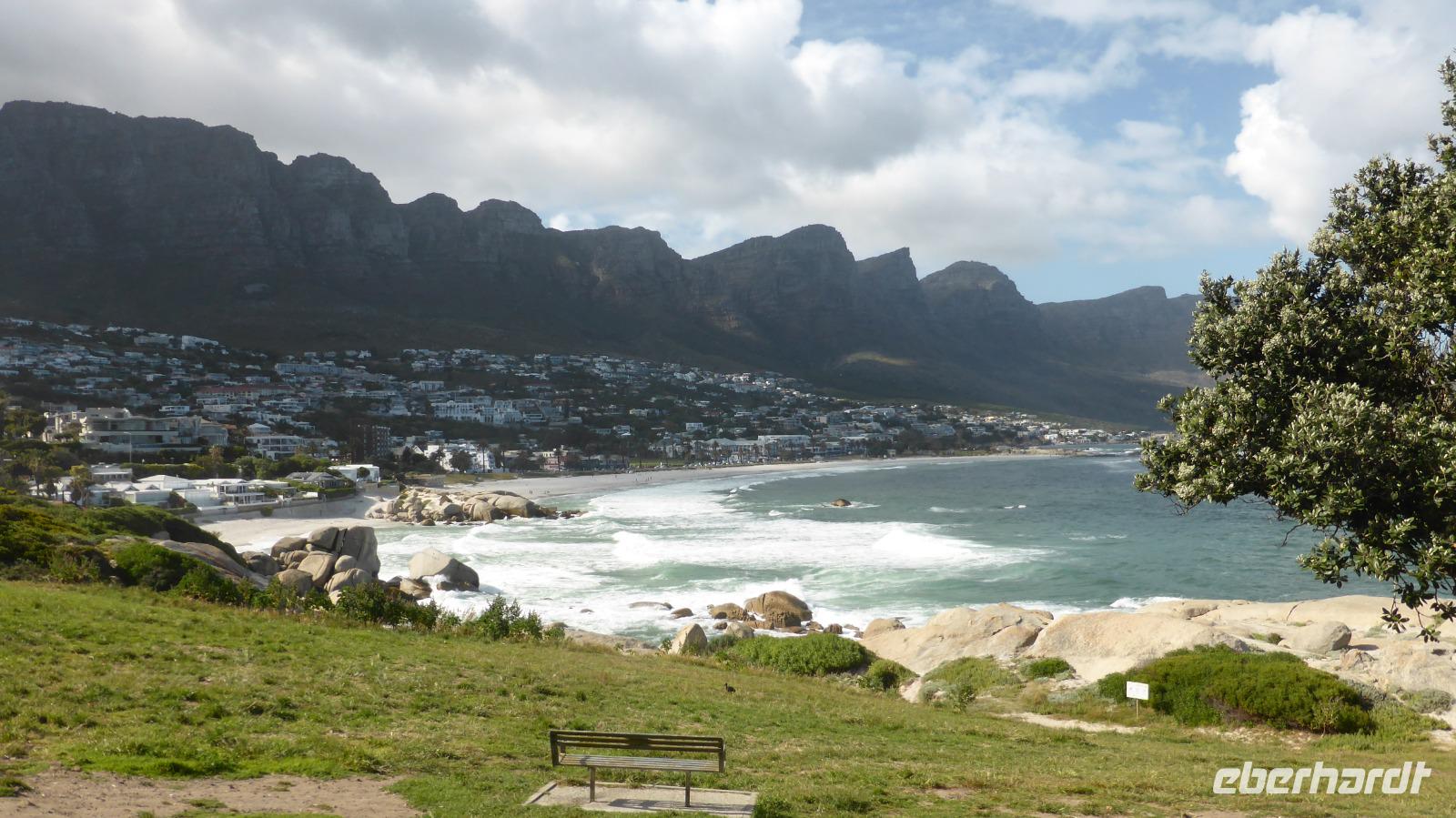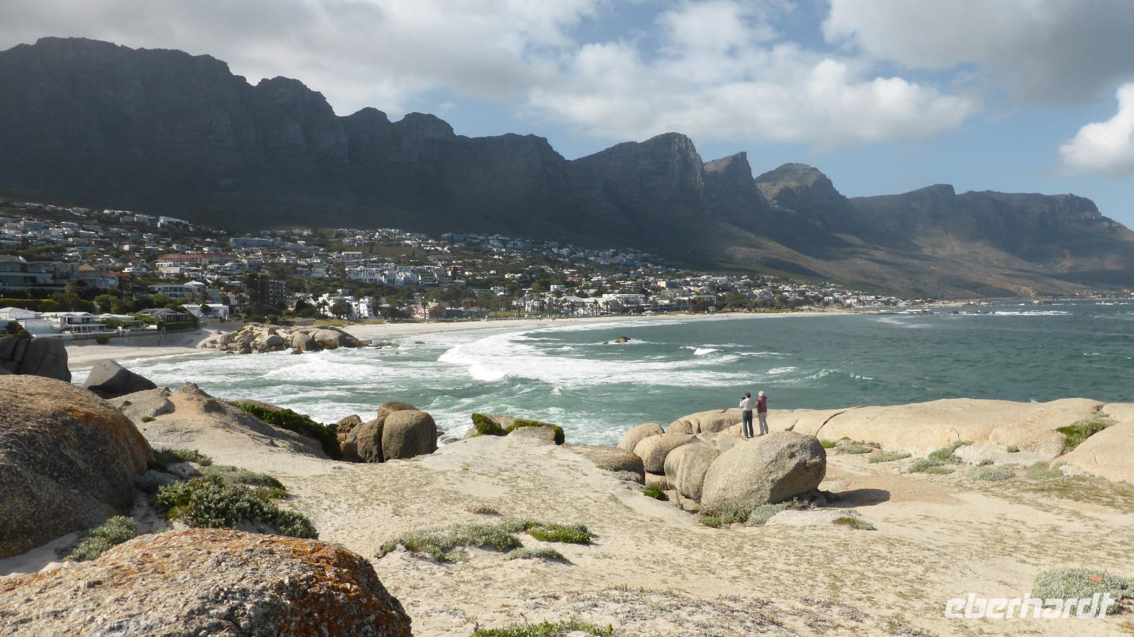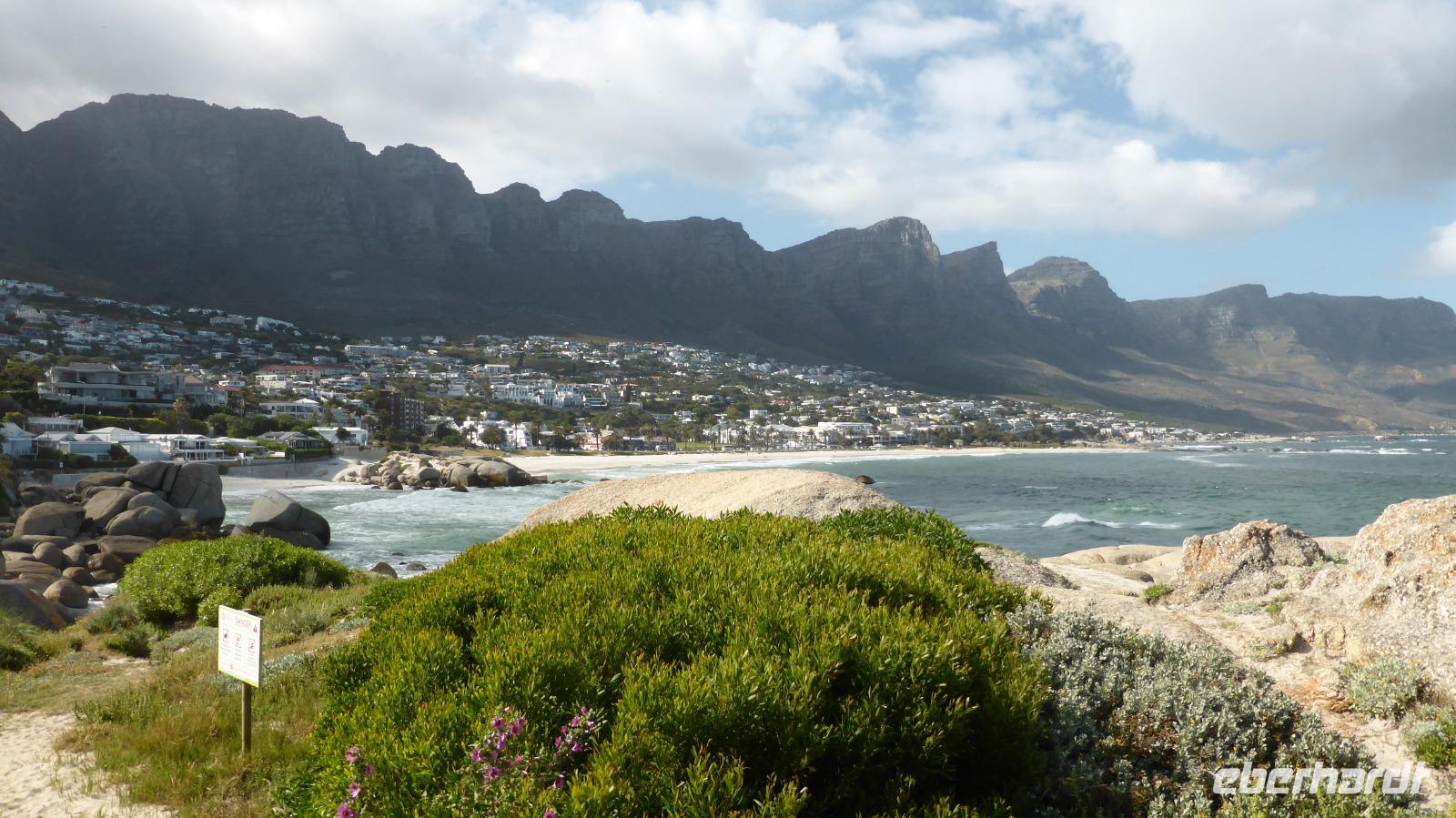 Unser Tag am selbst erklärten „schönsten Ende der Welt" beginnt mit beeindruckenden Ausblicken auf die Westküste, so auf die Camps Bay mit den 12 Aposteln (die Bergkette weist eigentlich eine Folge von 18 Kuppen auf, aber so viele Apostel stehen nicht zur Verfügung...) und auf die Hout Bay (hout = holländisch Holz) mit dem markanten Sentinal Mountain („Wächterberg"). Zwischendurch sehen wir von der Victoria Road aus Pelzrobben auf einer vorgelagerten Felseninsel.