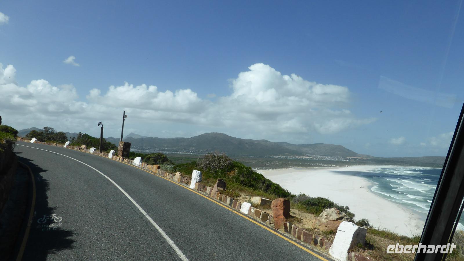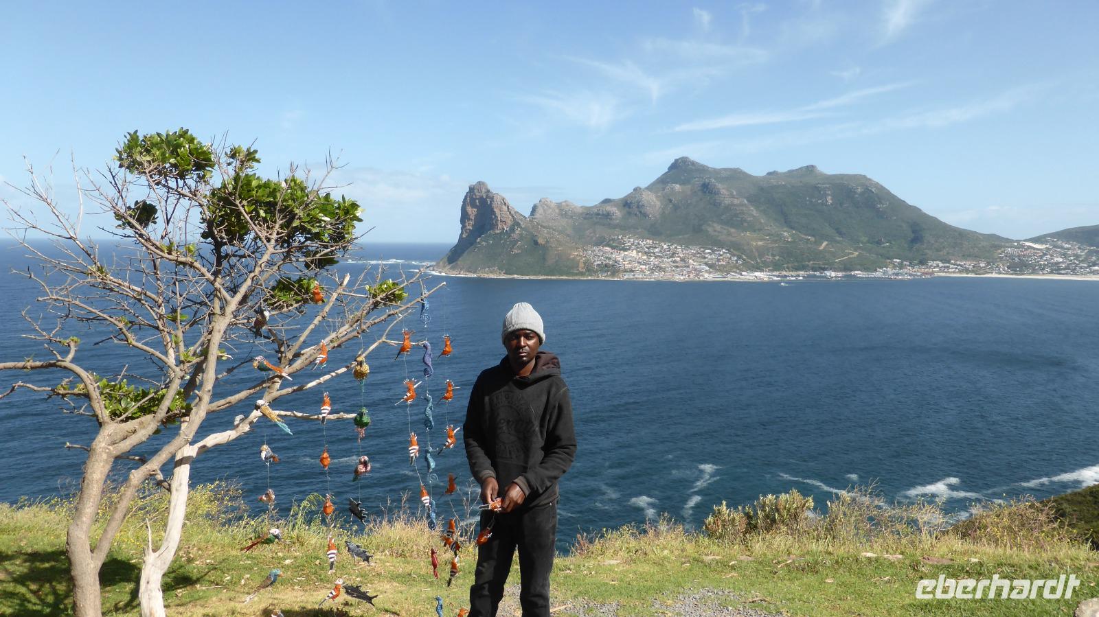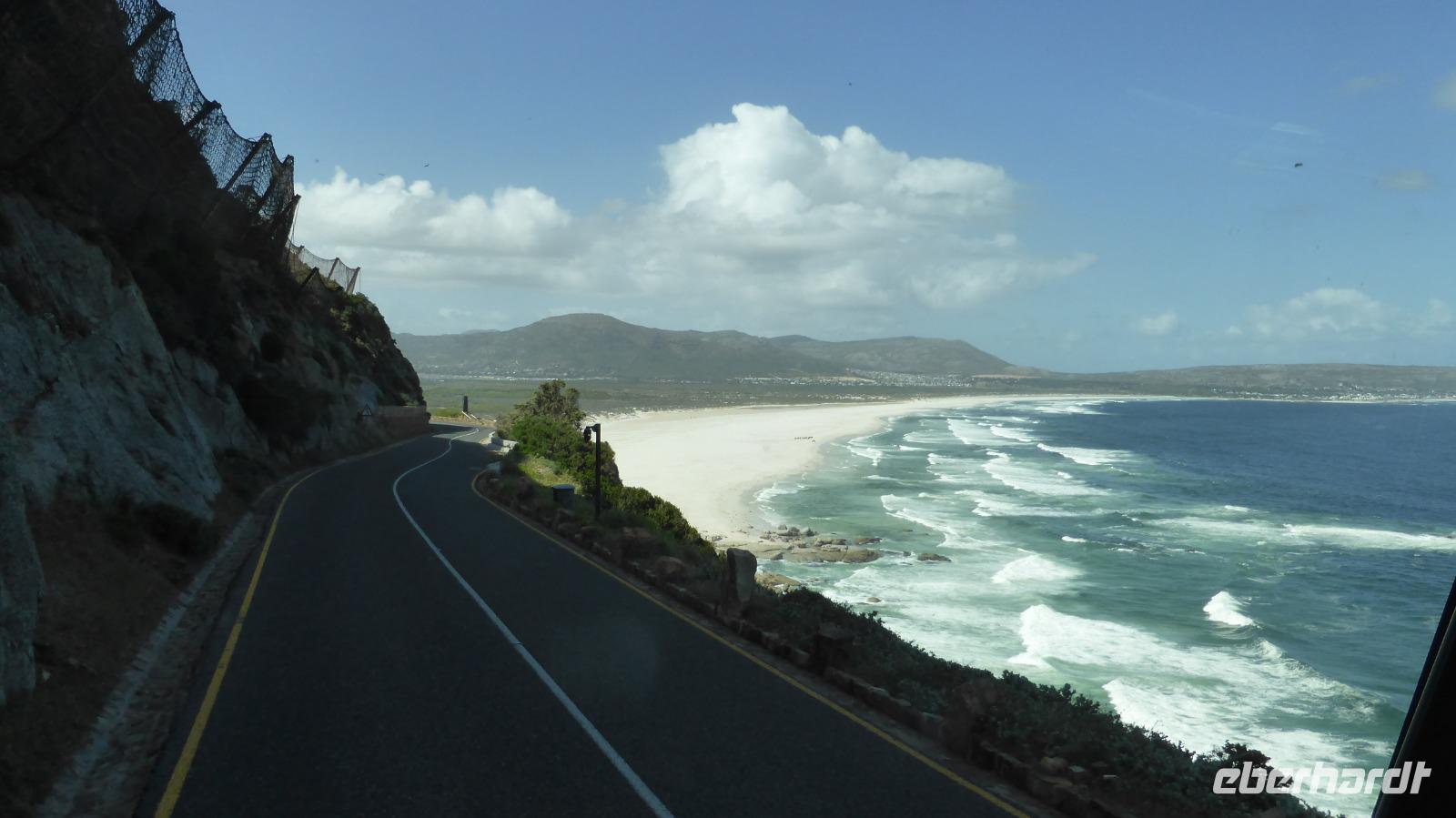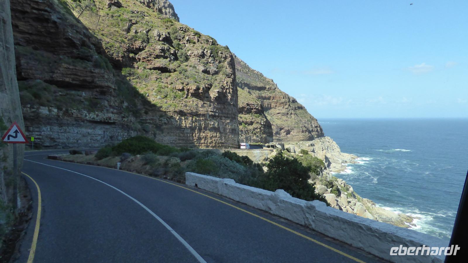 Atemberaubend ist der Chapman's Peak Drive. Die neun Kilometer lange Küstenstraße zählt zu den spektakulärsten der Welt. Verschiedene Automarken nutzen die fantastischen Perspektiven für Werbeaufnahmen. Keith kennt dazu eine interessante Geschichte: Chapman war ein britischer Bootsmann. Als er mit dem Schiff 1604 hier her kam, sollte er an Land nach Süßwasser suchen. Sein Schiff fuhr ohne ihn weiter, erst zwei Tage später, bemerkte man an Bord, dass der Bootsmann fehlte.
