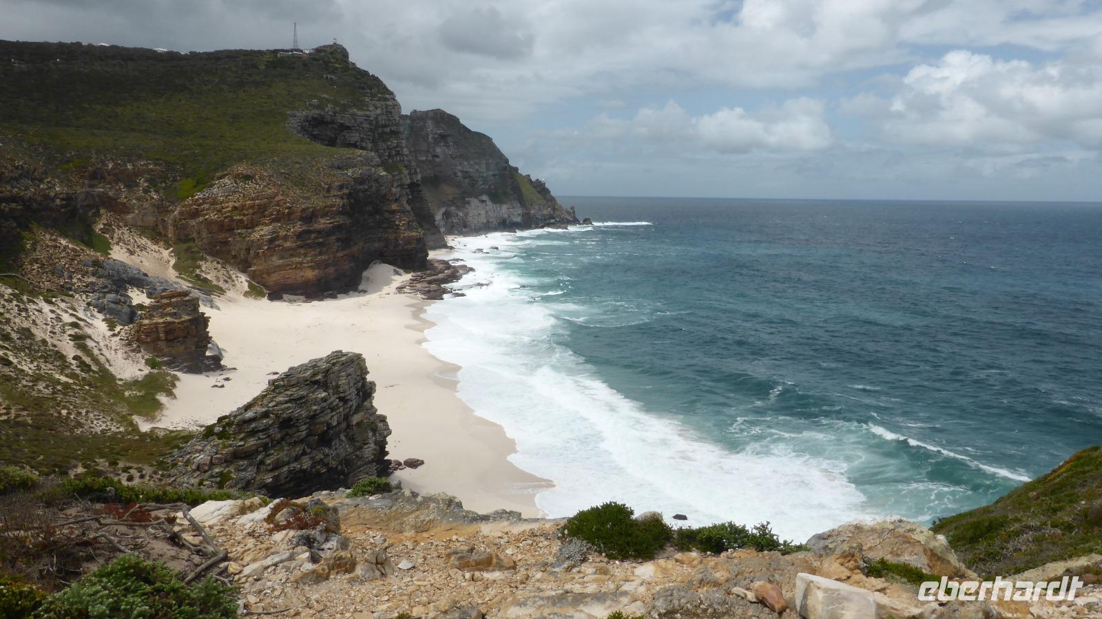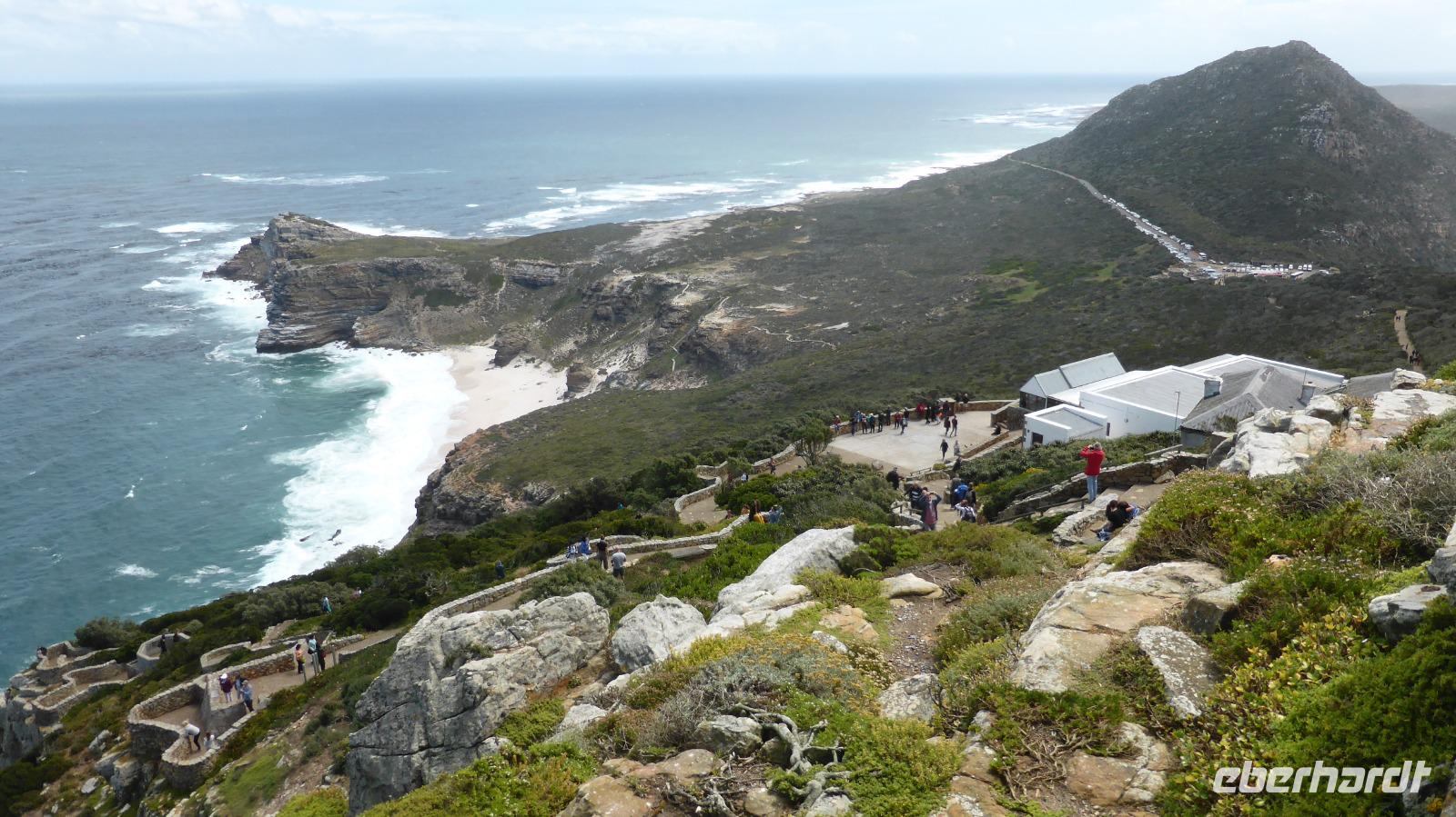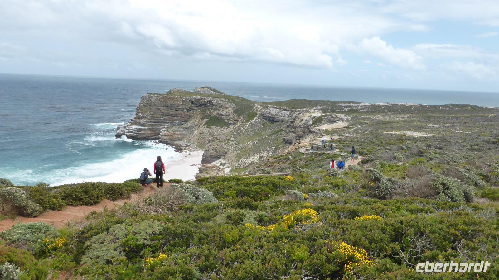 Auf dem Weg zum Kap passieren wir einen sehr breiten und lang gestreckten Strand, den Long Beach, auf dem gerade Reiter unterwegs sind. So schön der Strand auch ist, Wassertemperaturen von 12 bis 14 Grad laden nicht gerade zum Baden ein. Anschließend erreichen wir den Nationalpark der südlichen Kaphalbinsel. Hier sichten wir Buntböcke, Kapschnee, Strauße und Elenantilopen. Das Kap der Guten Hoffnung stellt in der Seefahrtgeschichte einen wichtigen Meilenstein dar, ist aber nicht der südlichste Punkt Afrikas (das ist das Kap Agulhas). Das Kap wird auch heute seinem Ruf als wetterunbeständige Region gerecht: gerade als wir an der Westspitze des Doppelkaps, dem „Cape Point" ankommen, müssen wir erstmal einen Regenschauer abwarten. Für die Erkundung des Doppelkaps nehmen wir uns Zeit für kleine oder größere Wanderungen, Fotografieren, Mittagessen, Postkarten Schreiben...
