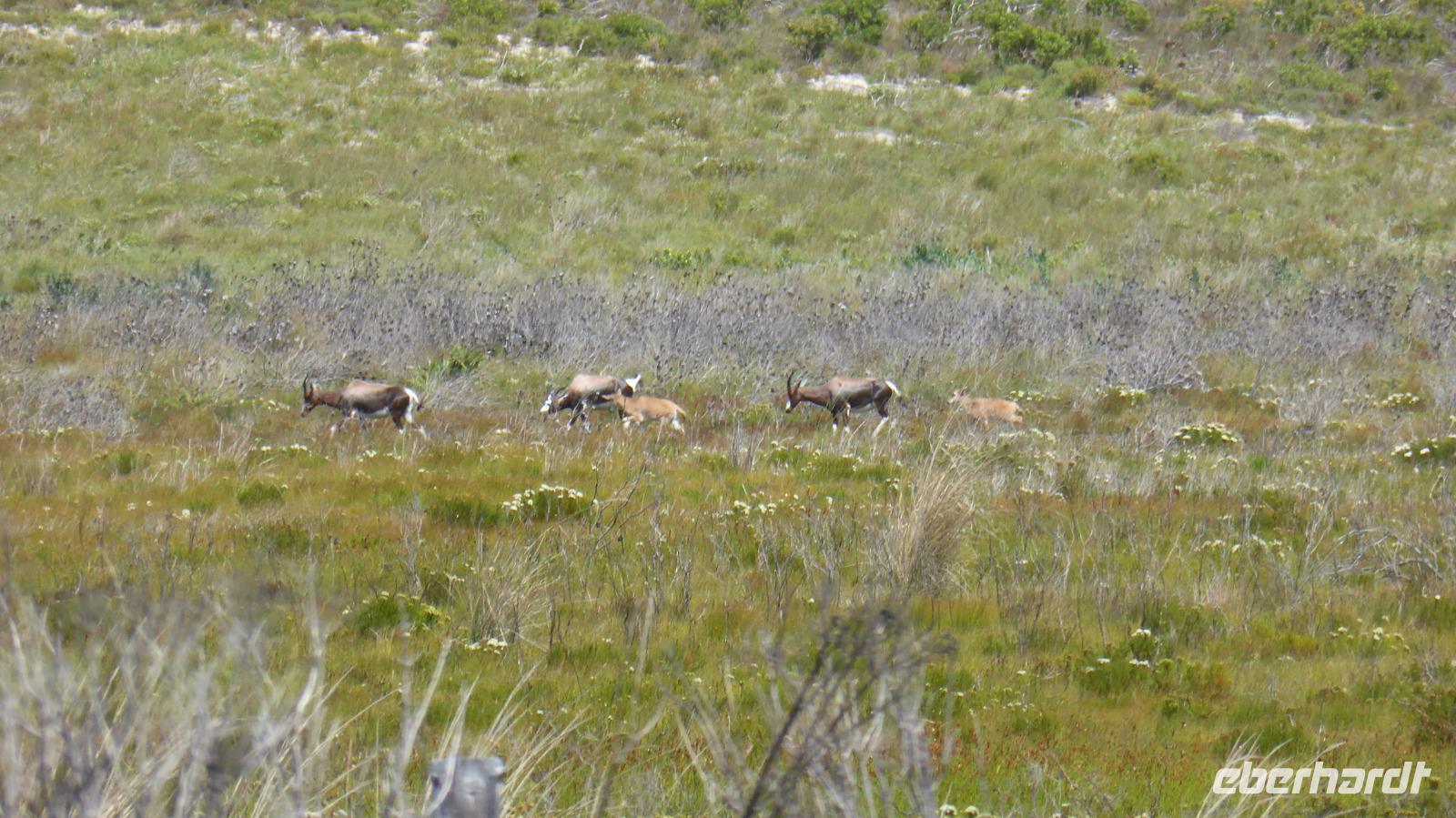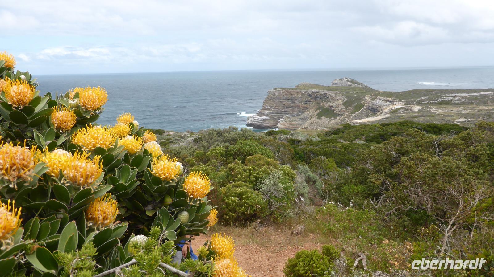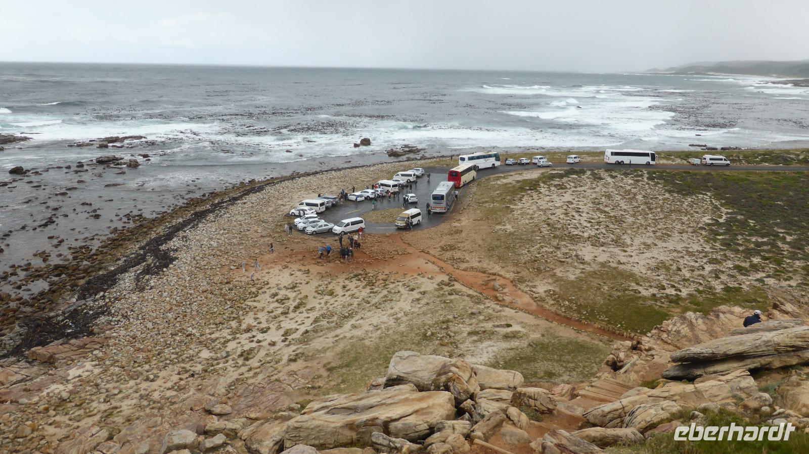 Auf dem Weg zum Kap passieren wir einen sehr breiten und lang gestreckten Strand, den Long Beach, auf dem gerade Reiter unterwegs sind. So schön der Strand auch ist, Wassertemperaturen von 12 bis 14 Grad laden nicht gerade zum Baden ein. Anschließend erreichen wir den Nationalpark der südlichen Kaphalbinsel. Hier sichten wir Buntböcke, Kapschnee, Strauße und Elenantilopen. Das Kap der Guten Hoffnung stellt in der Seefahrtgeschichte einen wichtigen Meilenstein dar, ist aber nicht der südlichste Punkt Afrikas (das ist das Kap Agulhas). Das Kap wird auch heute seinem Ruf als wetterunbeständige Region gerecht: gerade als wir an der Westspitze des Doppelkaps, dem „Cape Point" ankommen, müssen wir erstmal einen Regenschauer abwarten. Für die Erkundung des Doppelkaps nehmen wir uns Zeit für kleine oder größere Wanderungen, Fotografieren, Mittagessen, Postkarten Schreiben...