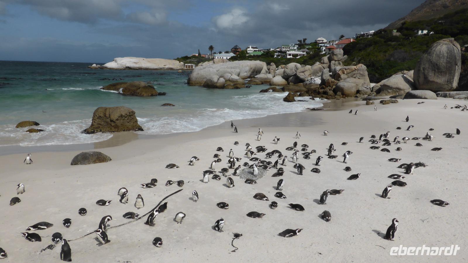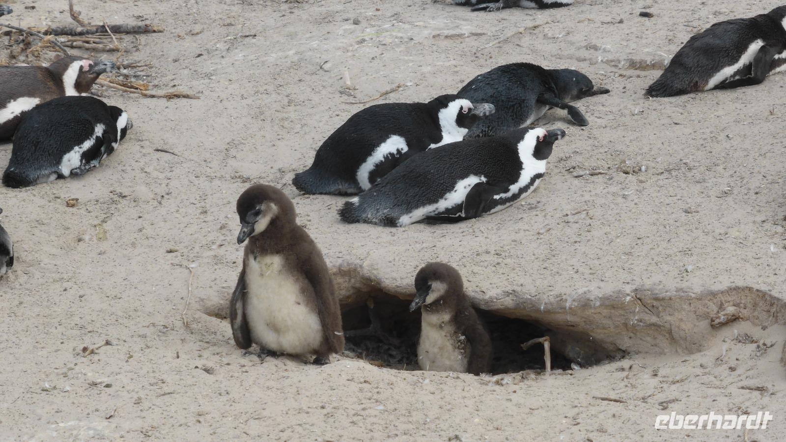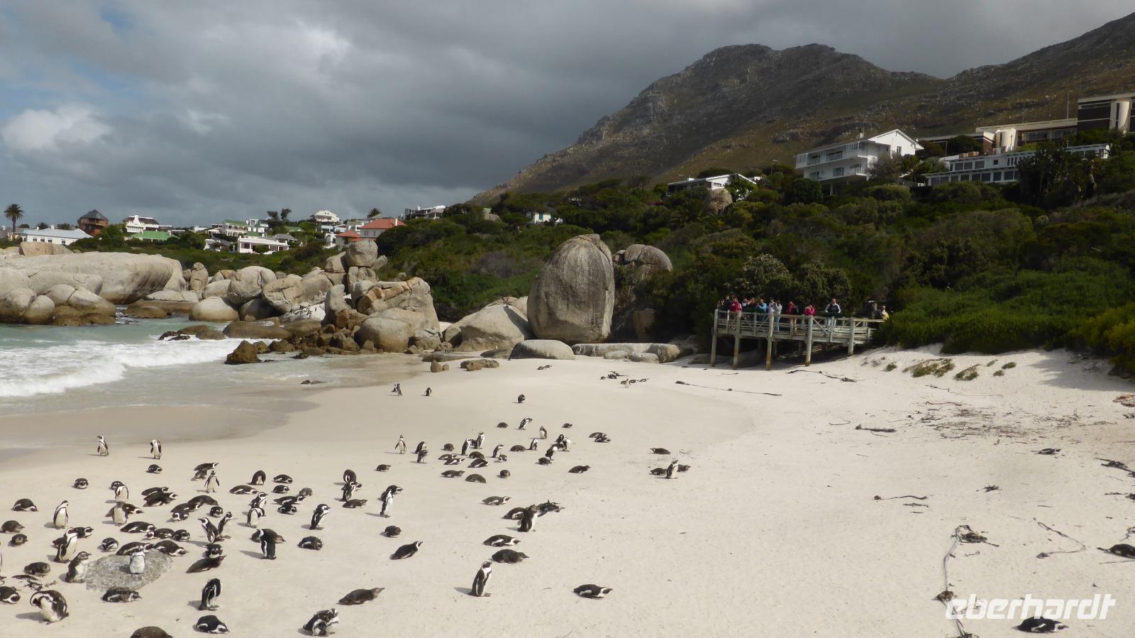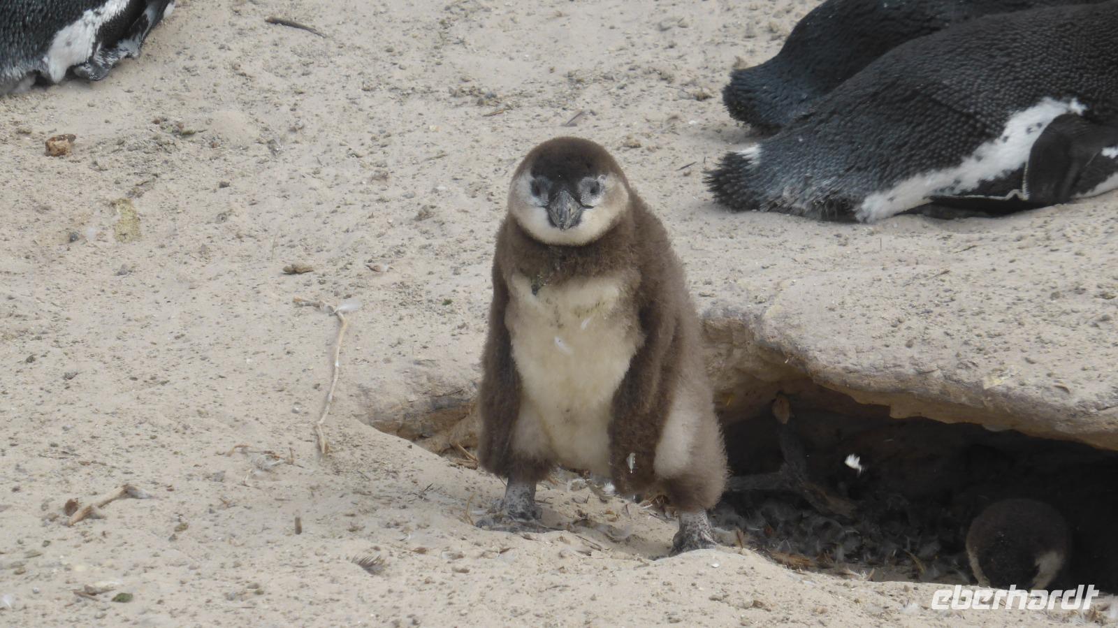 Am Nachmittag setzen wir unseren Ausflug zur Ostseite der Kaphalbinsel fort. Der Boulders Beach in Simons Town ist bekannt für eine Kolonie von Brillenpinguinen, eine von drei Pinguinkolonien auf dem afrikanischen Festland. Die Pinguinkolonie ist ein Touristenmagnet, erschlossen mit einem Holzsteg. Während unseres Besuches können wir mehrere Jungtiere beobachten. Keith informiert uns über ein interessantes Detail: einmal jährlich mausern sich die Pinguine über eine Zeitspanne von etwa 3 Wochen. In dieser Zeit ist ihr Gefieder nicht wasserdicht, sie müssen also an Land bleiben und hungern. Deshalb fressen sie sich vor der Mauser gezielt eine Reserve an.