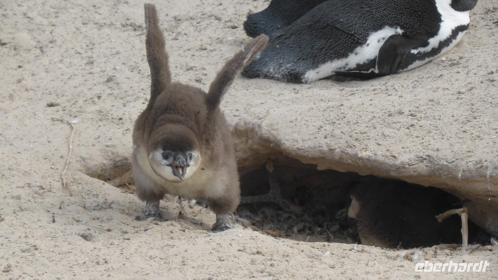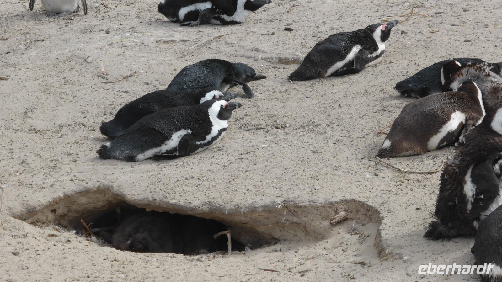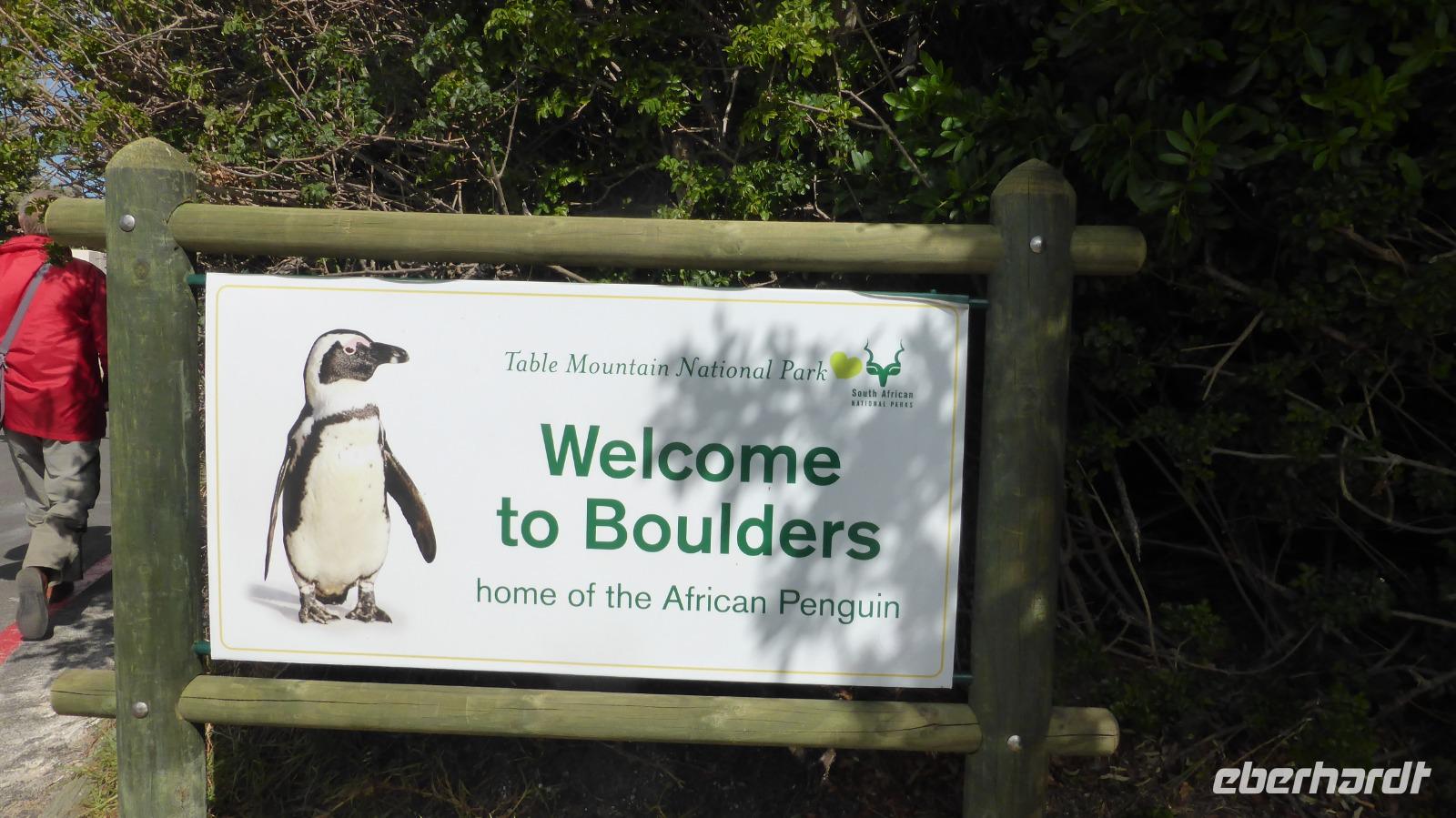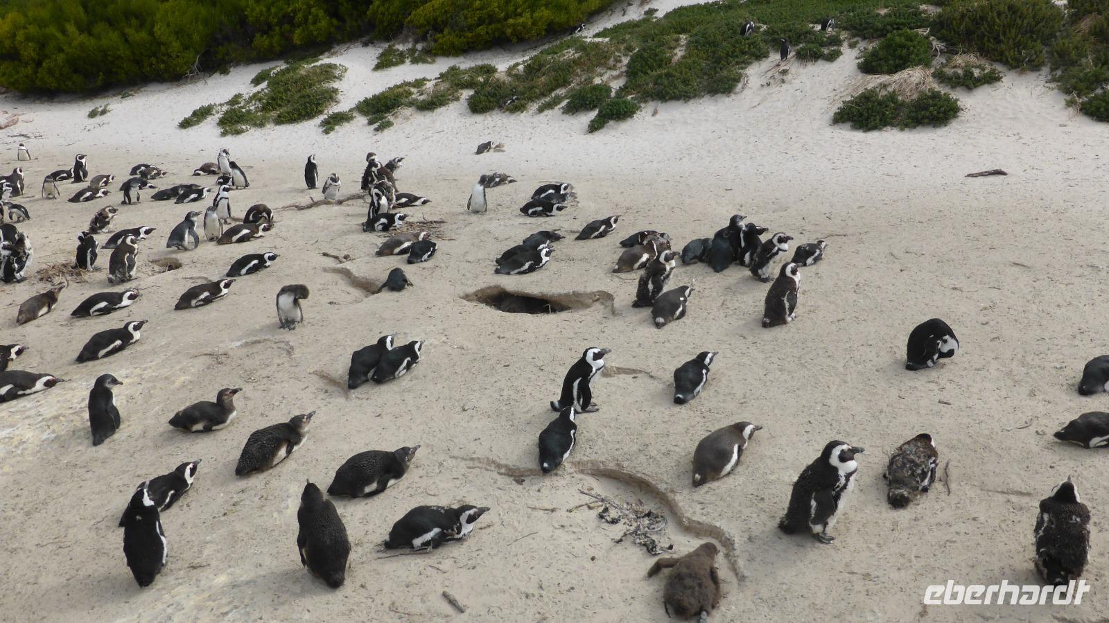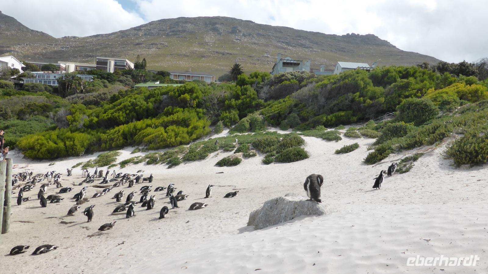 Am Nachmittag setzen wir unseren Ausflug zur Ostseite der Kaphalbinsel fort. Der Boulders Beach in Simons Town ist bekannt für eine Kolonie von Brillenpinguinen, eine von drei Pinguinkolonien auf dem afrikanischen Festland. Die Pinguinkolonie ist ein Touristenmagnet, erschlossen mit einem Holzsteg. Während unseres Besuches können wir mehrere Jungtiere beobachten. Keith informiert uns über ein interessantes Detail: einmal jährlich mausern sich die Pinguine über eine Zeitspanne von etwa 3 Wochen. In dieser Zeit ist ihr Gefieder nicht wasserdicht, sie müssen also an Land bleiben und hungern. Deshalb fressen sie sich vor der Mauser gezielt eine Reserve an.