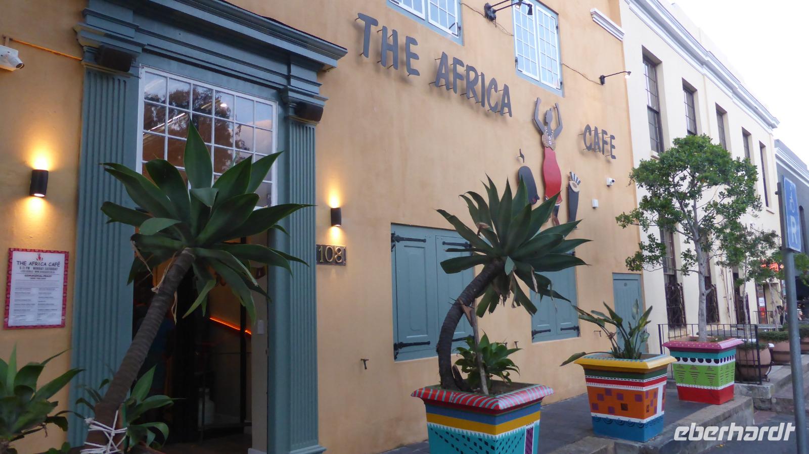 Dieser schöne Tag klingt mit einem Abendessen im Afrika Café aus. Wer mag, bekommt eine Gesichtsbemalung wie sie auch vom Personal getragen wird. Im Ambiente einer Savanne (angesichts der Wandbemalung des Raumes) essen wir uns mit 15 verschieden Gerichten einmal quer durch Afrika.