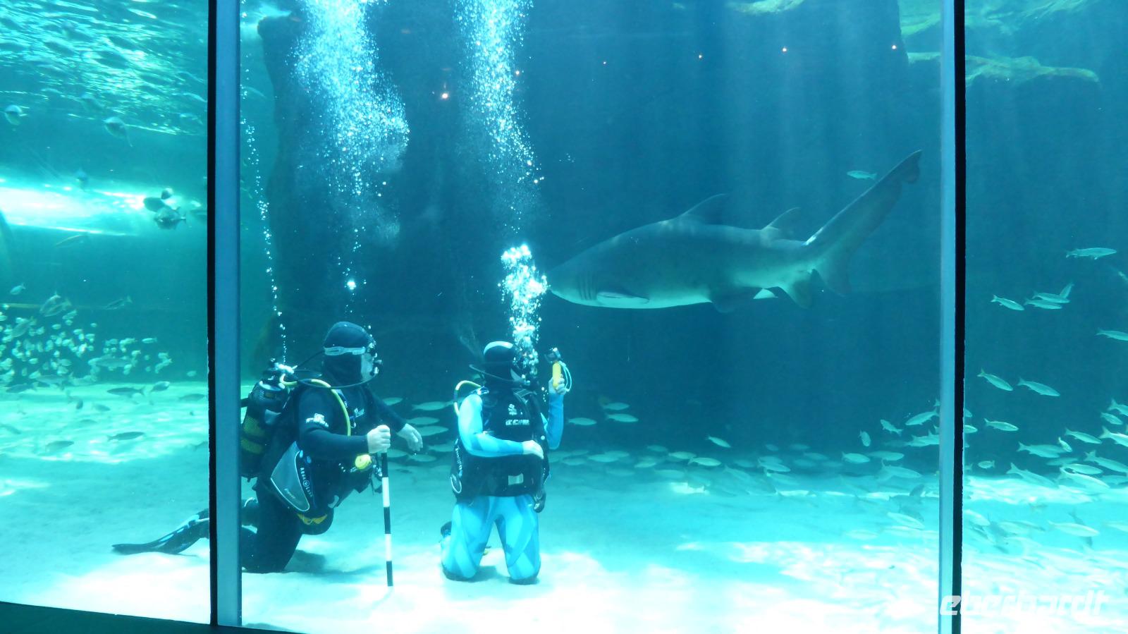 Das Wetter zeigt sich heute von seiner besten Seite mit Sonnenschein, schwachen Wind und angenehmen Frühlingstemperaturen. Gute Bedingungen für einen entspannten Vormittag in der Victoria & Alfred Waterfront. Möglichkeiten bieten sich hier viele: eine Fahrt mit dem Riesenrad, ein Imbiss an der frischen Luft mit Blick auf den heute wolkenlosen Tafelberg, Einkaufen (...Schuhe :-) ) oder ein Besuch im Two Oceans Aquarium. Im Aquarium sind zum Teil sehr sonderbare Bewohner aus Atlantik und Indischen Ozean zu sehen. Anziehungspunkt sind die großen Aquarien, insbesondere das Haifischbecken, in dem gerade zwei Taucher unterwegs sind und dabei Selfies mit Haien machen.