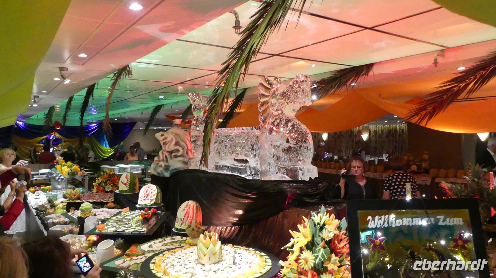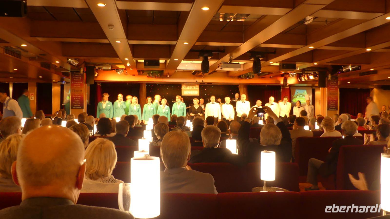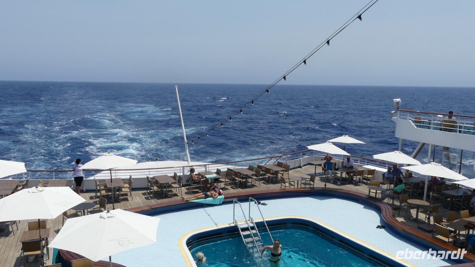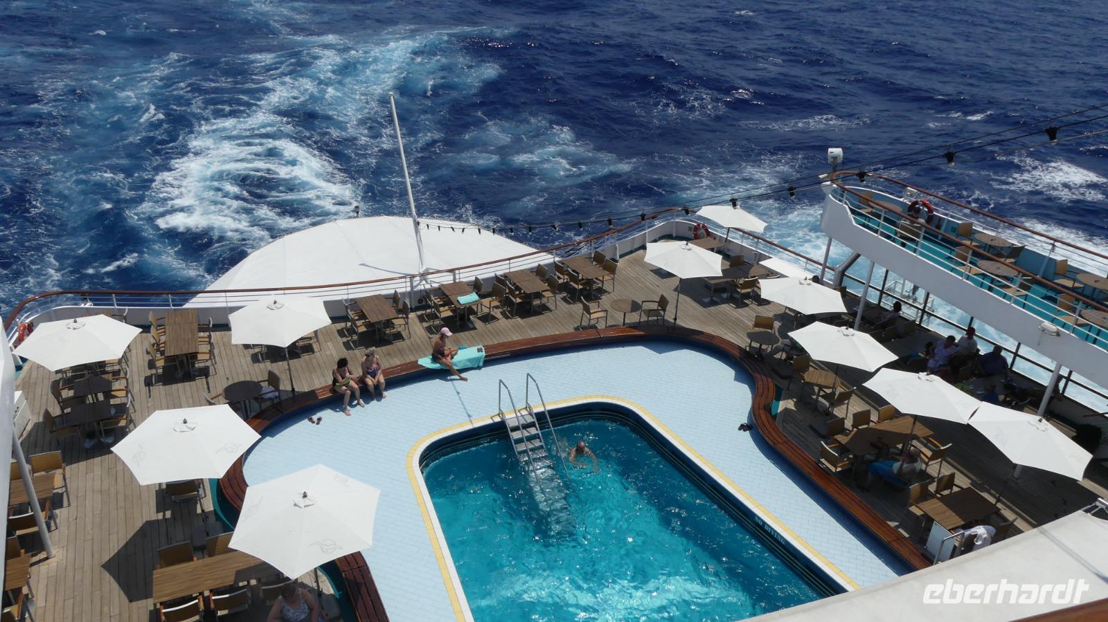 Die Besatzung versteht es, für reichlich Abwechslung an Bord zu sorgen. Passend zum weiß-blauen Himmel gibt es beim bayerischen Frühschoppen auf Deck 6 Freibier, Weißwurst und Co :-). Vielleicht sollte ich noch erwähnen, dass wir wieder sehr schönes Wetter mit 28 Grad und Seestärke 3 haben...wenn Engel reisen. Während ich das gerade schreibe, schwappt allerdings das Poolwasser über.