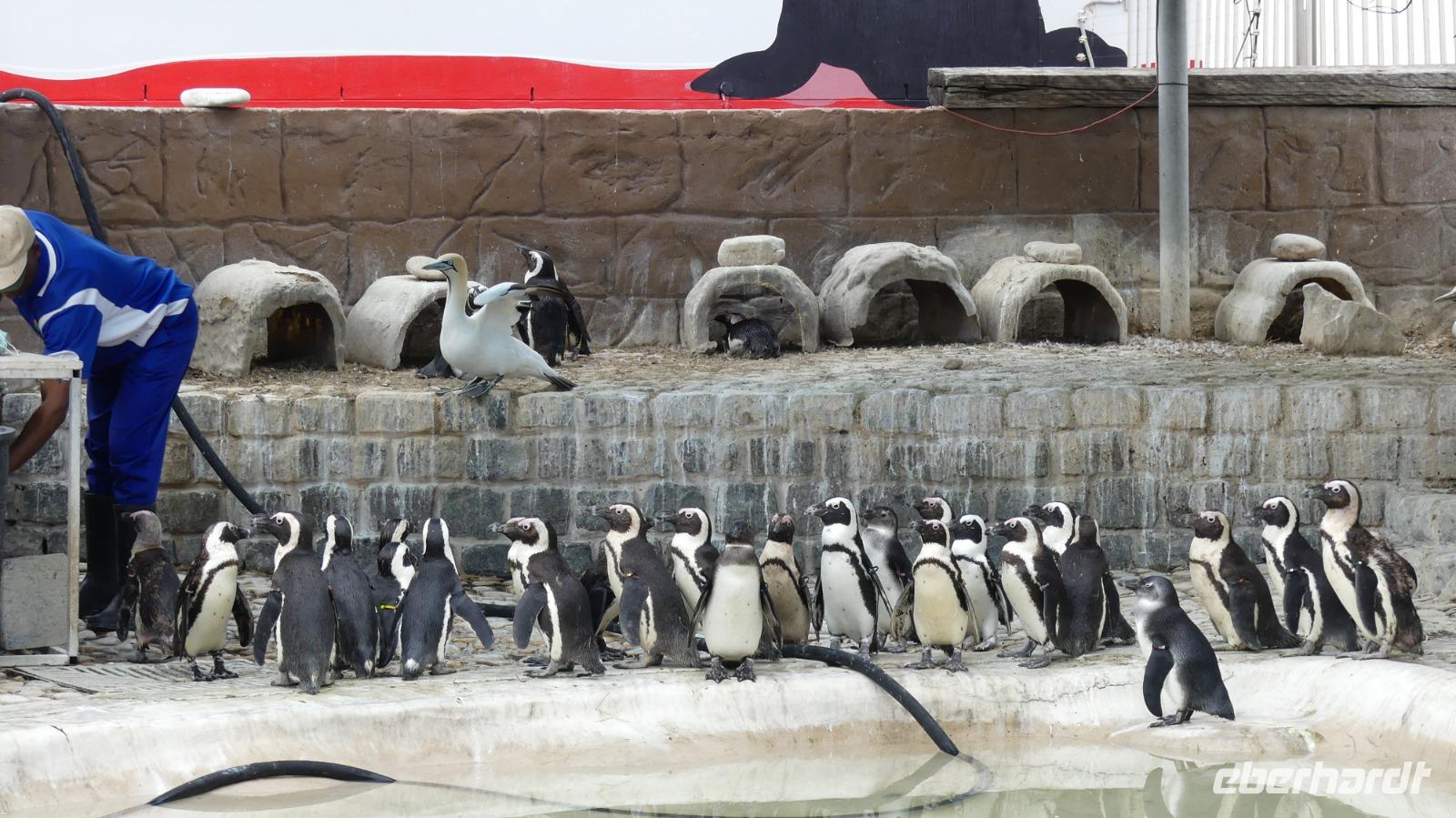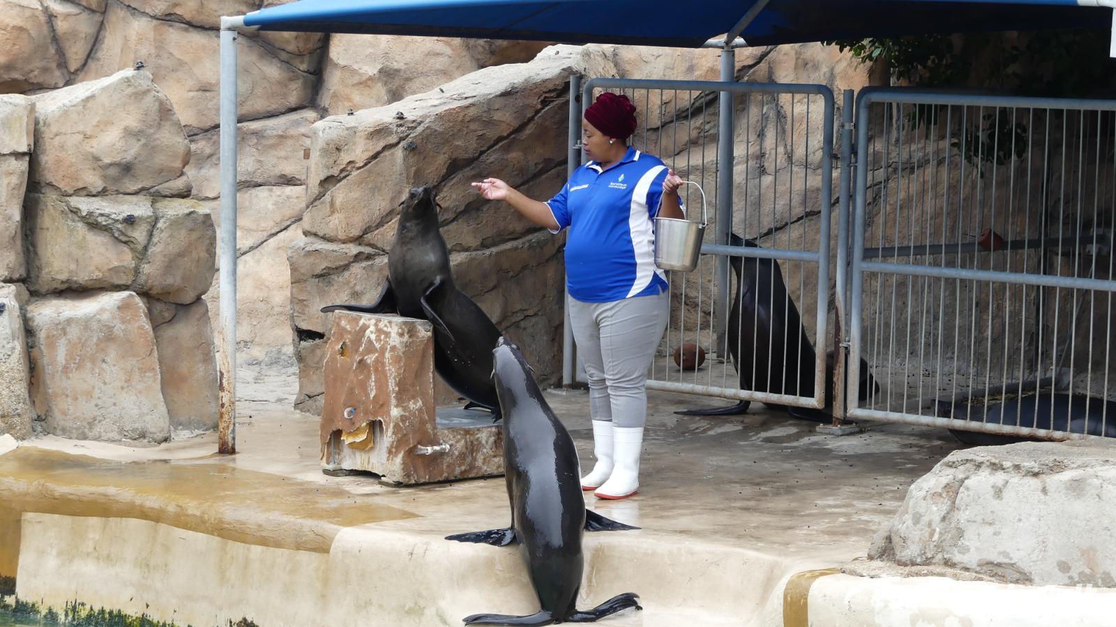„P. E." nennen die Einwohner von Port Elizabeth ihre Stadt. Es ist die drittgrößte Hafenstadt Südafrikas und Standort des größten Automobilwerkes (VW) in ganz Afrika. Das sehen wir schon im Hafen sehr deutlich, denn hier stehen tausende Polos am Kai, die auf ihre Verschiffung (auch nach Deutschland!) warten. Unsere Stadtrundfahrt wird fast ein Eberhardt-Exklusivausflug im Kleinbus mit 13 Personen, davon 10 aus unserer Gruppe. Das erste Ziel ist ein Fotostopp im Zentrum mit dem Rathaus und der alten Bibliothek. Anschließend halten wir am Leuchtturm mit der Steinpyramide, welche Elizabeth gewidmet ist, der Frau des Gouverneurs Donkin. Nach ihr wurde die Stadt benannt. Vom Fort Frederick aus haben wir einen schönen Ausblick auf die Algoa Bucht mit seinen weitläufigen Stränden und den Hafen mit der MS Albatros. Auch hier begleiten uns die „blauen Engel" (blau, weil sie blaue Poloshirts tragen). Ihre Anwesenheit gibt uns das Gefühl von größerer Sicherheit angesichts der hohen Kriminalitätsrate. Im Bayworld Oceanarium beobachten wir die Fütterung von Robben und Pinguinen. Und wer ein Foto mit einer Schlange machen möchte, kann dies gern tun. Mittags kehren wir von der Stadtrundfahrt auf´s Schiff zurück.