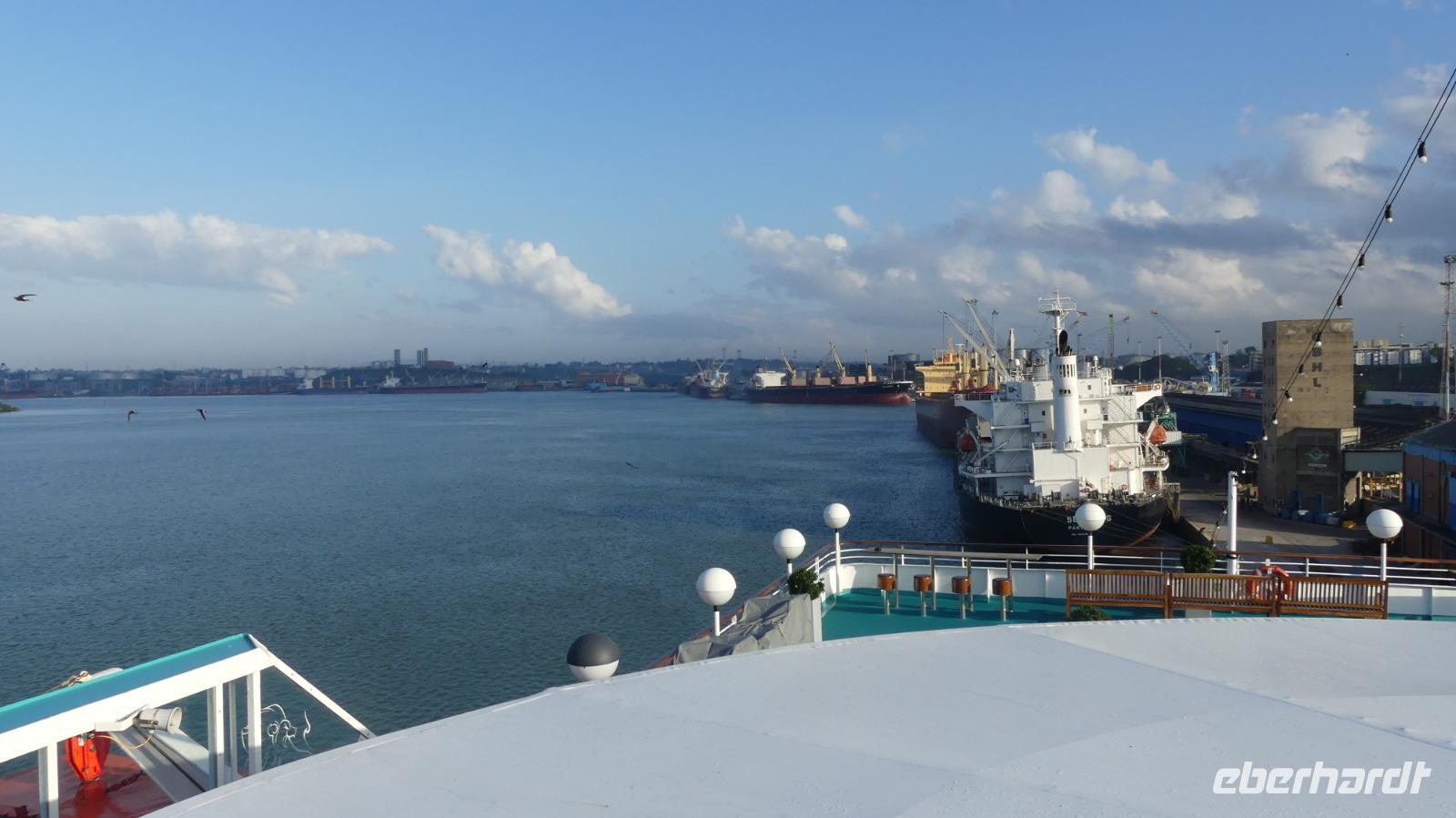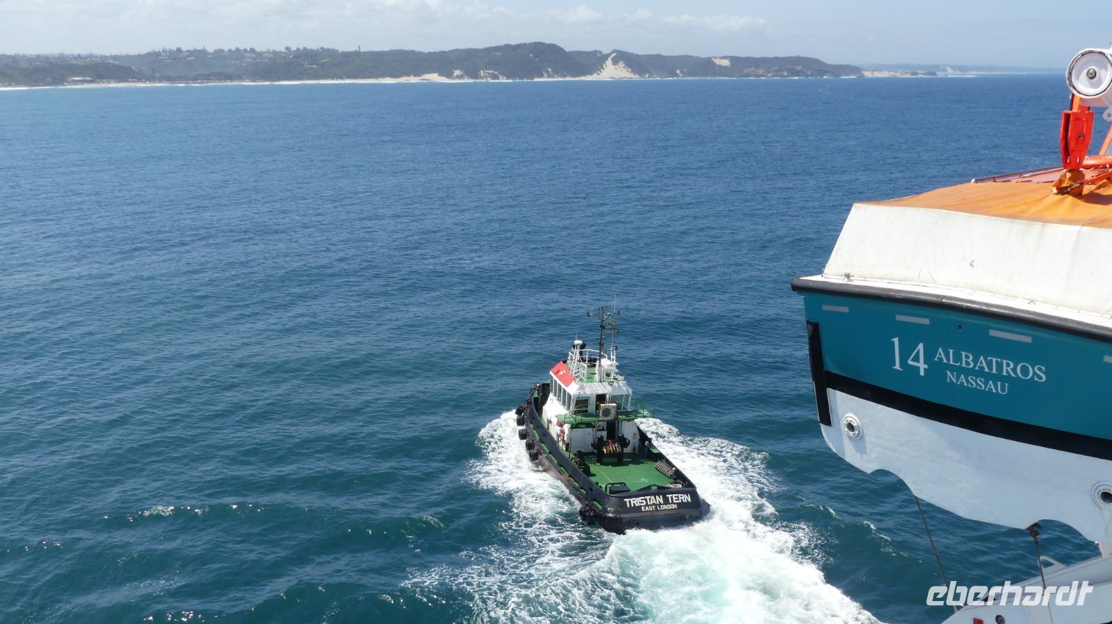 Kurz nach 6.00 Uhr am Morgen werden wir über Bordfunk von der verspäteten Ankunft in Richard´s Bay informiert. Ein Schlepper und ein Lotse, bzw. in diesem Fall eine Lotsin kommen später. Die Lotsin fliegt mit dem Hubschrauber ein. So können wir in aller Ruhe frühstücken und die Einfahrt in den riesigen Naturhafen verfolgen. In erster Linie handelt es sich aber um einen Industriehafen, wo insbesondere Steinkohle verschifft wird. Damit hat der Hafen eher einen robusten Charakter. Mit dem Anlegen der Albatros finden sich am Kai auch schon die ersten Souvenirhändler vor dem Schiff ein.