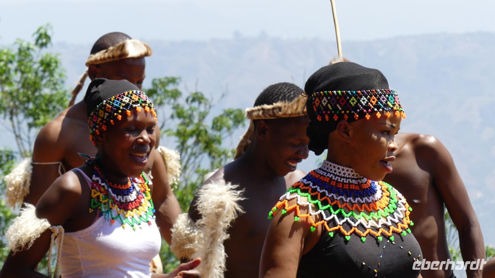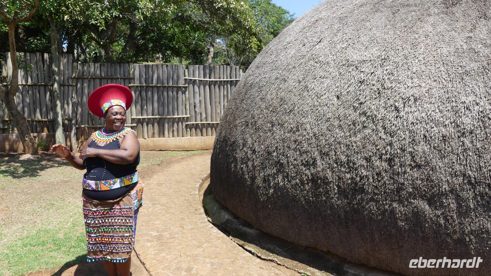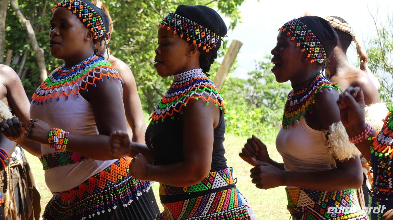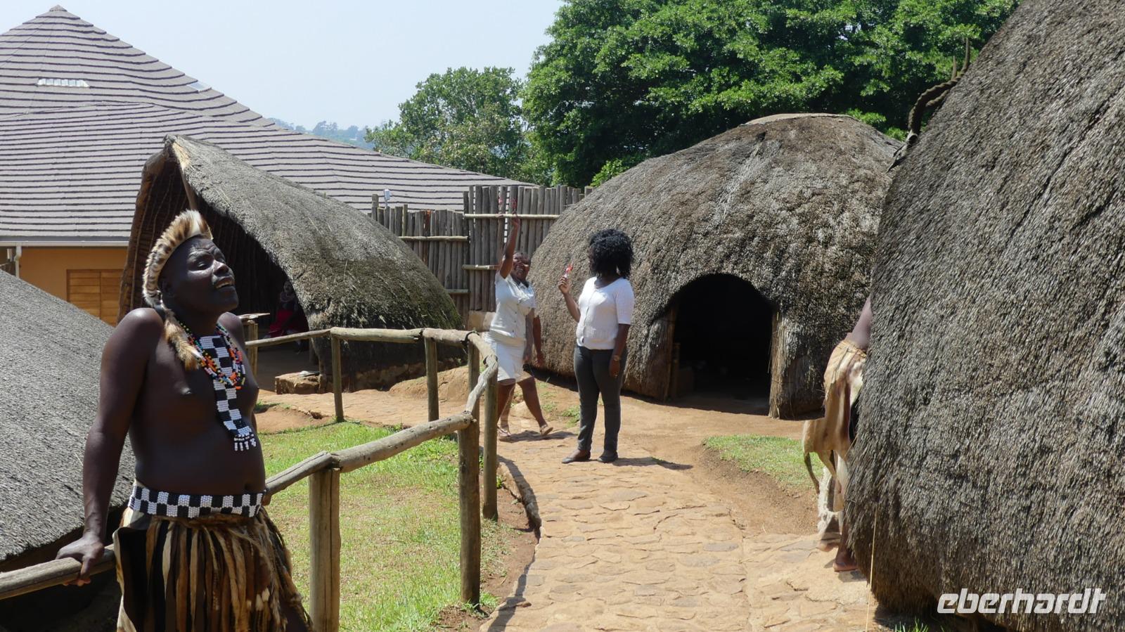Die 9 Gäste, welche mit mir ins „Tal der 1.000 Hügel" reisen, bekommen zumindest bei der Durchfahrt einen Eindruck von der Millionenstadt. Im Hügelland hinter Durban besuchen wir ein Zulu-Dorf. Dabei handelt es sich um eine ehemalige Filmkulisse die heute touristisch für Aufführungen genutzt wird. Ein Videofilmer der MS Albatros nimmt ebenfalls an diesem Ausflug teil und sorgt mit seiner Fotodrohne für große Aufmerksamkeit besonders bei den Kindern. Am Zulu-Dorf werden wir außerdem durch den Reptilienpark geführt, wo sich insbesondere viele Krokodile in verschiedenen Altersgruppen von ganz klein bis zum 4,6 Meter großen und 99 Jahre alten Krokodil befinden. Auch Schildkröten, Schlangen und Echsen sind zu sehen.