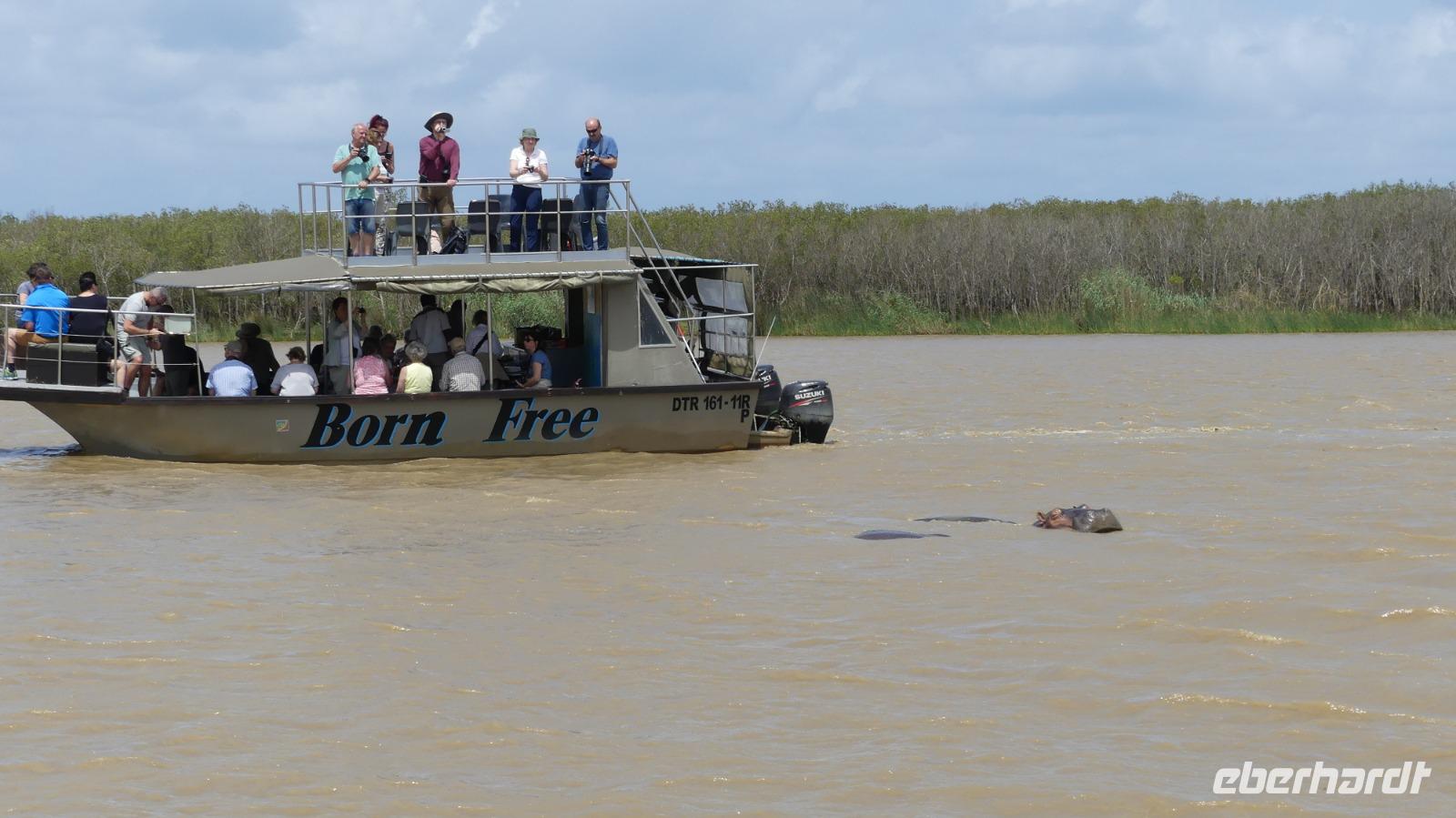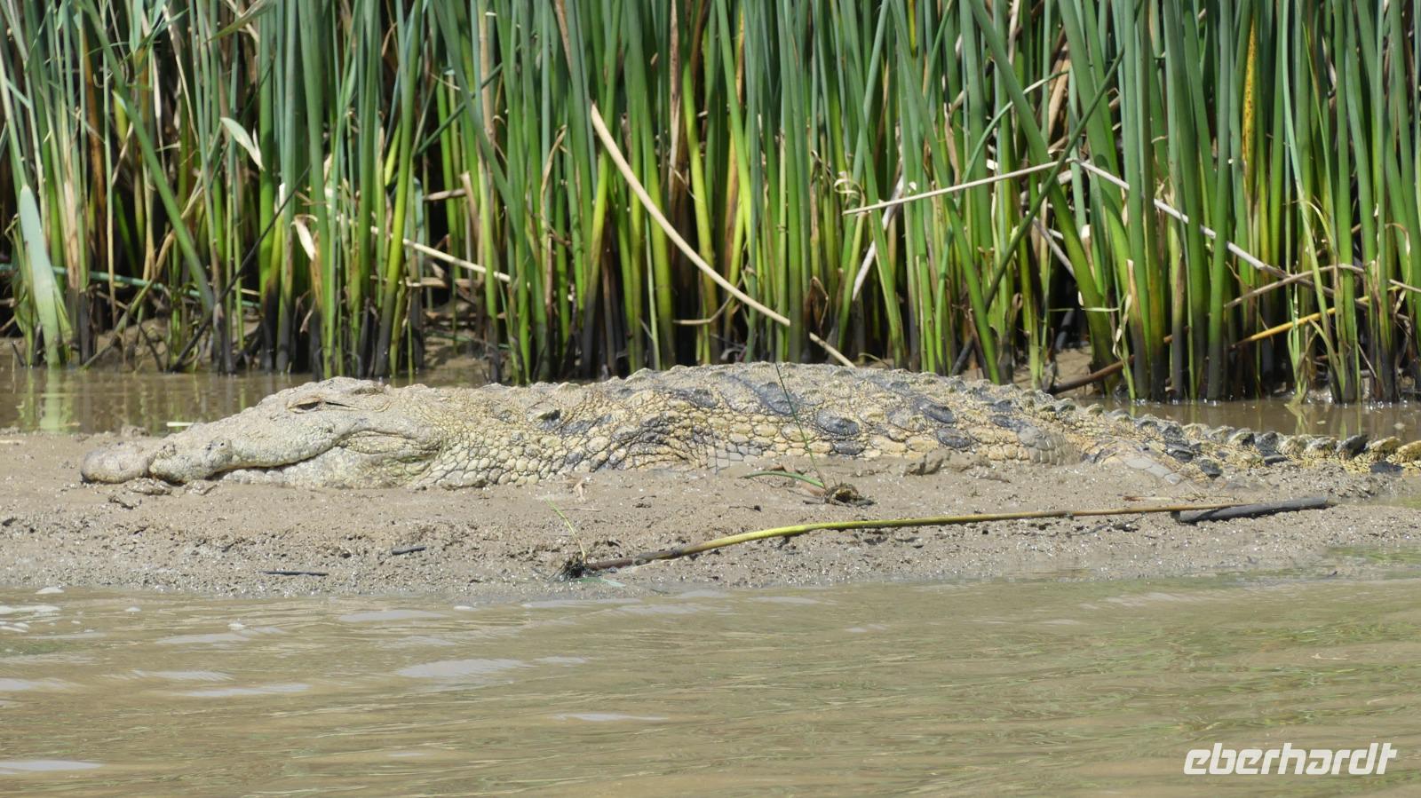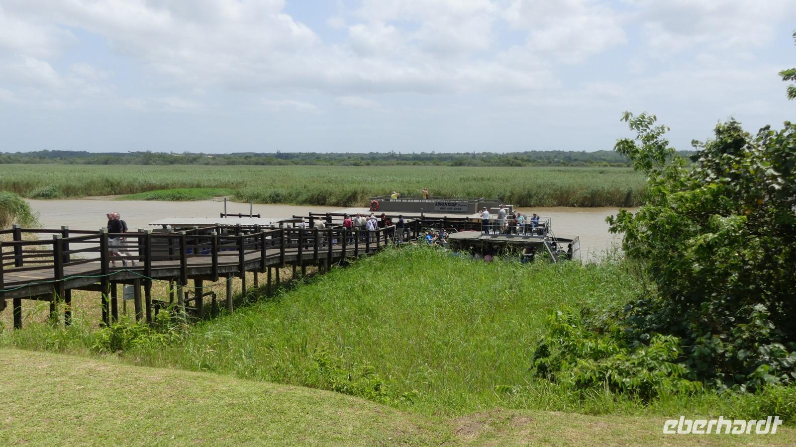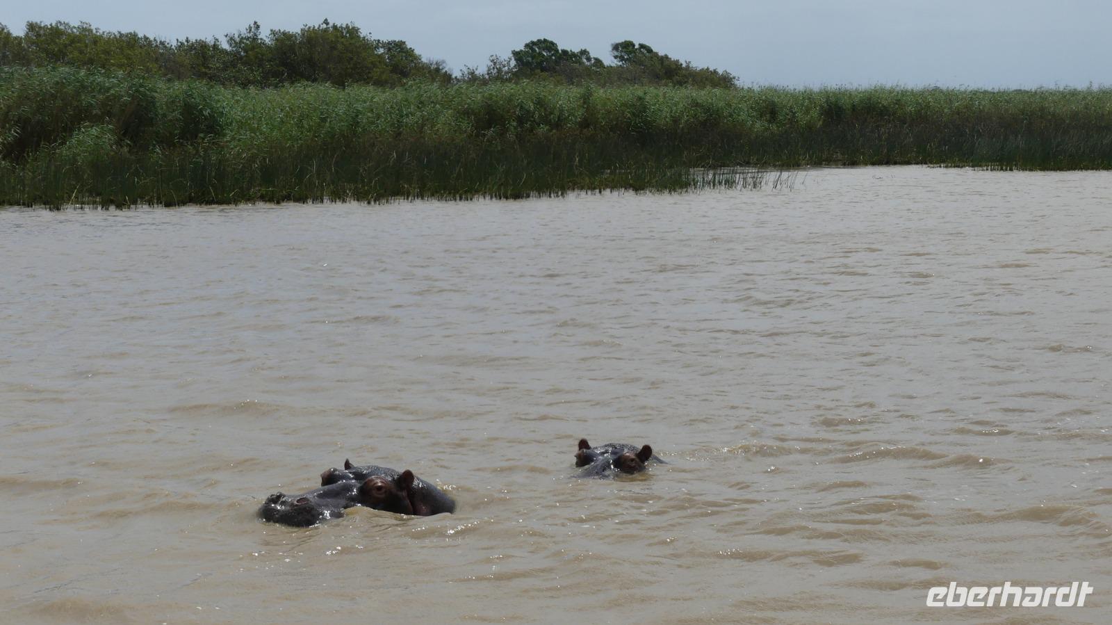 Unsere Ausflugsziele befinden sich sämtlich außerhalb der von Industrie geprägten Stadt. Wir verteilen uns auf folgende Ziele: Hluhluwe Nationalpark (spricht man „schluwe" aus), Thula Thula Pirschfahrt, Shakaland sowie Bootsfahrt auf dem St. Lucia See. Der Ausflug zum St. Lucia See führt uns zunächst an weitreichenden Monokulturen von Eukalyptusbäumen vorbei. Ihre Stämme werden im Bergbau eingesetzt oder zu Zellulose verarbeitet. Nach einem Stopp am Crocodile Centre bei St. Lucia kann man anschließend bei der Bootsfahrt auf dem St. Lucia See Krokodile auch in freier Wildbahn sichten. Aber die Hauptattraktion sind die Flußpferde, von denen es hier am See ca. 900 geben soll. Auch Flamingos und andere Wasservögel sind hier zu sehen.