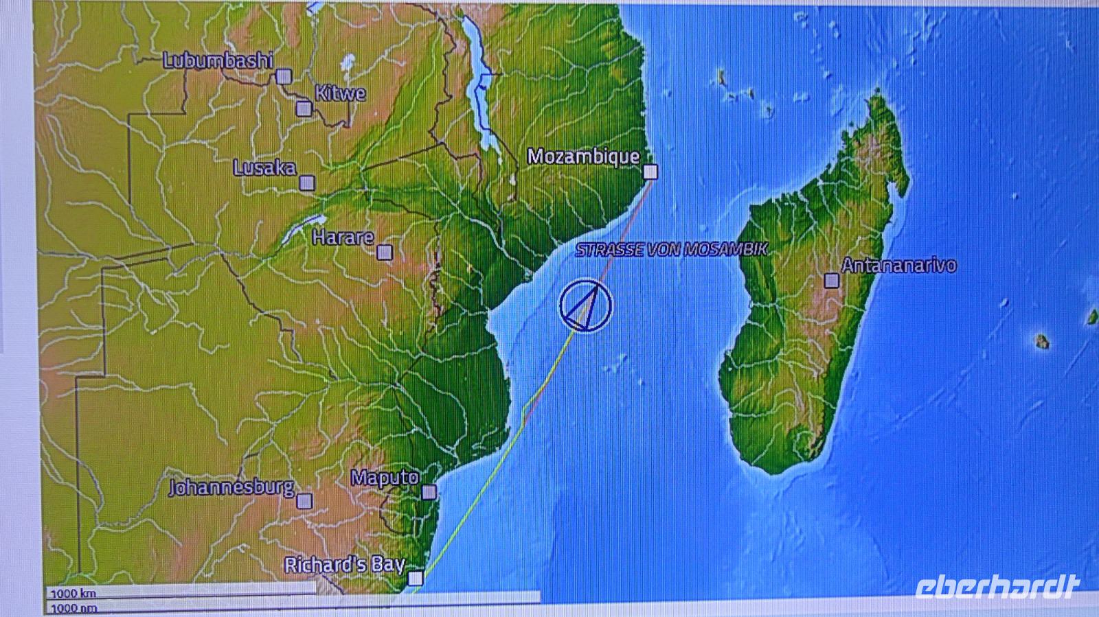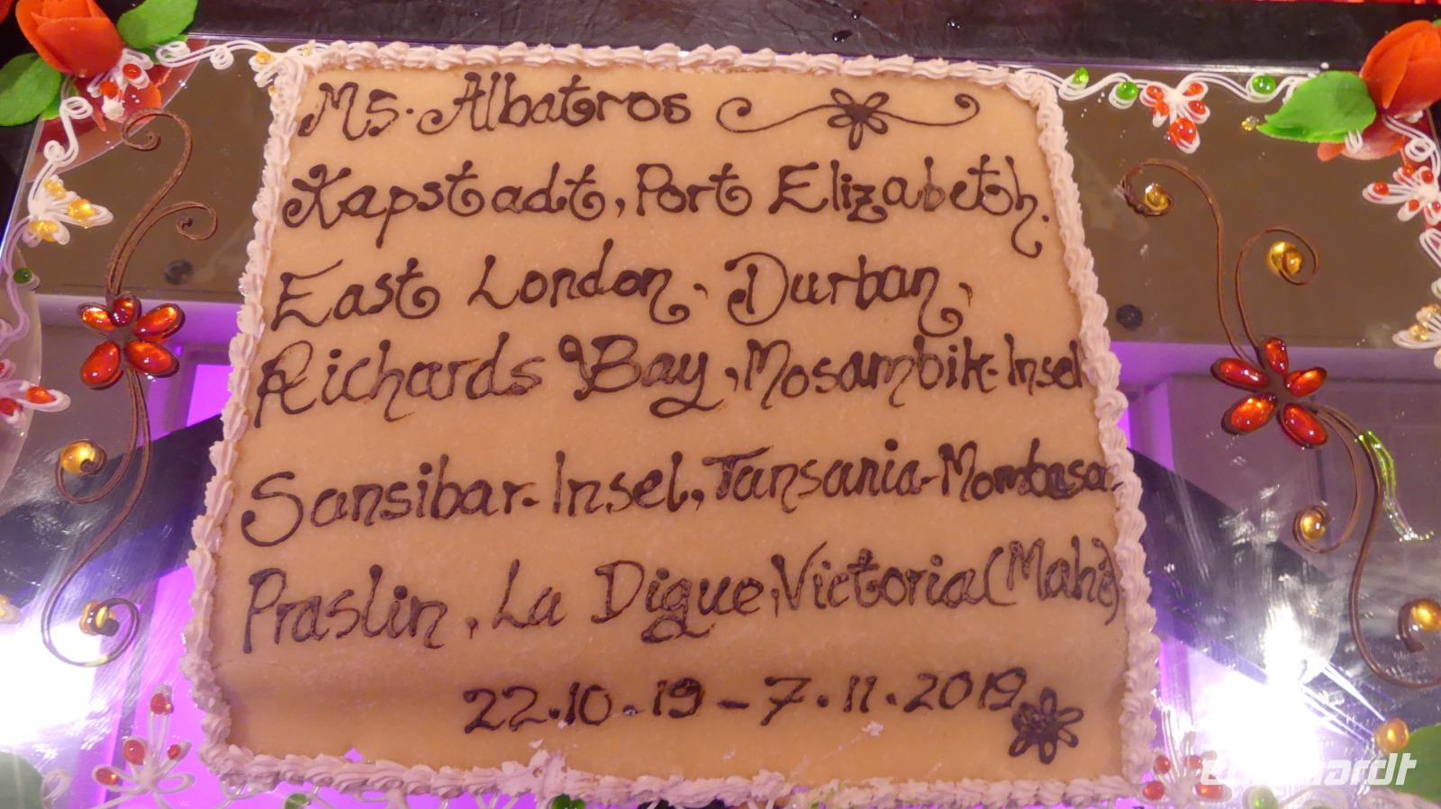 Zur Mittagszeit sind wir wieder alle an Bord. Nach sechs Stunden Aufenthalt verlassen wir bereits 13.00 Uhr East London, denn zu unserem nächsten Ziel, Durban, ist es ein langer Weg. Es ist die erste Ausfahrt bei Tageslicht und so wie schon den ganzen Vormittag haben wir dazu Sonnenschein und angenehme Temperaturen, was uns angesichts einer ursprünglich schlechten Wetterprognose mit Regen umso mehr freut. So können wir auch den Nachmittag an Bord bei freundlichem Wetter an der frischen Luft verbringen. Zwischendurch schauen wir mal bei der Kaffeestunde vorbei - heute besonders lecker, denn das Motto heißt „Alles Schokolade" ?. Und auch das Abendessen widmet sich heute zum Sonnabend einem speziellen Thema, nämlich „Mama Afrika" mit Gerichten wie „Durban Bunny Chow", „Poke Bowl" oder „Duitse Kuns".