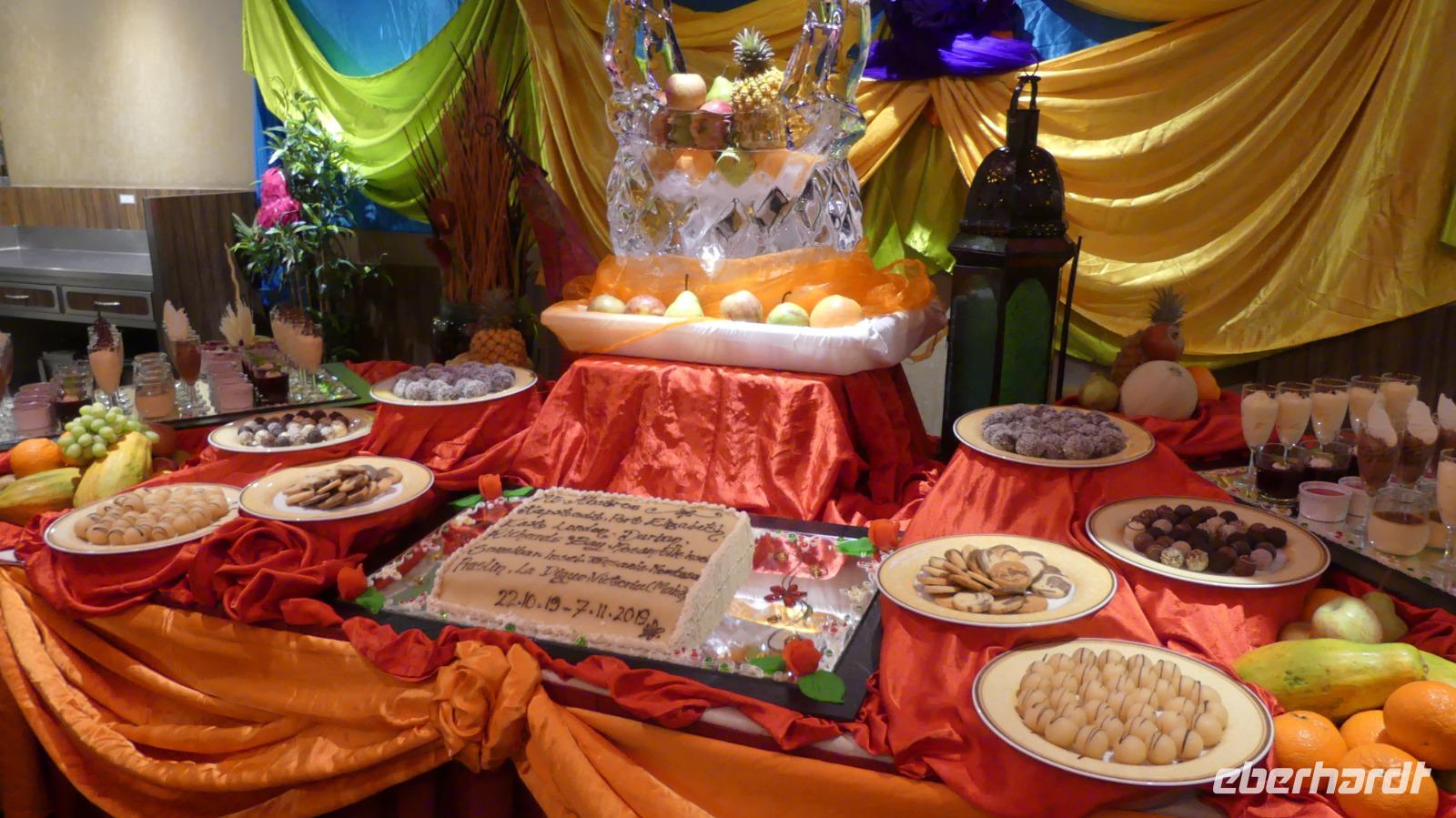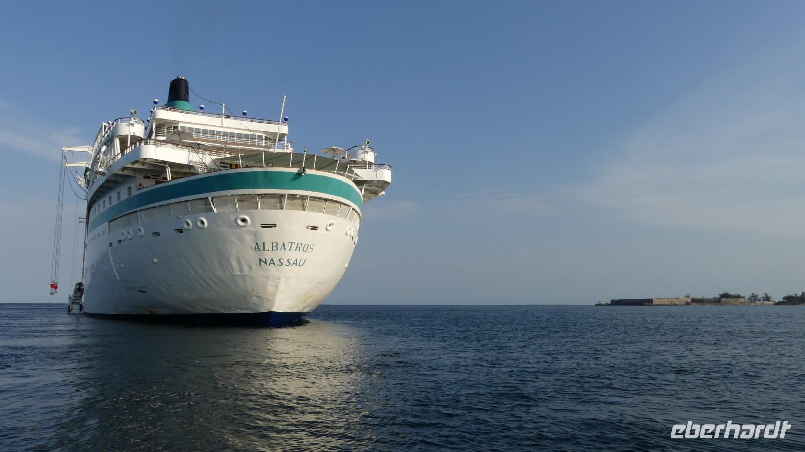 Für die 970 Seemeilen (1.800 km) lange Fahrt bis zur Ilha de Mocambique (Mosambik-Insel) benötigen wir zwei Seetage. Zeit um morgens etwas länger zu schlafen, das Frühstück ganz in Ruhe zu genießen und das ein oder andere Angebot an Bord zu nutzen - zum Beispiel etwas mit Sport, um die Nebenwirkungen des guten Essens in Griff zu bekommen ?. Am Dienstag, den ersten der beiden Seetage schaukelt die Albatros mehr als sonst, denn das Meer ist bei Seestärke 4 etwas unruhig. Beim Gruppentreff im Kino stimmen wir uns auf die nächsten Tage in Ostafrika ein. Am folgenden Seetag hat sich die See beruhigt und die Sonne scheint, Gelegenheit die Reise auf den Außendecks zu genießen. Nachmittags laufen in den Restaurants die Vorbereitungen für das „Buffet Magnifique". Vor der Eröffnung des wunderschön aufgestellten Buffets wird für die Fotographen ein extra Fototermin angesetzt. Das Gala Abendessen bietet viele Köstlichkeiten von Sushi über kanadischen Hummer, Truthahn, Fjord-Lachs bis zu Delikatessen aus der Patisserie. Im Anschluss sorgt Amanda, die Nilpferd-Dame, in der Show Lounge für einen amüsanten Tagesabschluss. Als Puppe wird Amanda durch den Bauchredner Sebastian Reich gekonnt in Szene gesetzt.