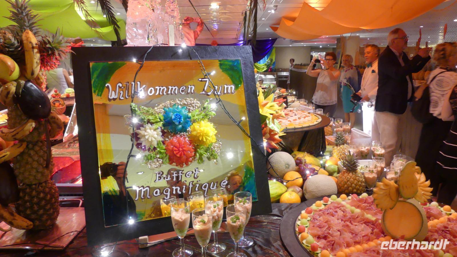 Bei Phönix ist man erstmal etwas überrascht, dass eine Gruppe an Bord kommt. Das macht aber überhaupt nichts, denn wir sind beim Einchecken gerade die Einzigen und so geht alles ganz schnell, schon nach wenigen Minuten halten wir unsere Bordkarte, das wichtigste Dokument für die nächsten 16 Tage in den Händen. Auch die Koffer worden umgehend auf die Kabinen gebracht. Nun können wir unser schwimmendes Hotel näher in Augenschein nehmen bzw. erstmal ganz in Ruhe ankommen und einen Kaffee am Lido-Buffet auf Deck 6 genießen. Im Restaurant war inzwischen der Maître so freundlich, uns zwei Gruppentische zu reservieren - von nun an unser Treffpunkt zu den Mahlzeiten.