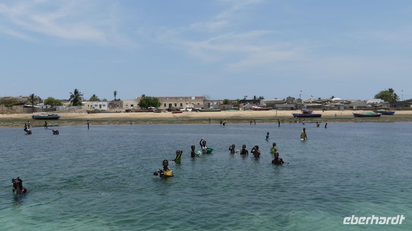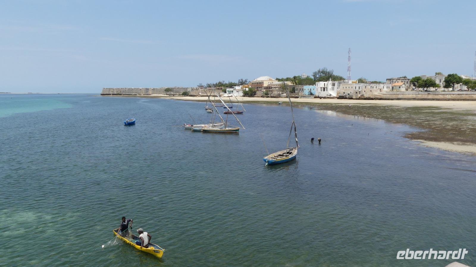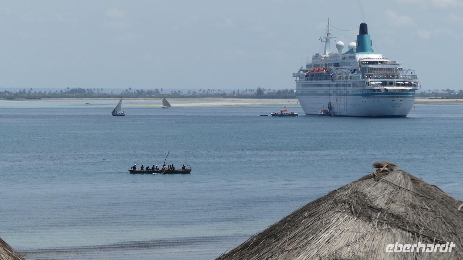 Mit einem Rettungsboot tendern wir am Morgen gemeinsam zur Insel. Die Bewohner empfangen uns freundlich mit Tänzen und Gesängen. Hinter der Pier grüßt die Statue Vasco da Gamas die Ankömmlinge und erinnert damit an den portugiesischen Einfluss. Wir unternehmen einen Spaziergang zur Festung San Sebastiao an der Nordspitze der Insel. Die Portugiesen hatten im 16. Jahrhundert jeden Stein für diese mächtige Anlage mit Schiffen von Portugal hier hergebracht.