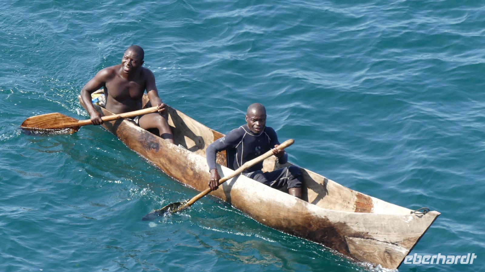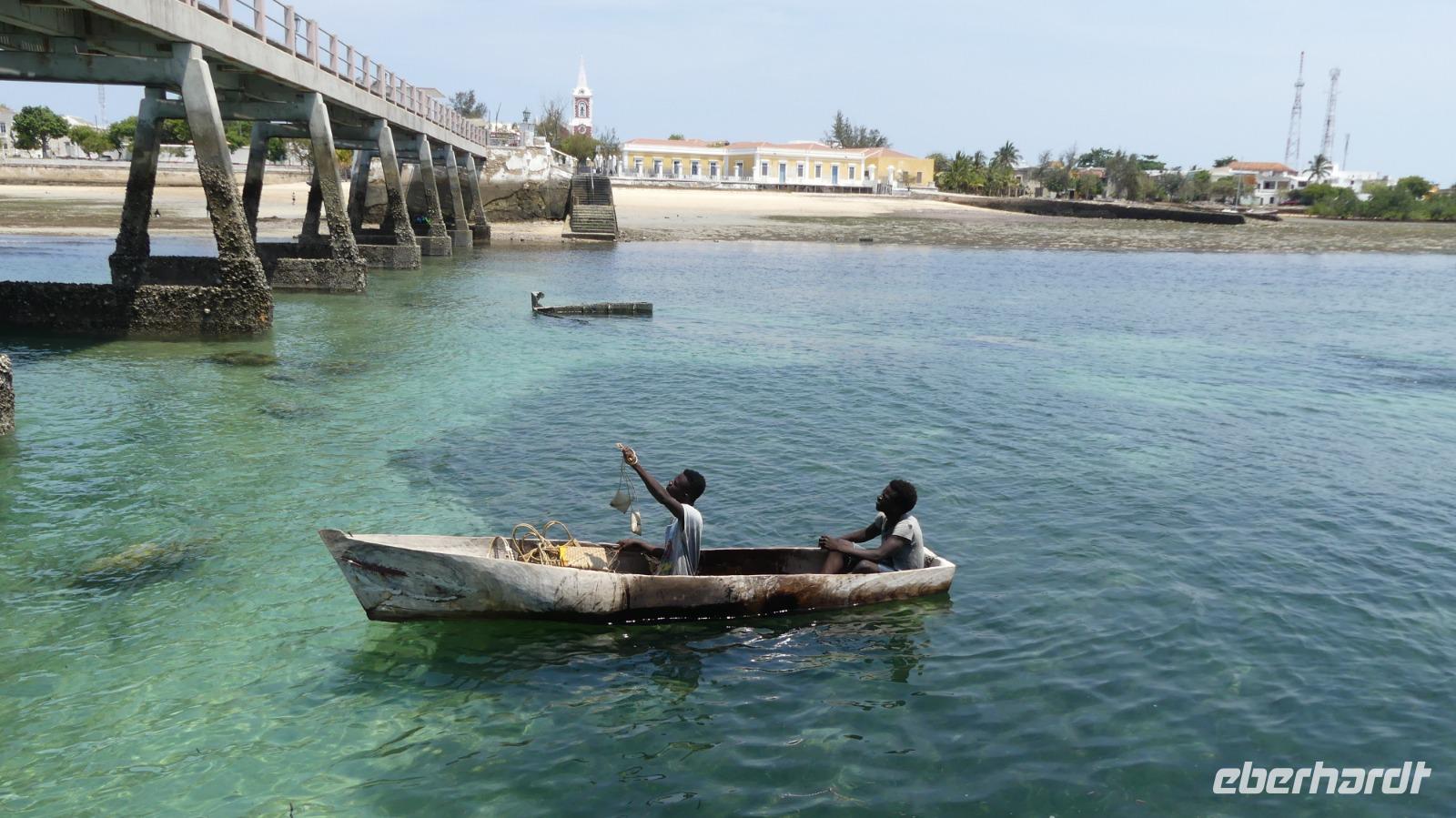 Als wir am Morgen die Mosambik-Insel erreichen, versprechen schon die Ausblicke vom Schiff einen interessanten Tag. Zwei Fischer paddeln mit einem Einbaum zu uns, um Fisch zu verkaufen - diese „Nussschale" neben unserem Kreuzfahrtschiff, was für ein Kontrast.