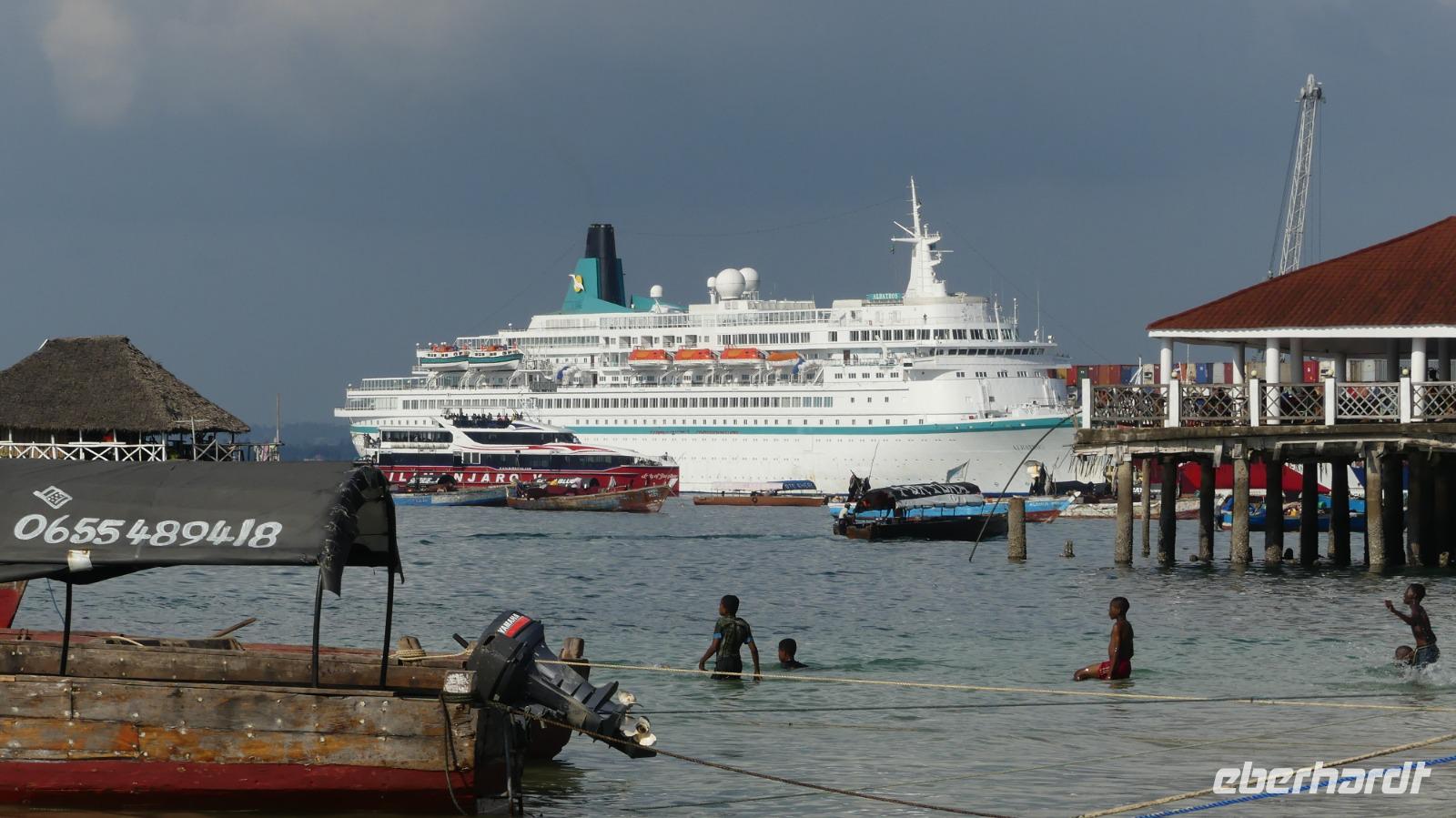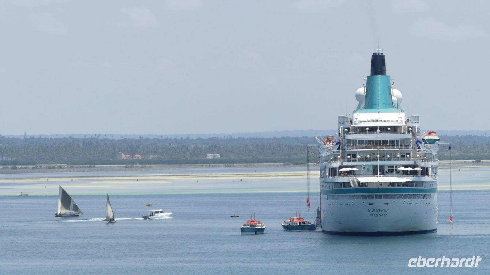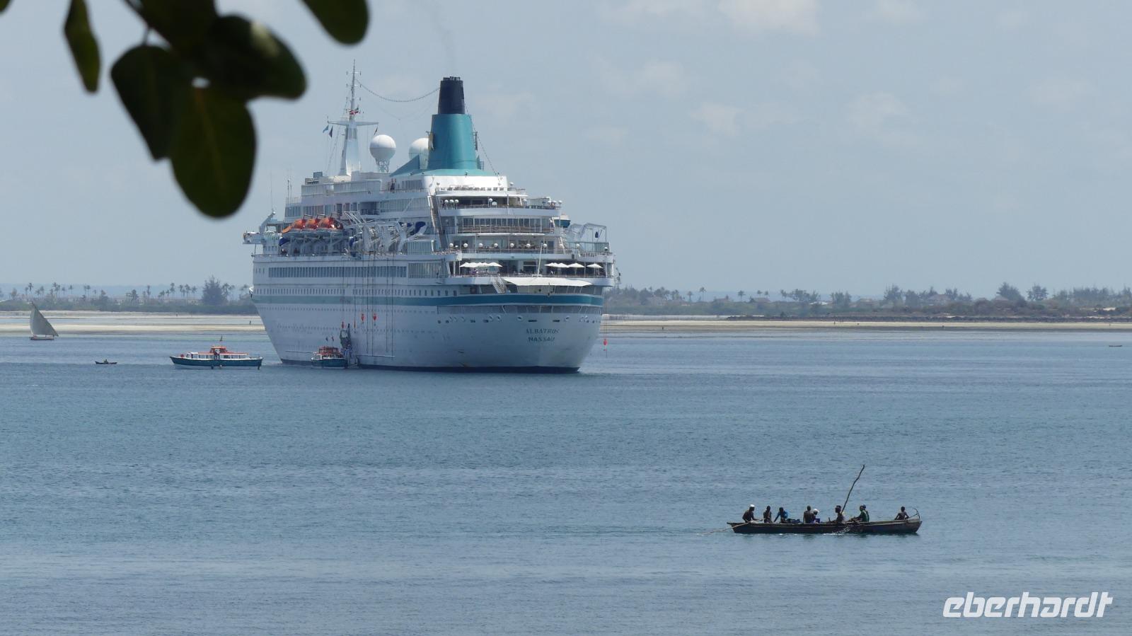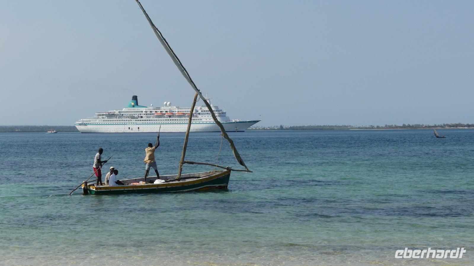 Es ist wieder einer dieser schönen Tage mit einer ruhigen See, blauen Himmel, Sonnenschein und sommerlichen Temperaturen von 28 bis 30 Grad. Am Morgen befinden wir uns nur 16 Seemeilen vor der Küste Mosambiks. Wer die See beobachtet, wird oft fliegende Fische entdecken. Erstaunlich ist jedoch, dass uns kein anderes Schiff begegnet. Nach der Zeitumstellung von 12.00 auf 13.00 Uhr stimmen wir uns am Nachmittag auf Sansibar ein. Neben den gewohnten Aktivitäten des Bordprogramms gibt es außerdem eine Modenschau, bei der Passagiere die Hauptakteure sind.