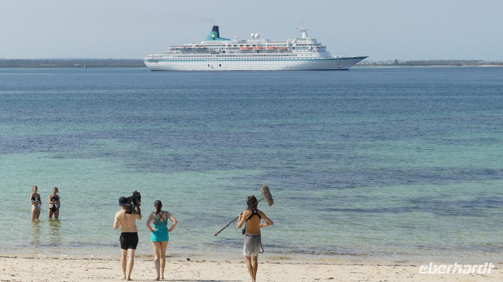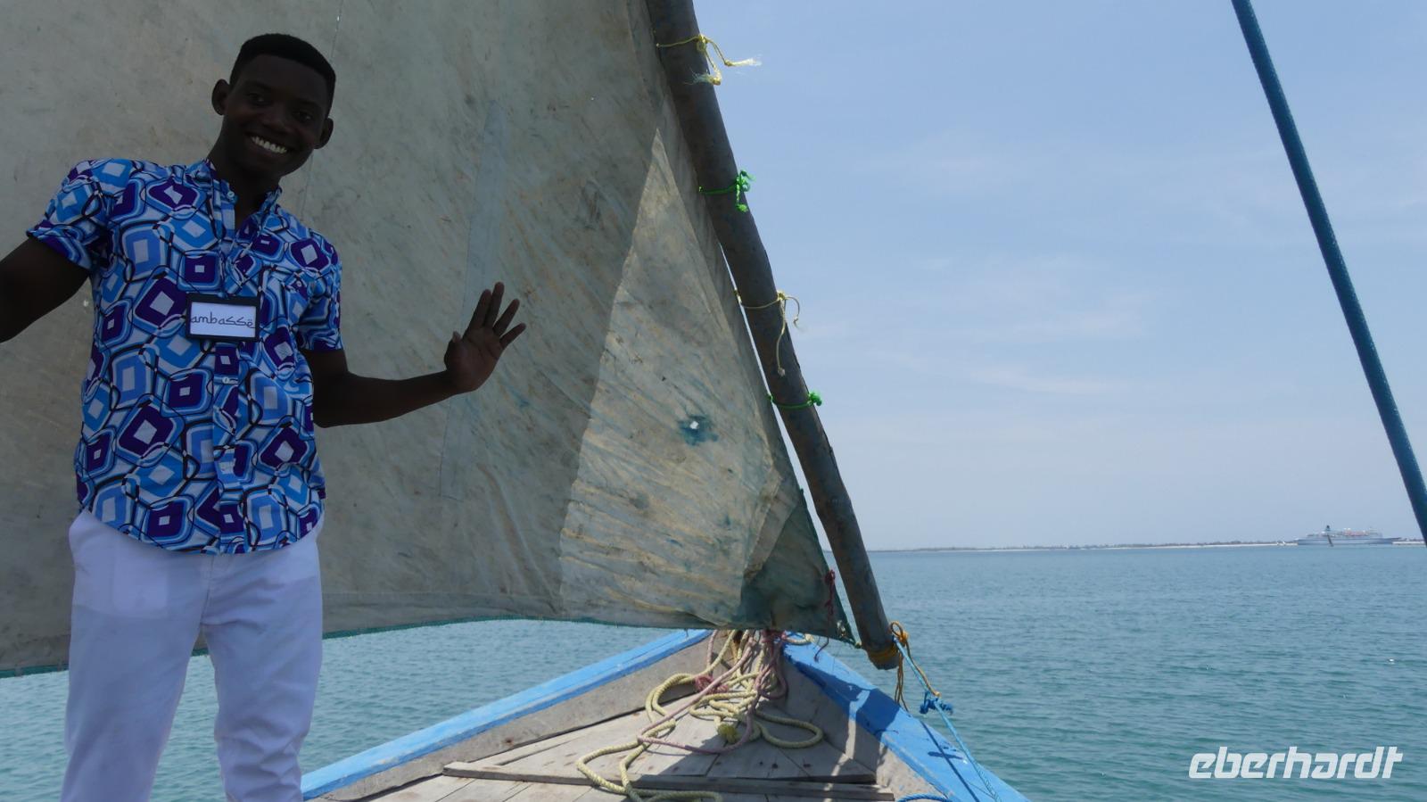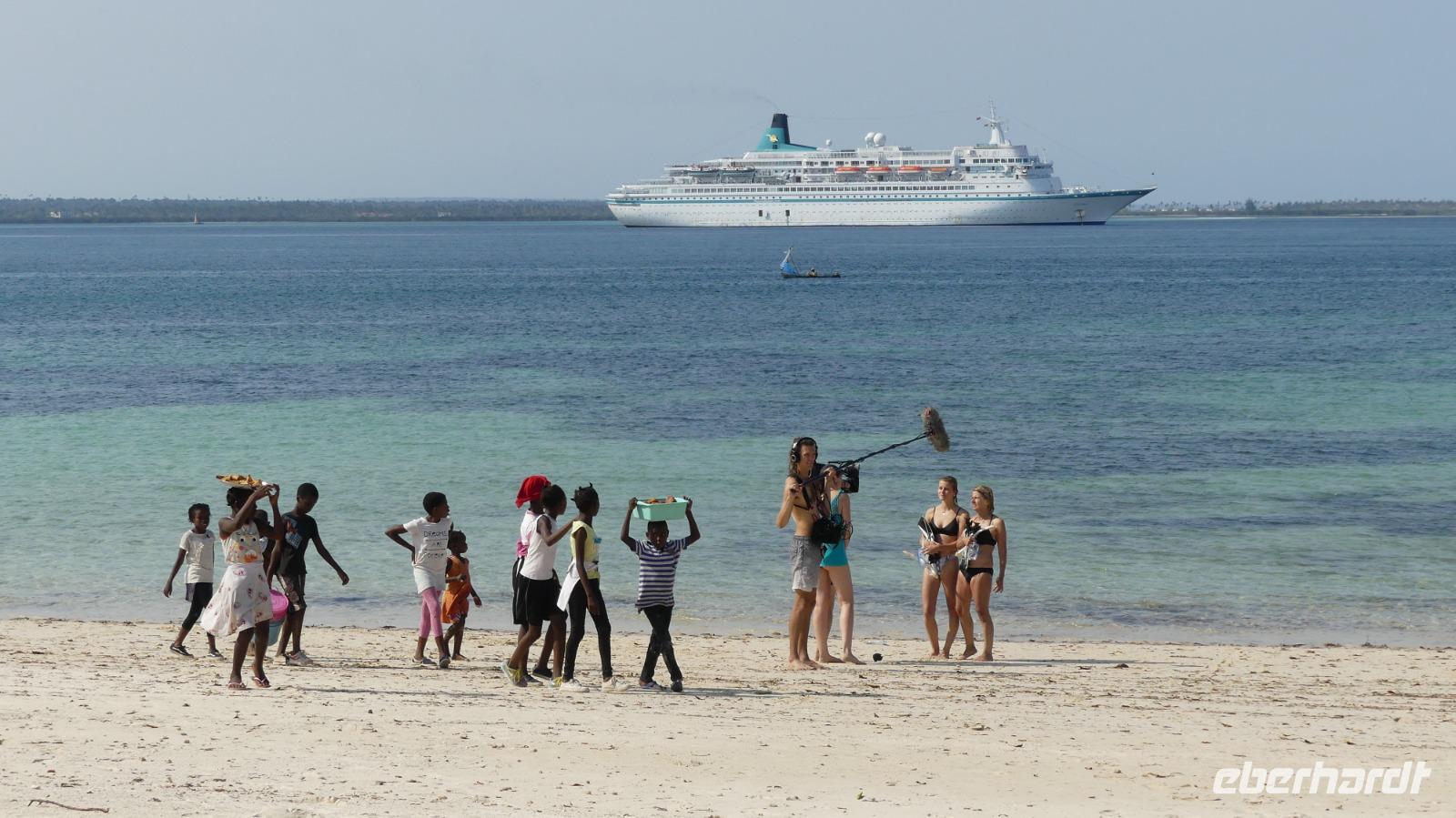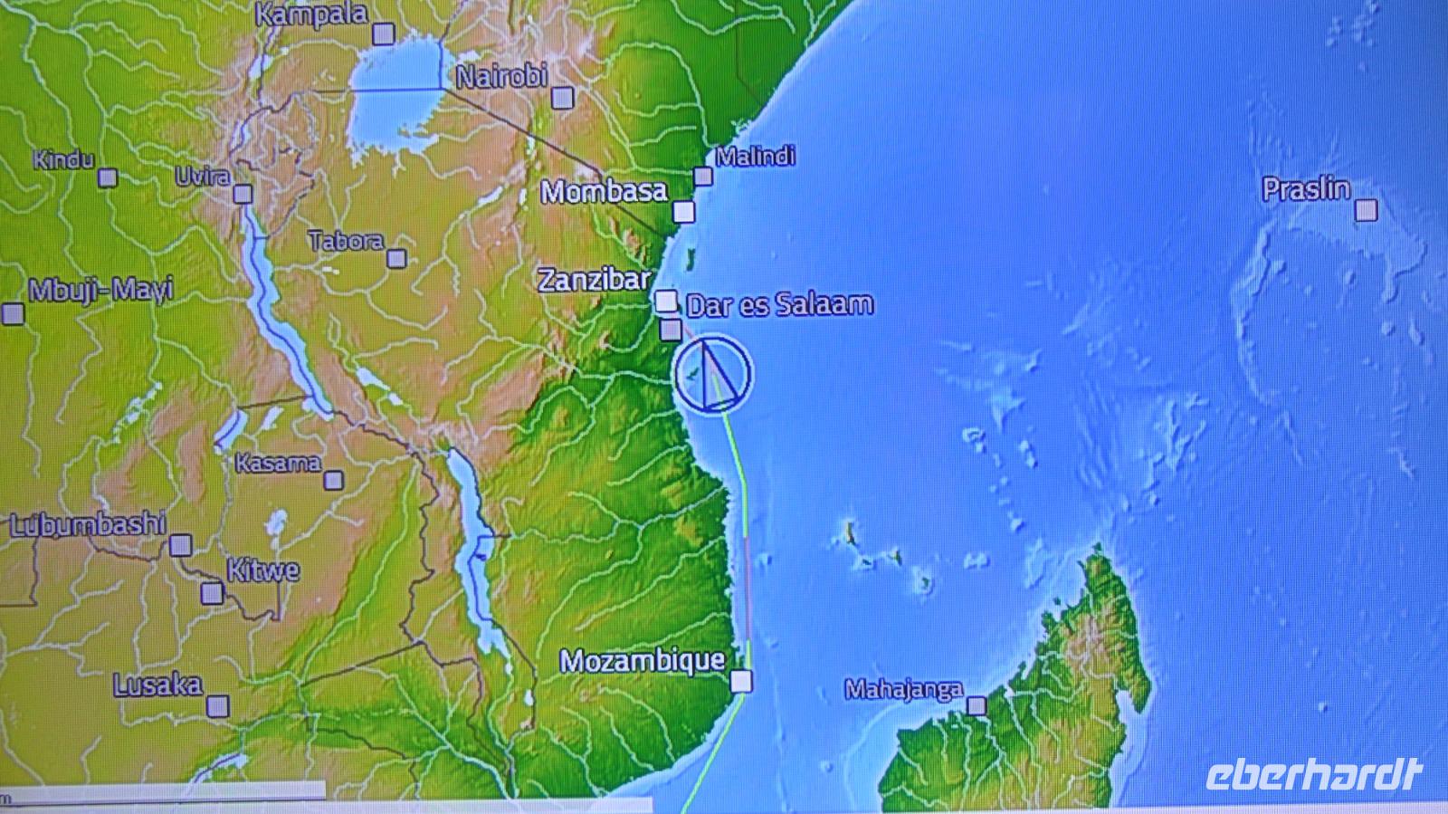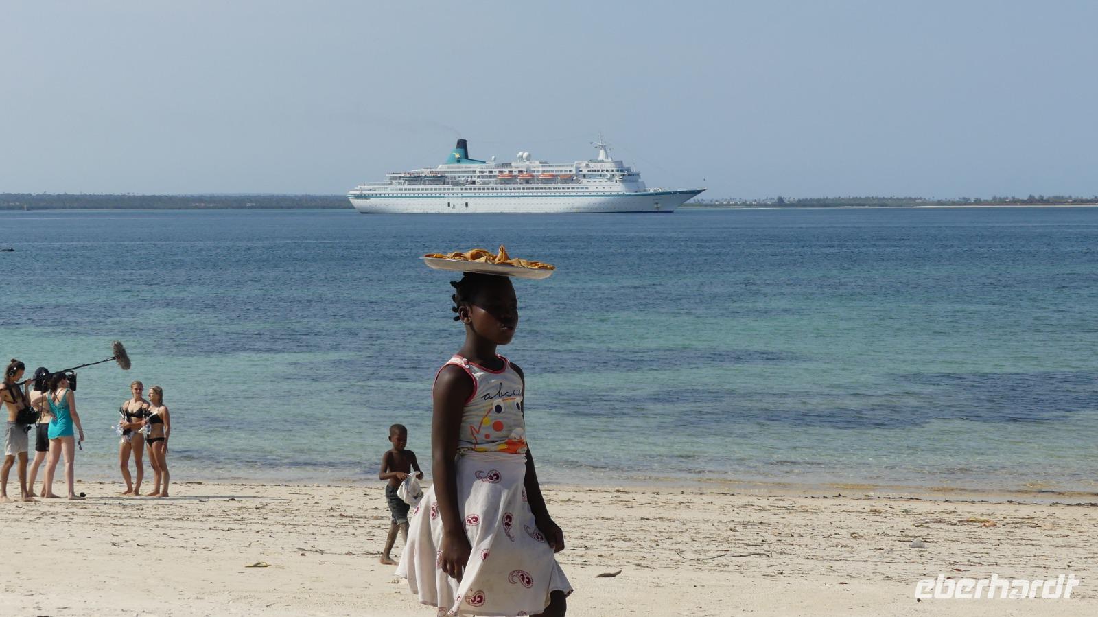 Es ist wieder einer dieser schönen Tage mit einer ruhigen See, blauen Himmel, Sonnenschein und sommerlichen Temperaturen von 28 bis 30 Grad. Am Morgen befinden wir uns nur 16 Seemeilen vor der Küste Mosambiks. Wer die See beobachtet, wird oft fliegende Fische entdecken. Erstaunlich ist jedoch, dass uns kein anderes Schiff begegnet. Nach der Zeitumstellung von 12.00 auf 13.00 Uhr stimmen wir uns am Nachmittag auf Sansibar ein. Neben den gewohnten Aktivitäten des Bordprogramms gibt es außerdem eine Modenschau, bei der Passagiere die Hauptakteure sind.