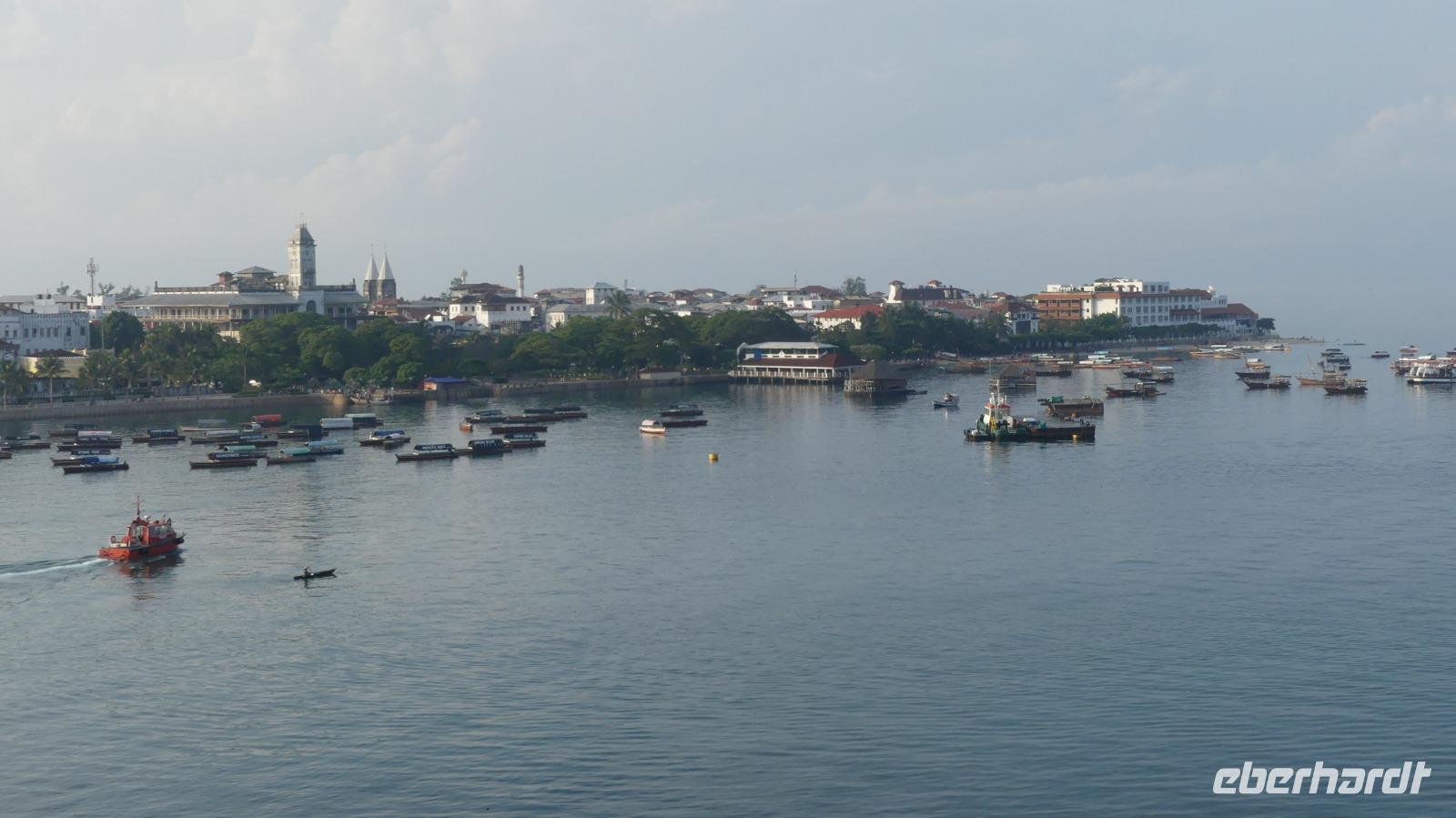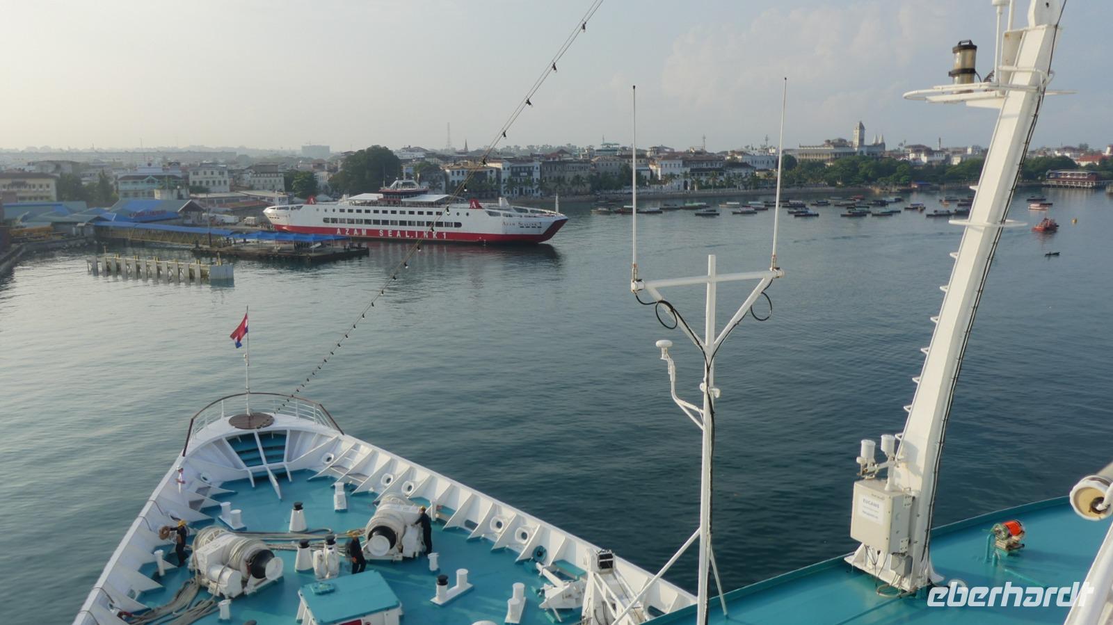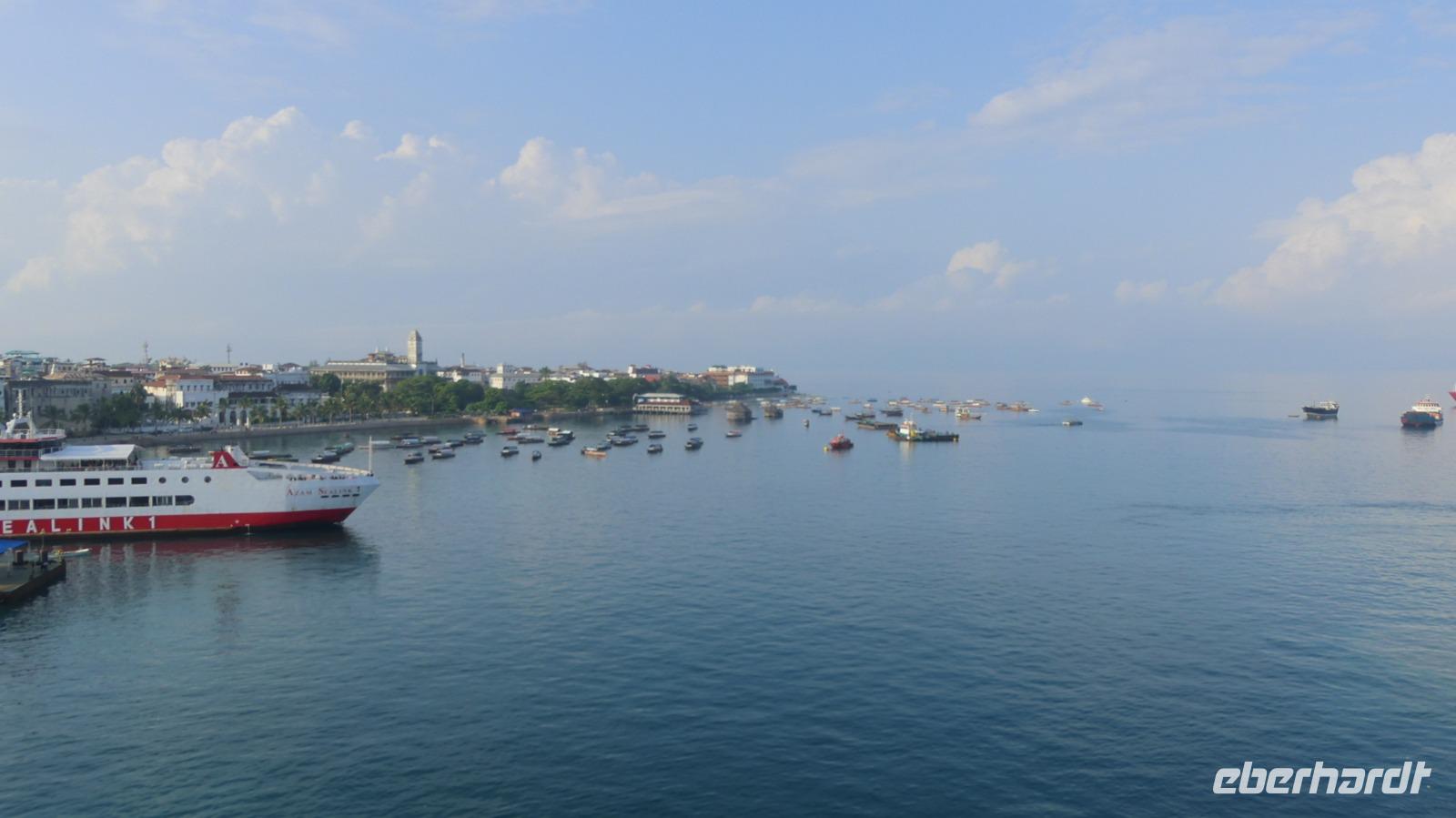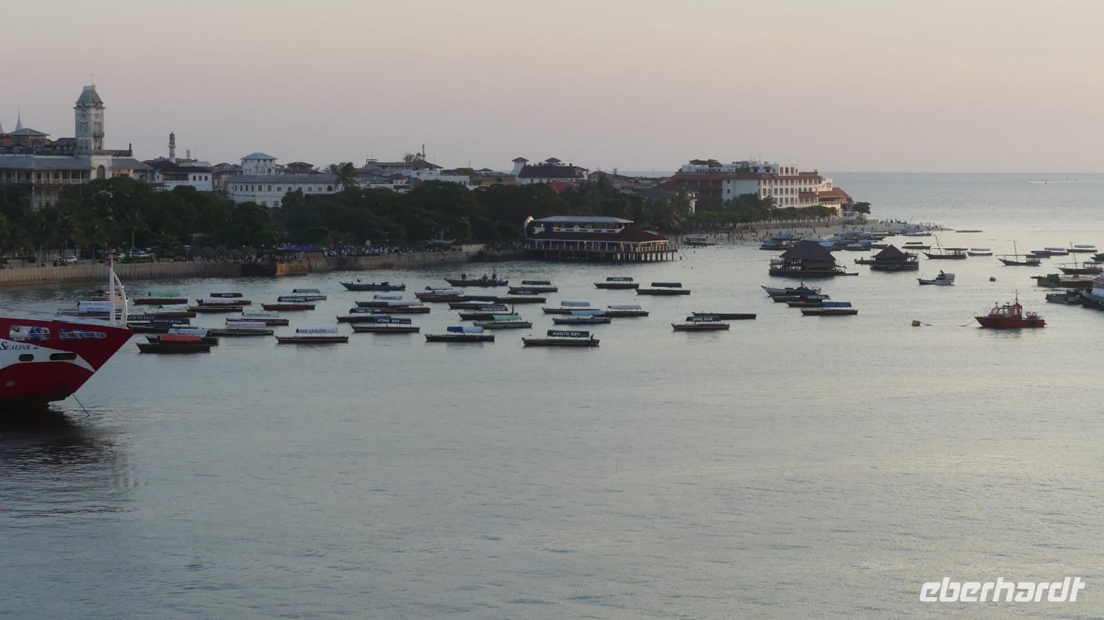 Pünktlich mit der untergehenden Sonne legt die MS Albatros ab. Im Abendlicht haben wir zum Abschied nochmal einen schönen Blick auf Stone Town. Beim näheren Hinschauen entdecken wir in der dahinter liegenden Neustadt die DDR Plattenbauten, ein Relikt der jüngeren Geschichte.