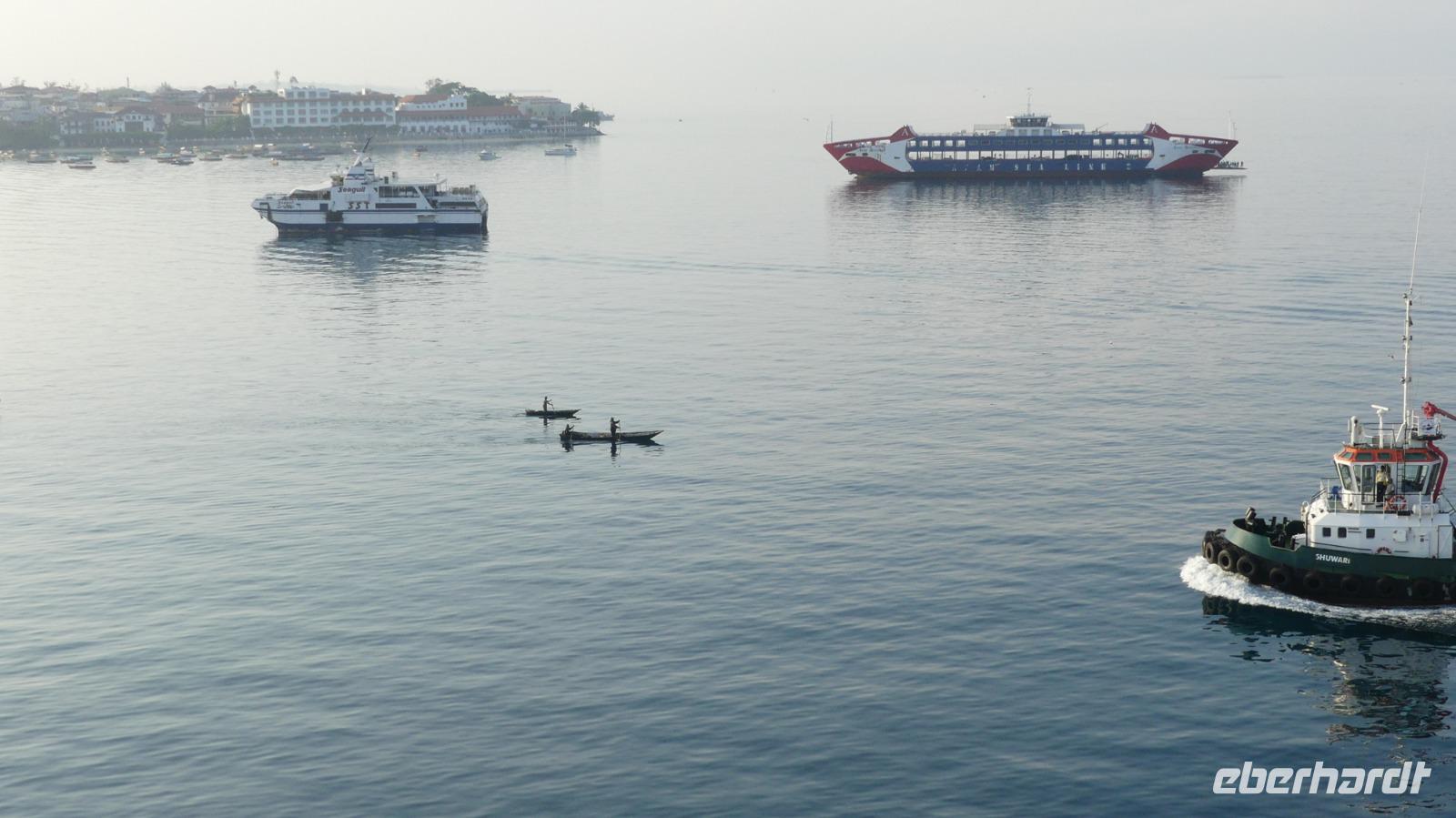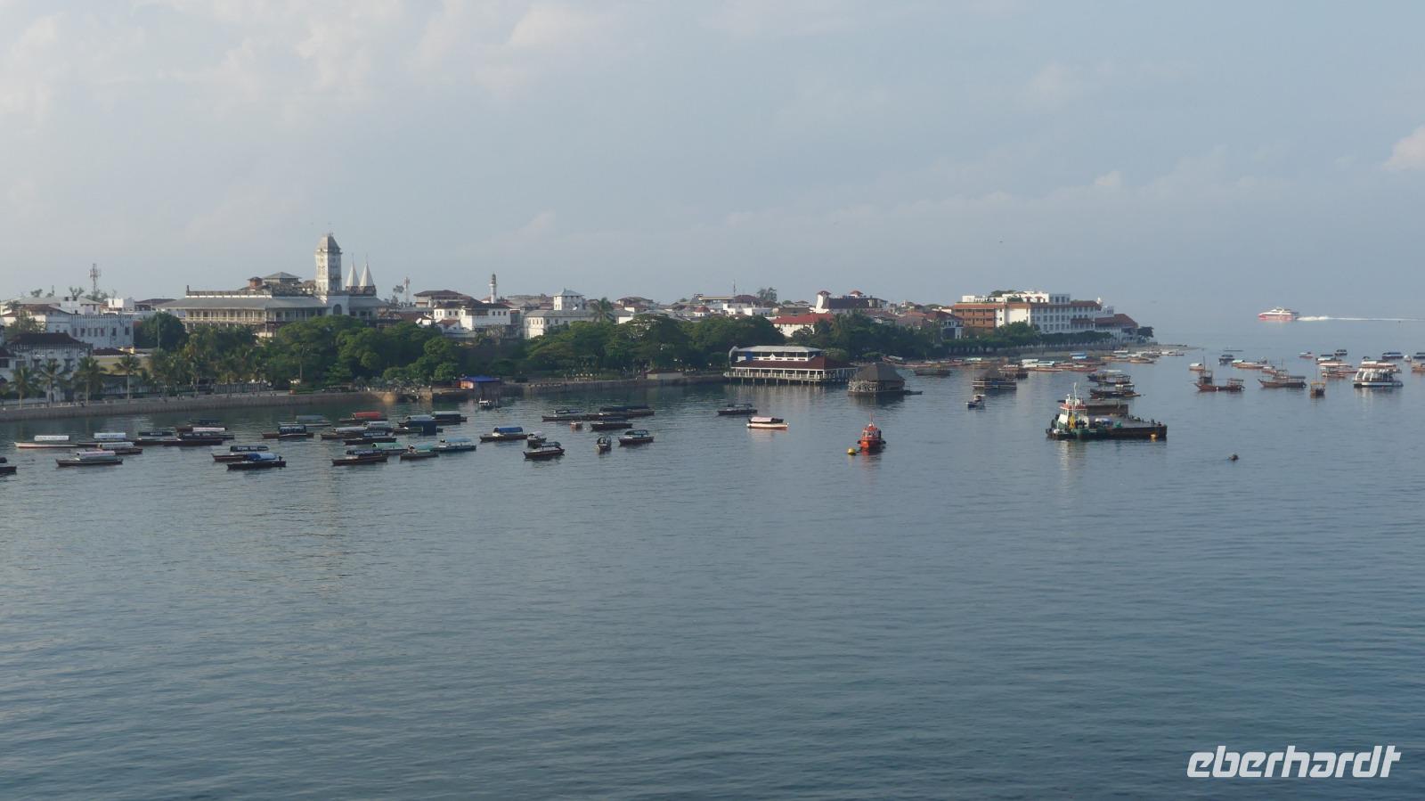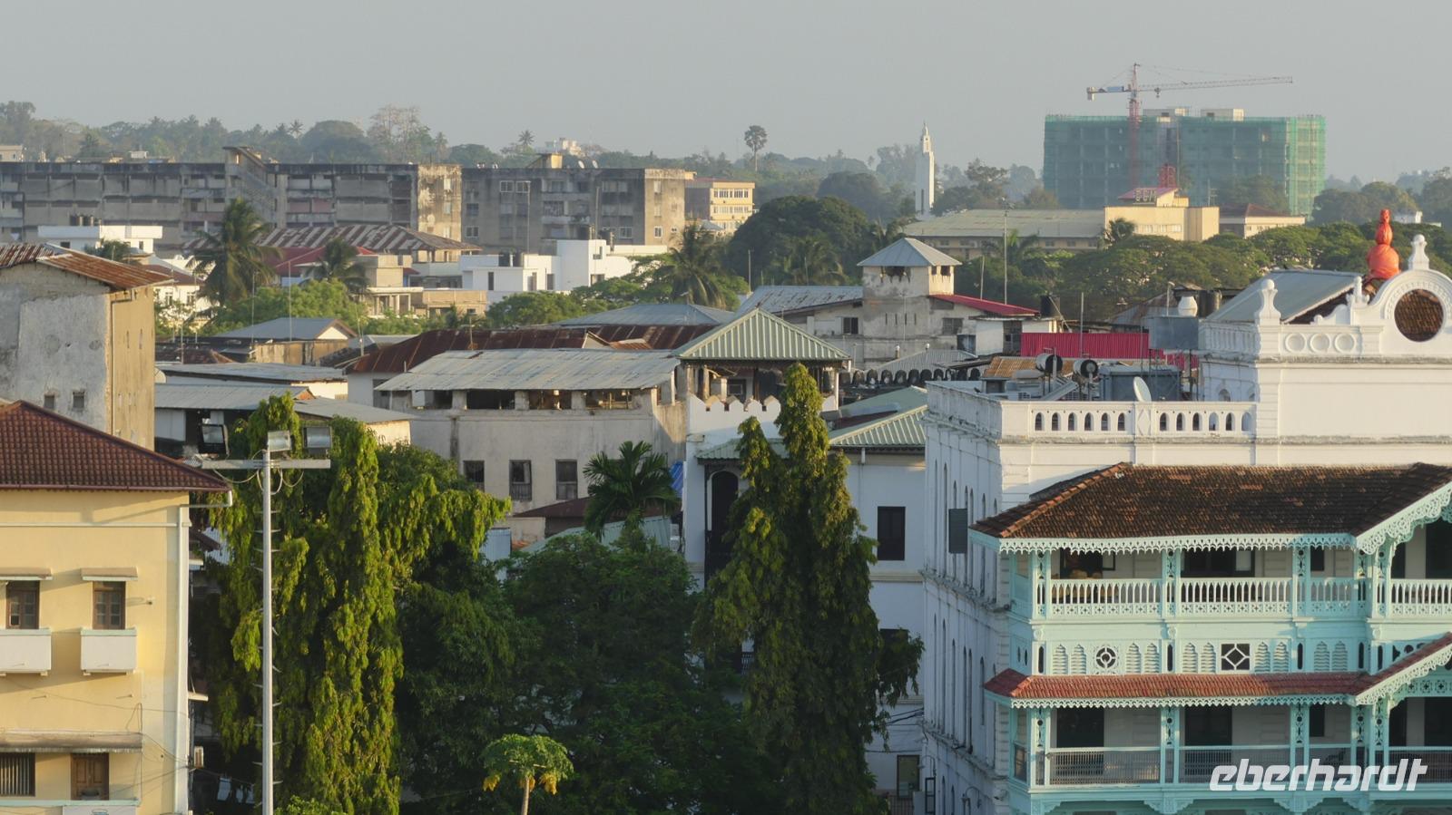 Pünktlich mit der untergehenden Sonne legt die MS Albatros ab. Im Abendlicht haben wir zum Abschied nochmal einen schönen Blick auf Stone Town. Beim näheren Hinschauen entdecken wir in der dahinter liegenden Neustadt die DDR Plattenbauten, ein Relikt der jüngeren Geschichte.
