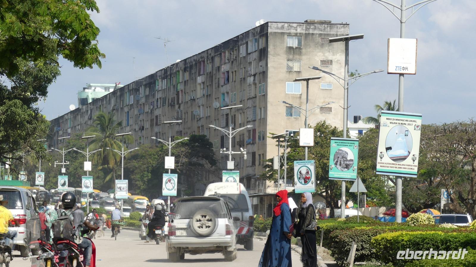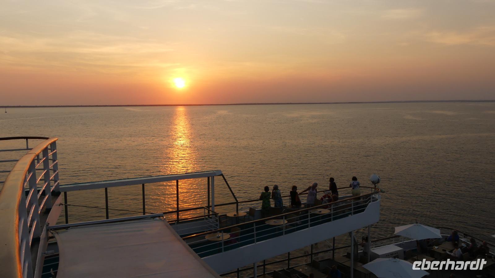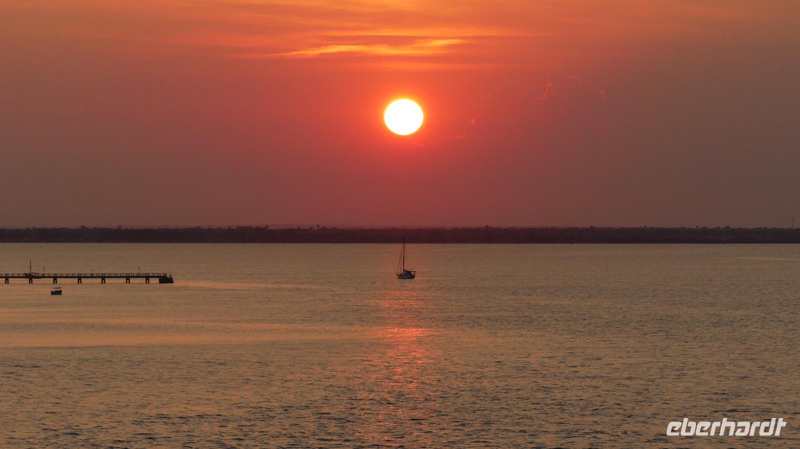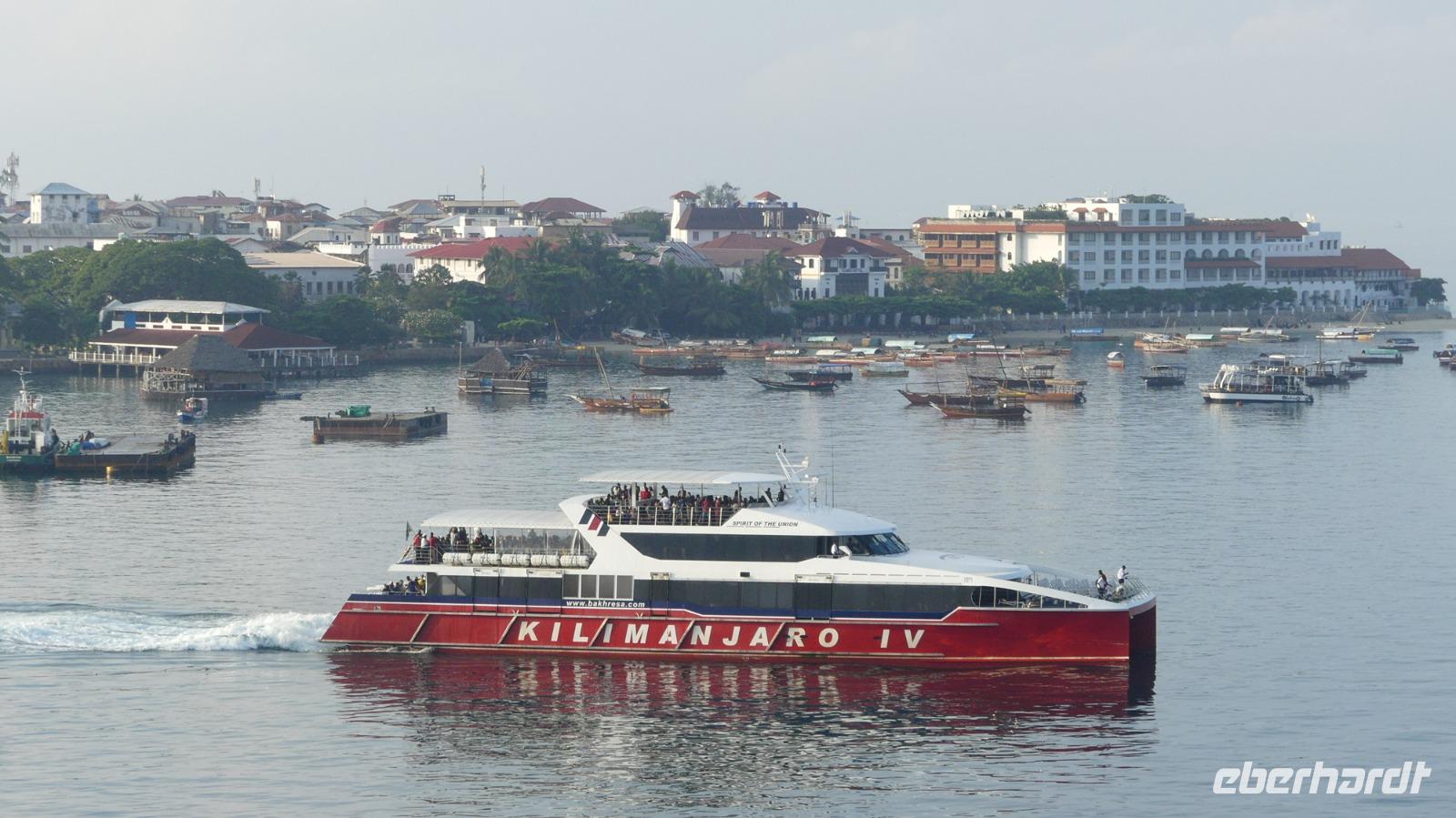 Pünktlich mit der untergehenden Sonne legt die MS Albatros ab. Im Abendlicht haben wir zum Abschied nochmal einen schönen Blick auf Stone Town. Beim näheren Hinschauen entdecken wir in der dahinter liegenden Neustadt die DDR Plattenbauten, ein Relikt der jüngeren Geschichte.