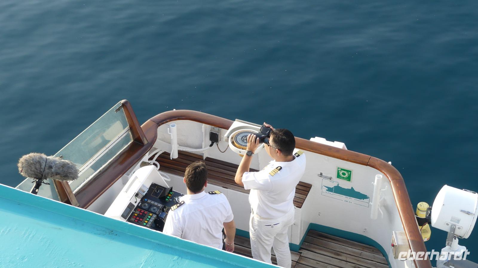 Mittags sind wir wieder an Bord, wo auch unsere Ausflügler aus Stellenbosch zurückkehren. Am Abend absolvieren wir die obligatorische Seenotrettungsübung. Da sich die Rückkehr eines Tagesausflugs verzögert hat, laufen wir auch später aus. Kurz vor 20.00 Uhr heißt es dann endlich „Leinen los".