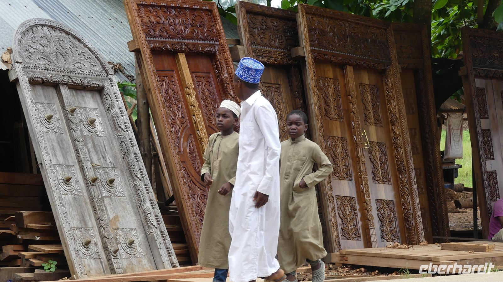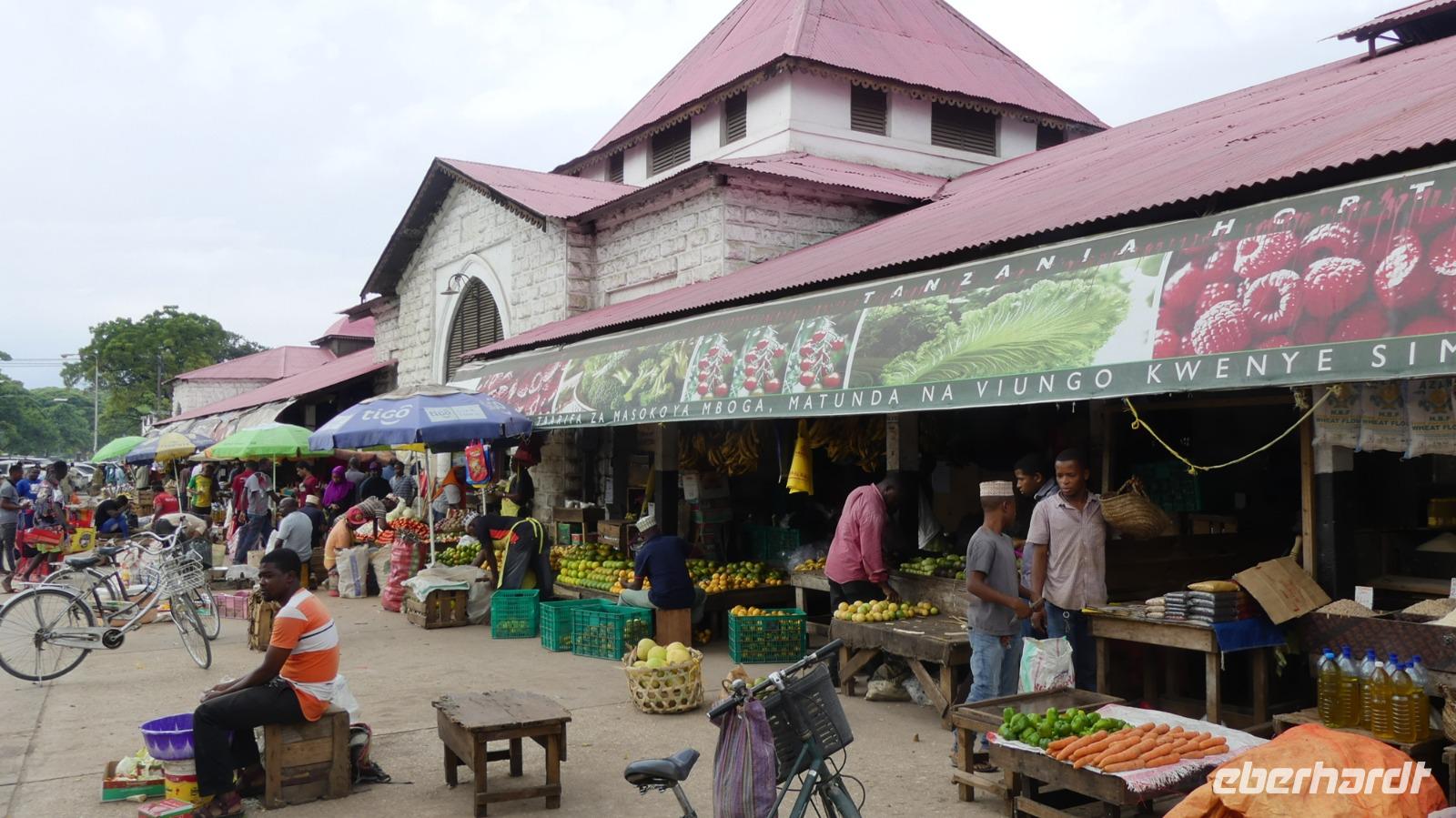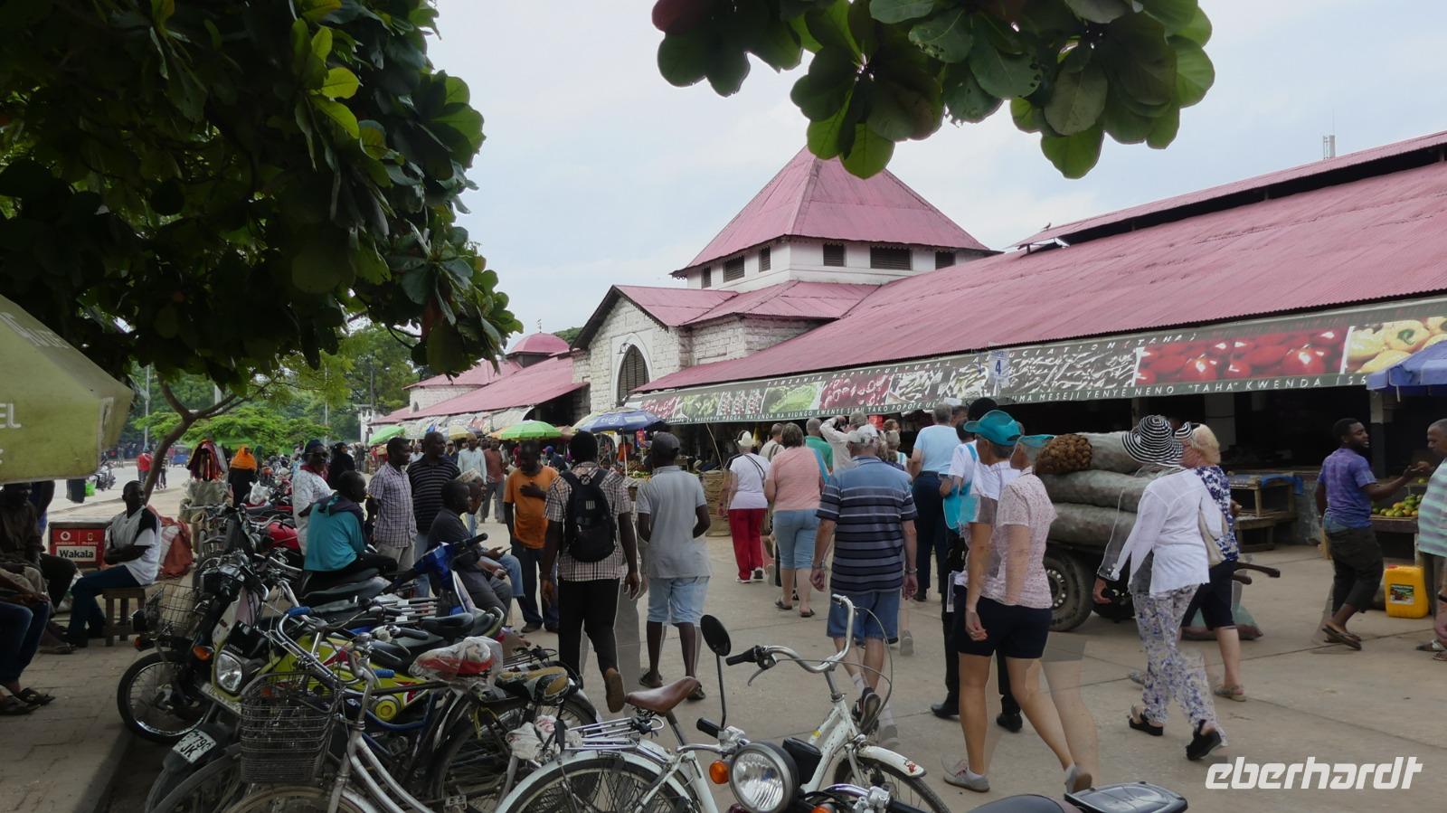 Am Darajani Markt tauchen wir in das quirlige Marktreiben ein. Die schwüle Luft mischt sich mit Gerüchen der Obst-, Gewürz-, Fleisch- und Fischstände. Durch das Gassengewirr gelangen wir zur Anglikanischen Kirche wo sich einst der Sklavenmarkt befand. Die Katakomben, wo Sklaven im 19. Jahrhundert auf engsten Raum bis zu ihrem Verkauf ausharren mussten, sind Relikte dieses dunklen Kapitels der Inselgeschichte. Bei einem Rundgang an der Strandpromenade sehen wir die schon erwähnten historischen Bauten wie den Sultanspalast und die alte Festung. Auch am ersten deutschen Konsulat und dem Geburtshaus von Freddy Mercury kommen wir vorbei. Je nach Interesse schließen sich an die Stadtbesichtigung verschiedene Ausflugsziele an. So werden außerhalb von Stone Town zum Beispiel der Norden Sansibars mit Nungwi angesteuert, andere fahren auf eine Gewürzfarm oder zur Badeinsel Prison Island. Gäste, die mit mir kommen, fahren durch den zentralen Teil der Insel. Bei Dunga schauen wir Holzschnitzern über die Schultern. Sie fertigen die berühmten, reich verzierten Sansibar Türen an. Und auf einer Gewürzfarm gibt es eine reichliche Auswahl von Nelken über Muskat bis Zimt.