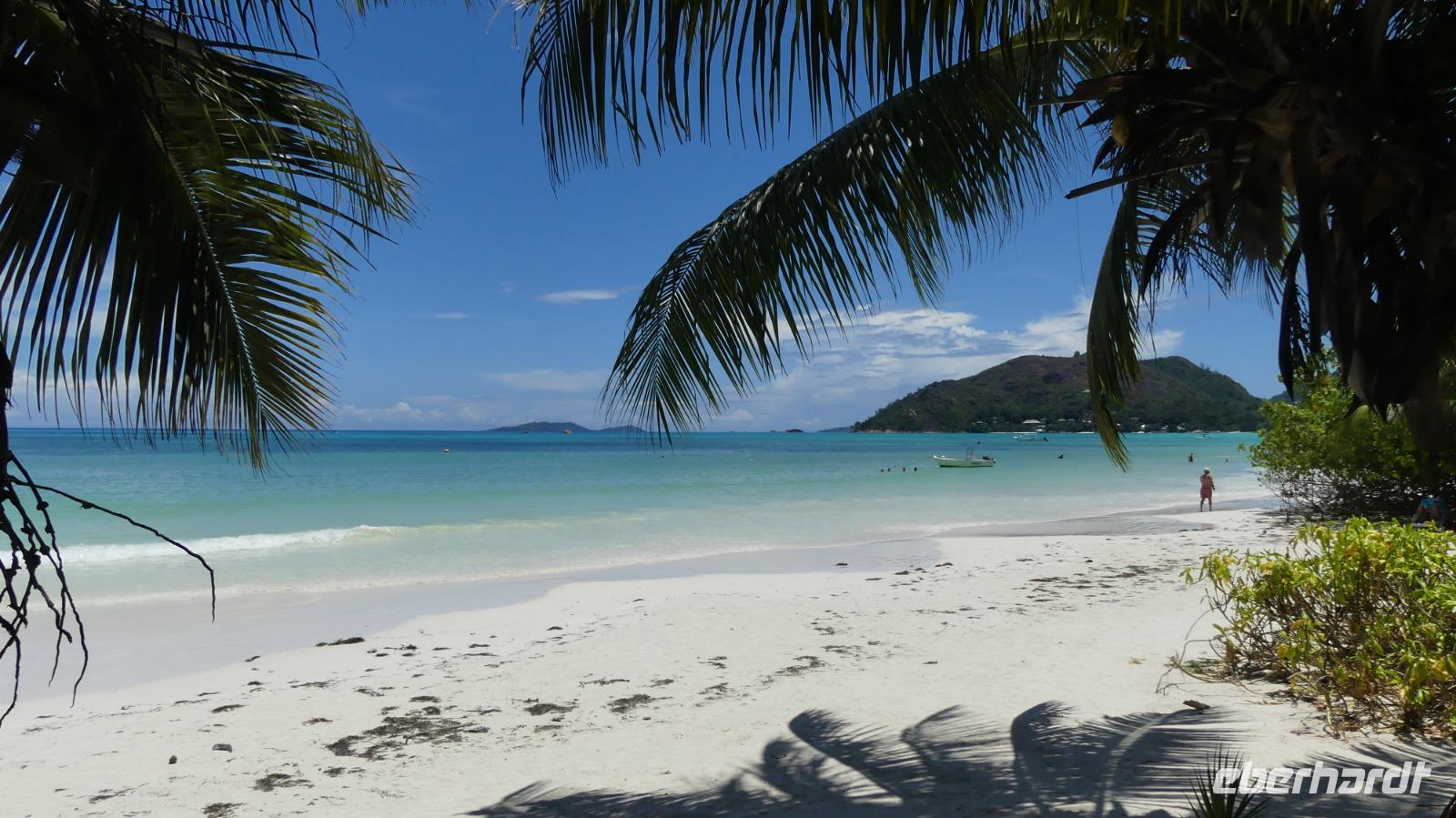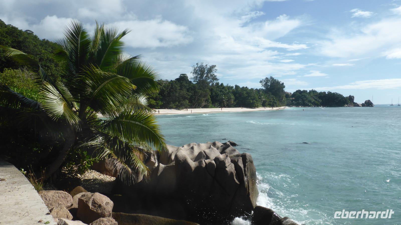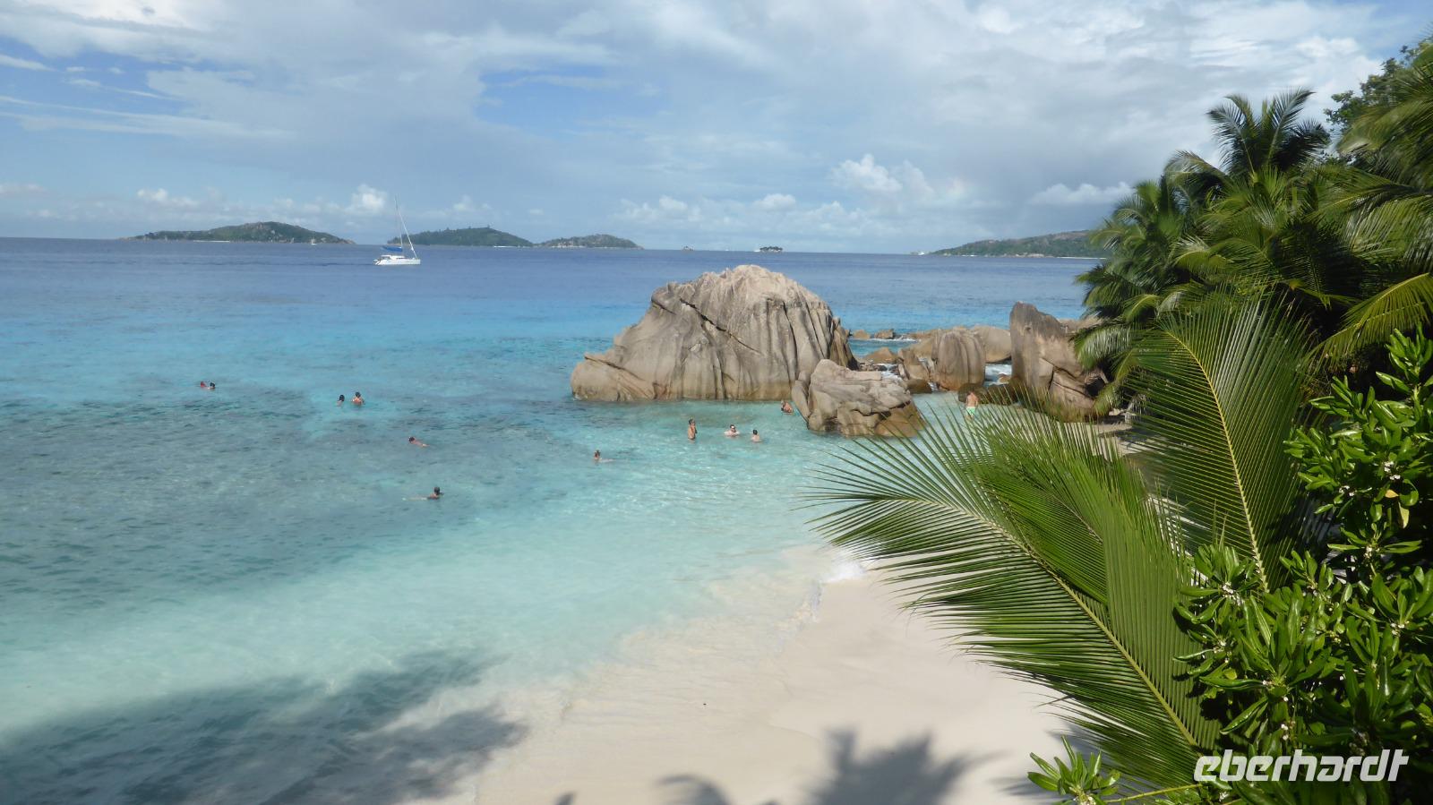 Während unseres Rundganges durch das Vallée de Mai zeigen sich die ersten Sonnenstrahlen - also noch rechtzeitig für den sich anschließenden Strandbesuch. Der Strand befindet sich an der Côte d'Or, der Nordküste Praslins. An diesem Küstenstreifen haben wir Gelegenheit am Strand Anse Volbert zu baden. Die Bedingungen sind paradiesisch: feiner weißer Korallensand, 28 Grad Wassertemperatur, tropische Vegetation mit Kokospalmen, das Meer in verschiedenen Blautönen, weiß-blauer Himmel, lockere Strandatmosphäre ohne lästige Verkäufer...toll!